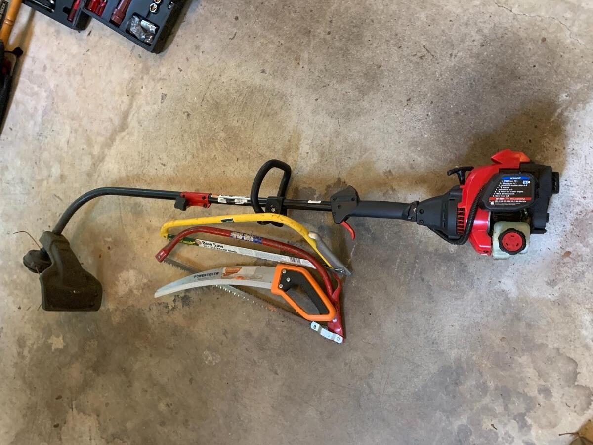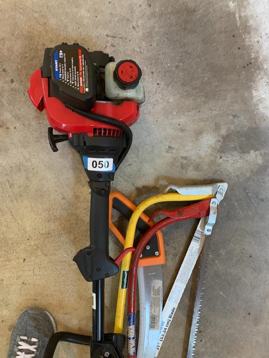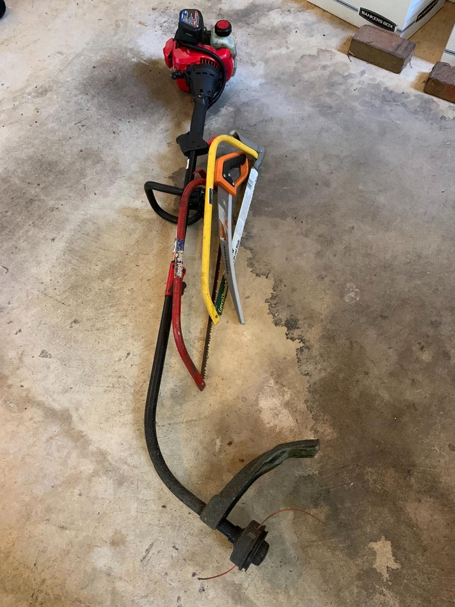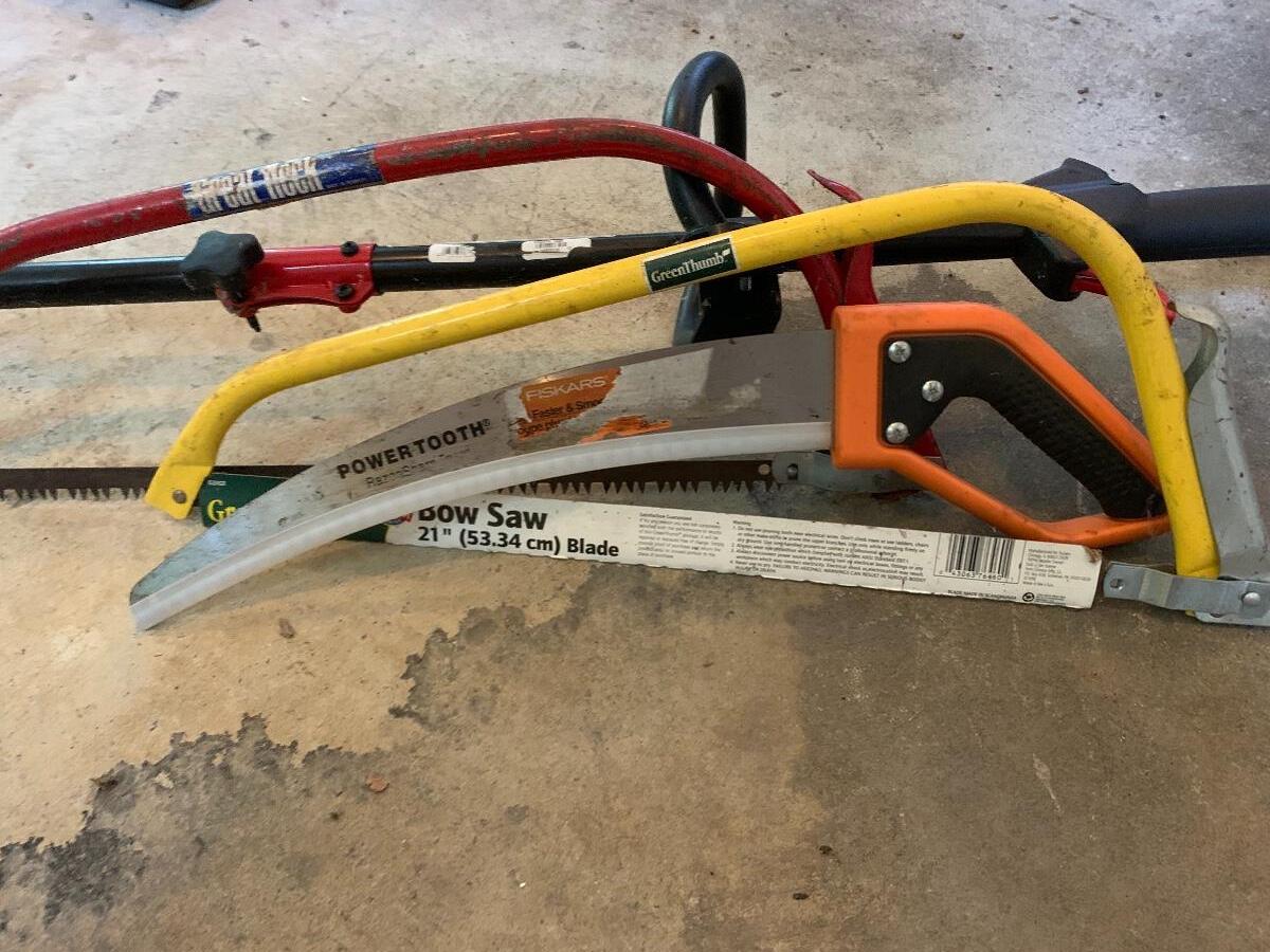 Lot 50: Troy Built Weed Wacker, Bow Saws, Fiskars Power Tooth Saw