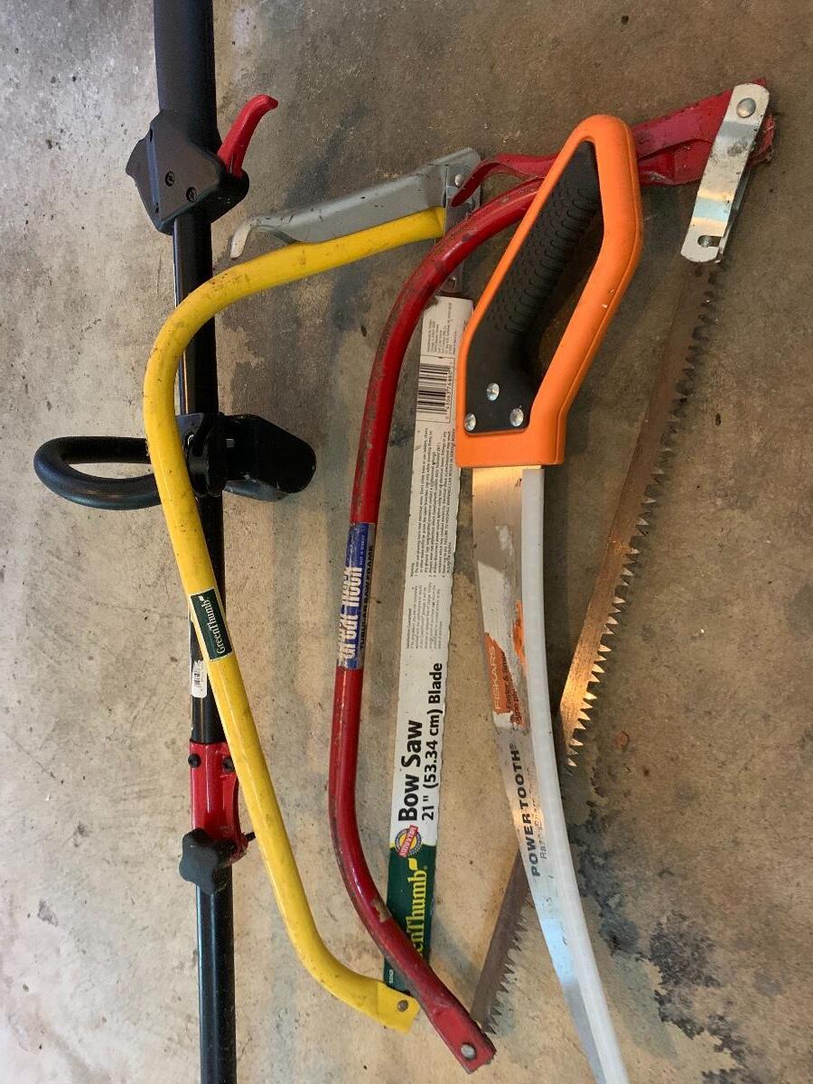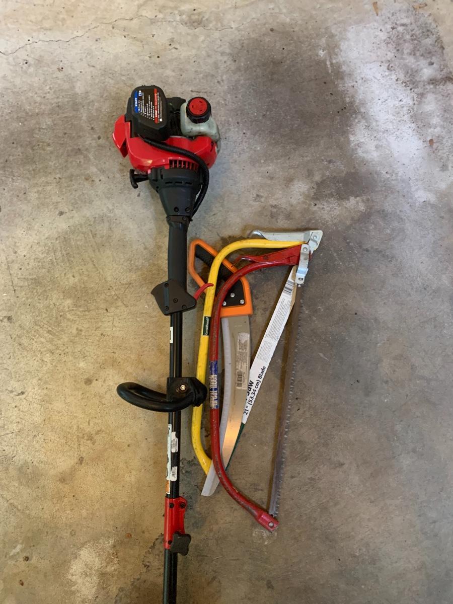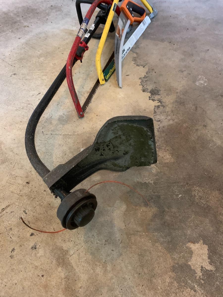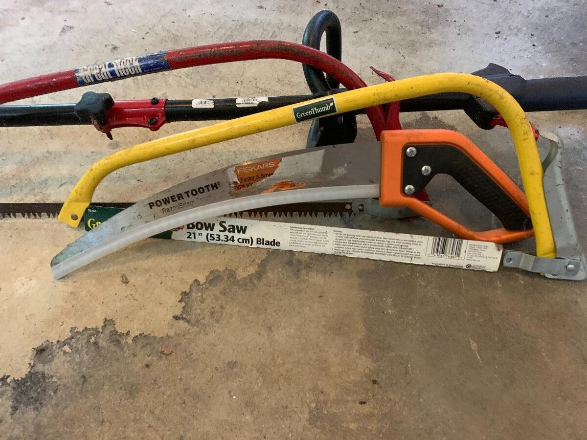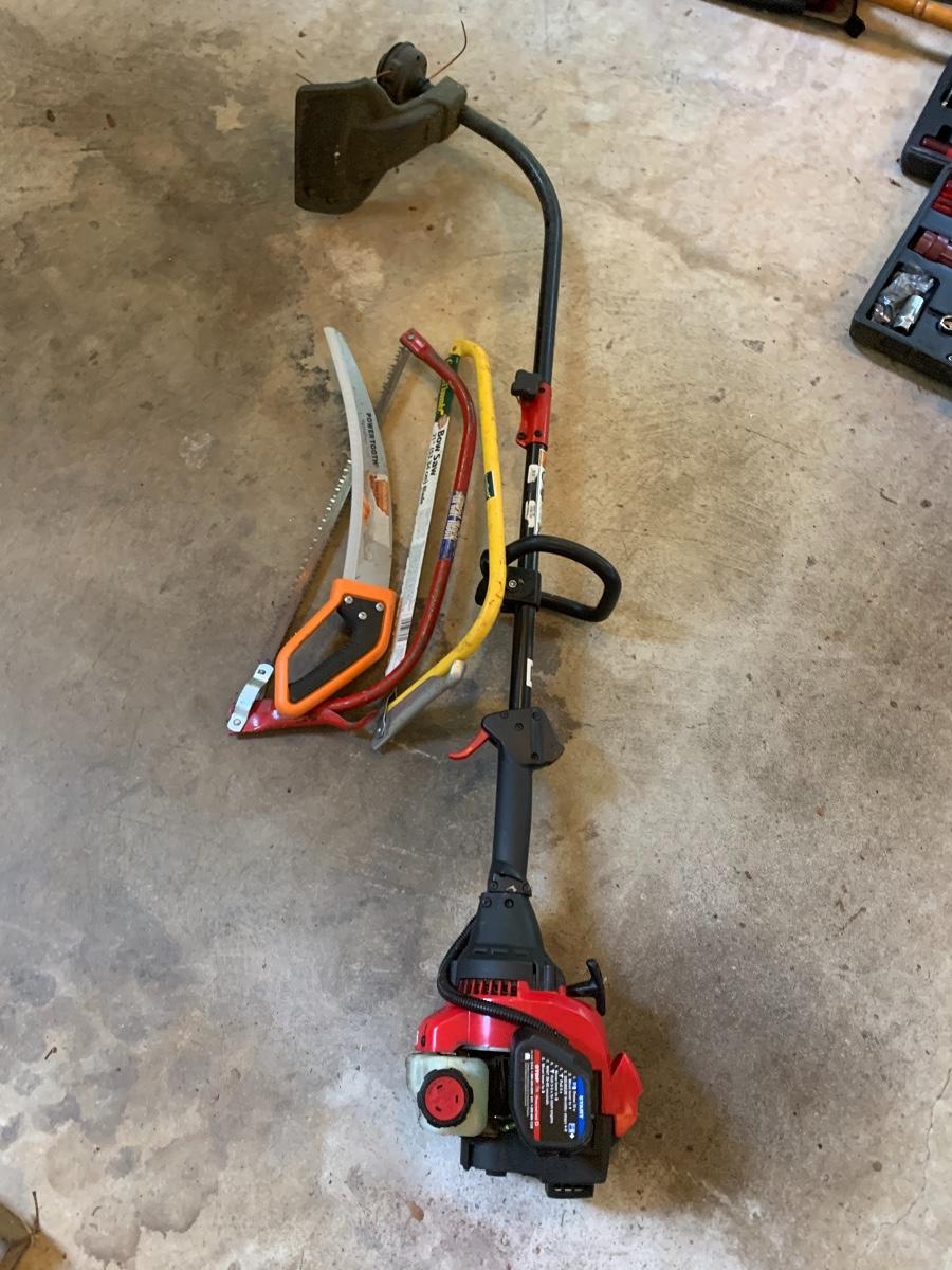 Lot 50: Troy Built Weed Wacker, Bow Saws, Fiskars Power Tooth Saw