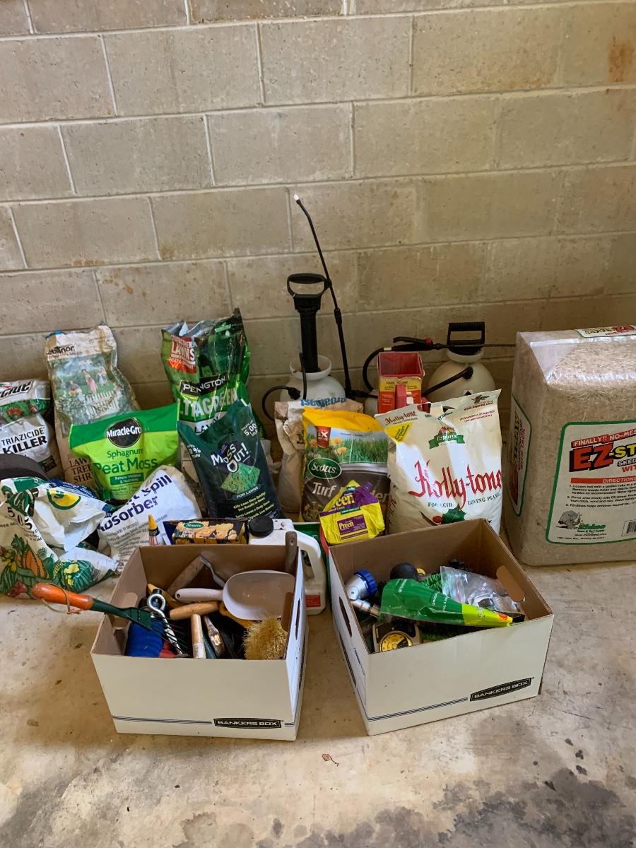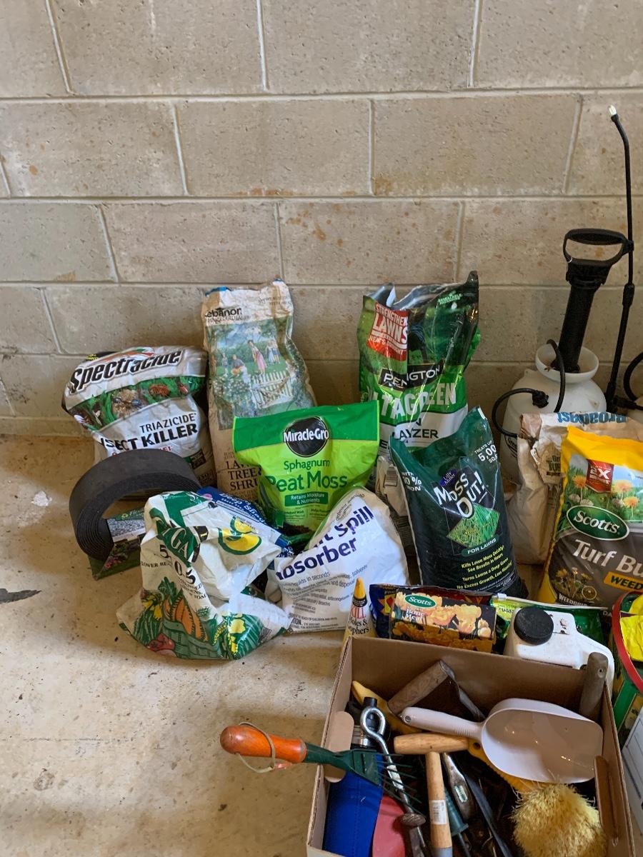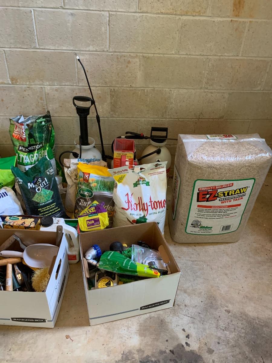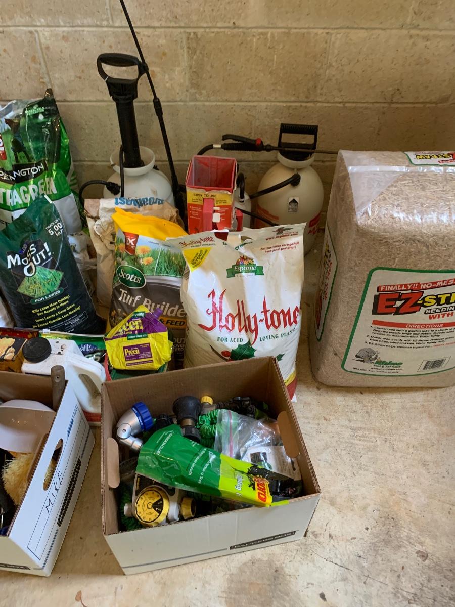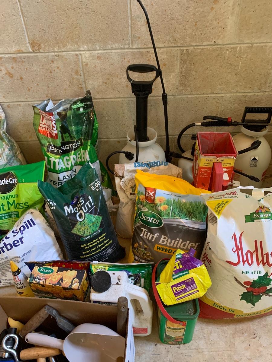 Large lot of lawn care fertilizers, seed, weed killer sprayers and more