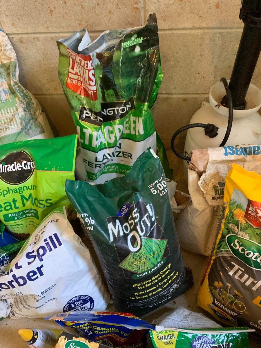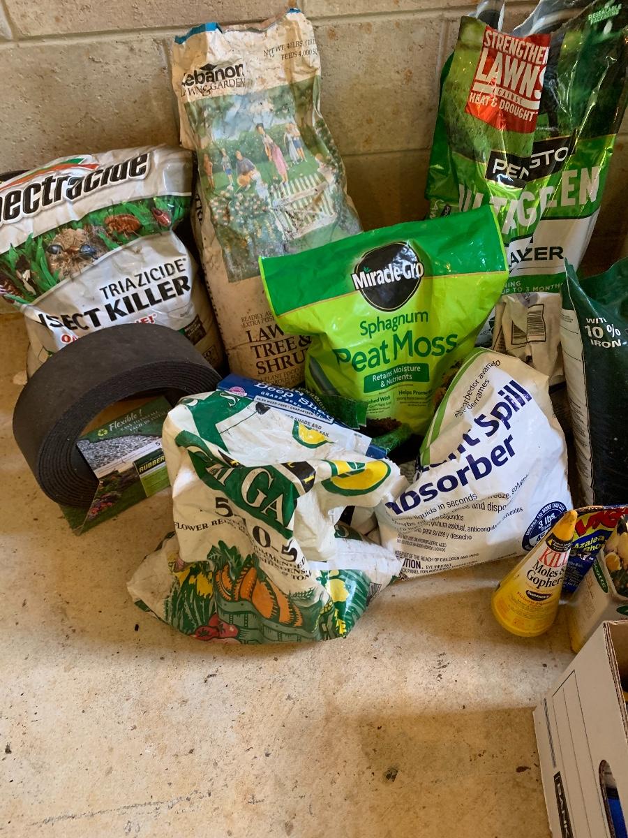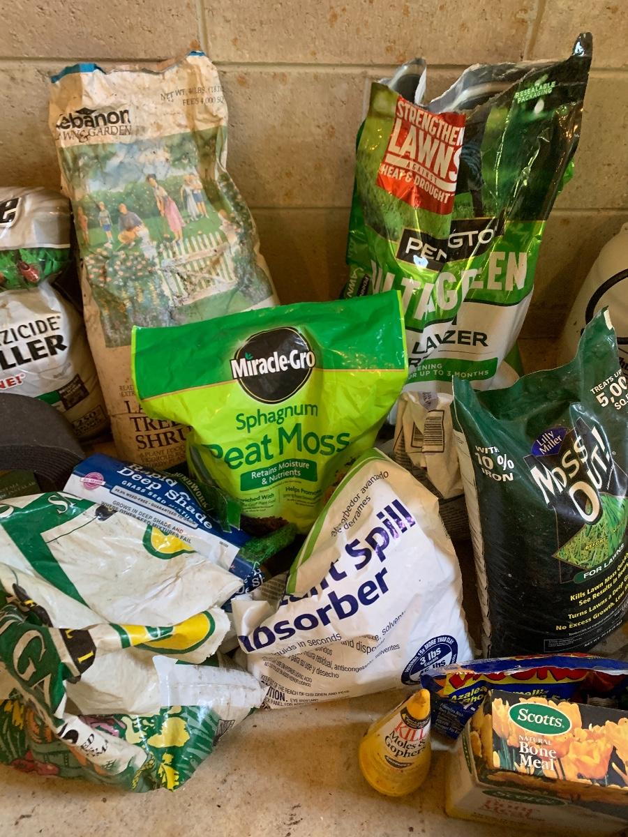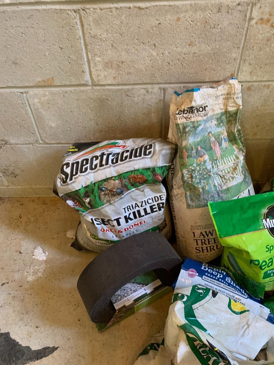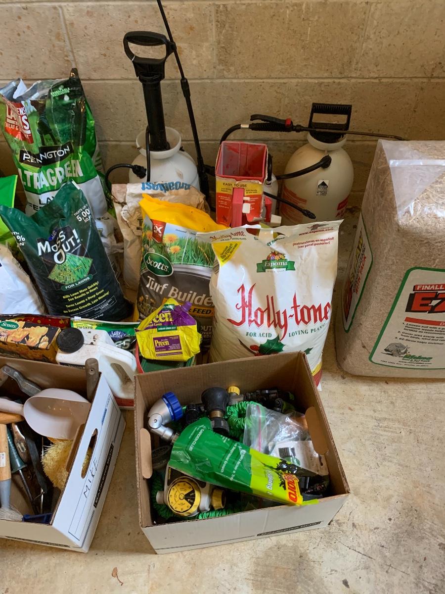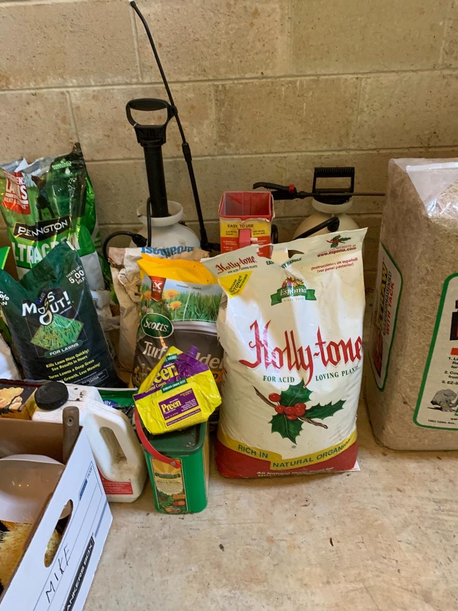 Large lot of lawn care fertilizers, seed, weed killer sprayers and more