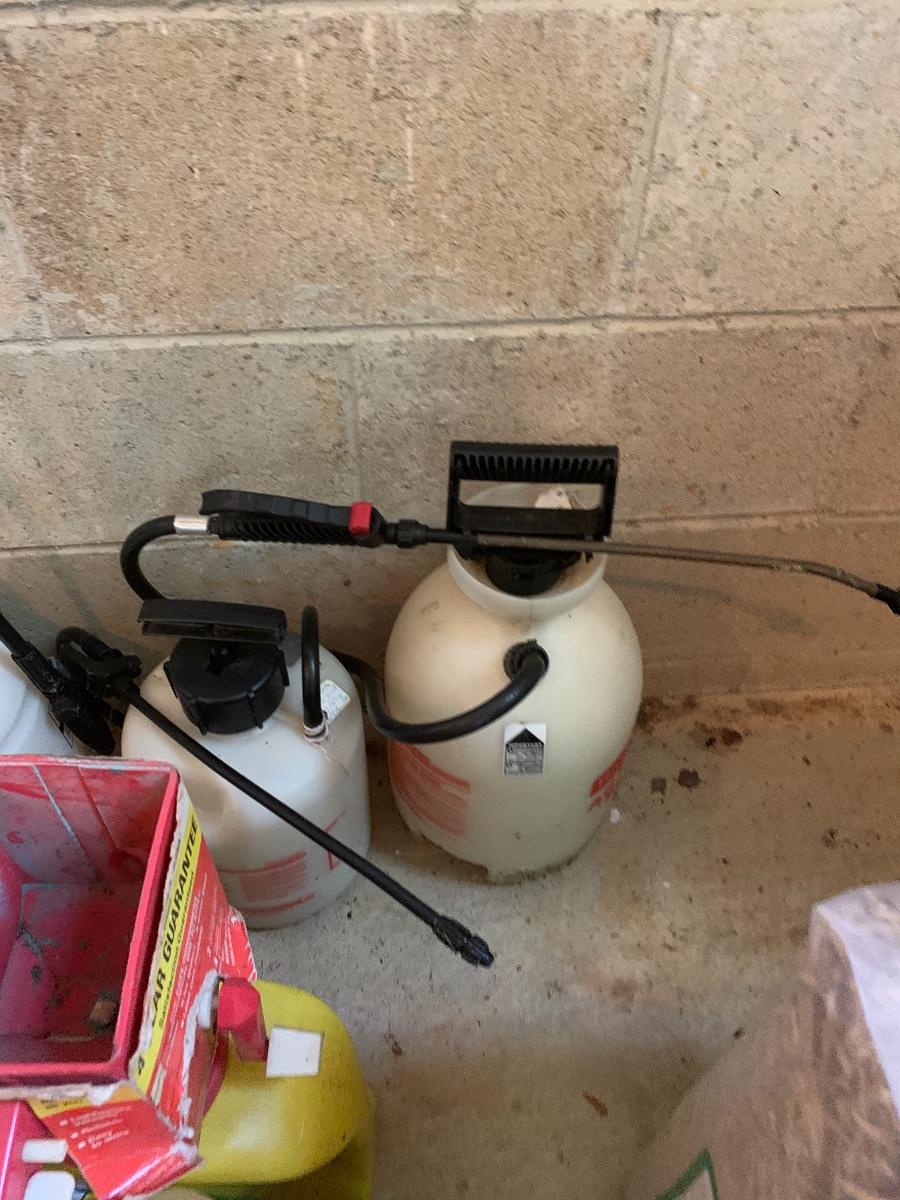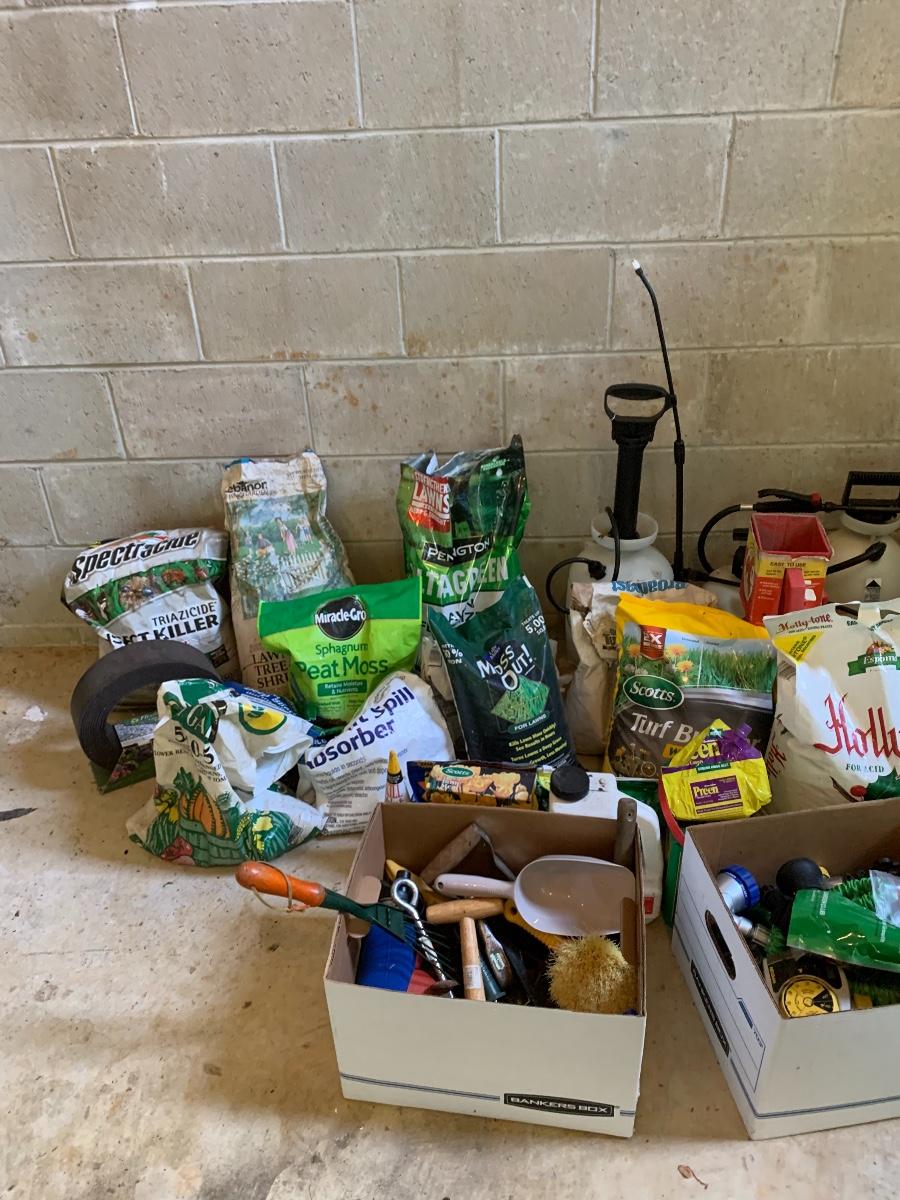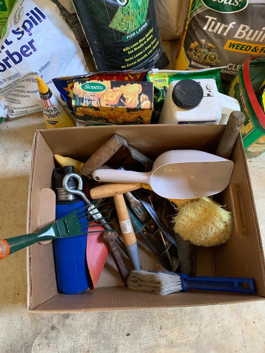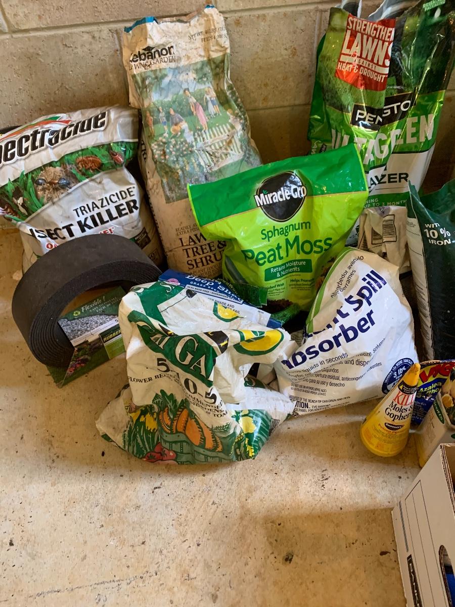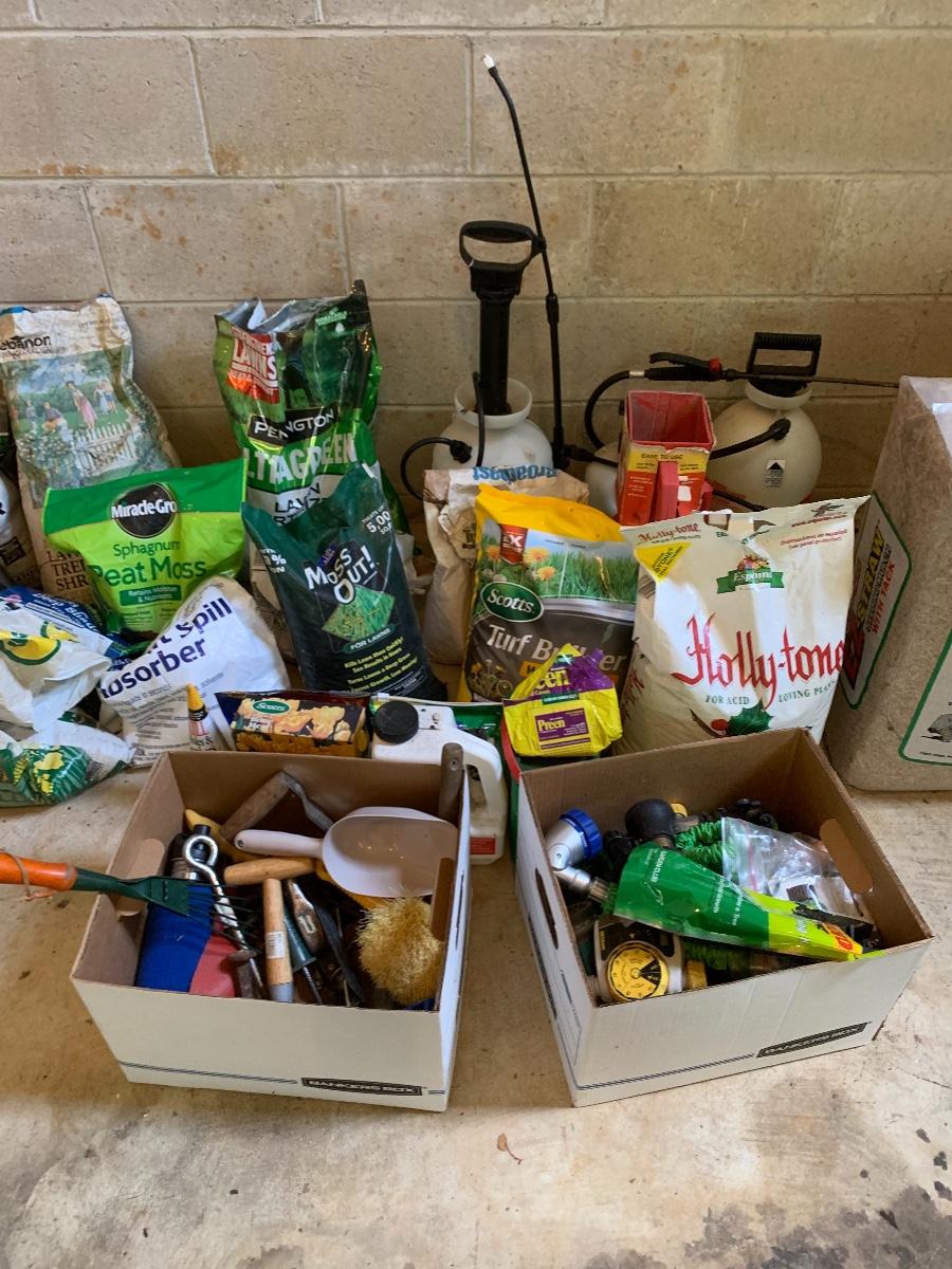 Large lot of lawn care fertilizers, seed, weed killer sprayers and more