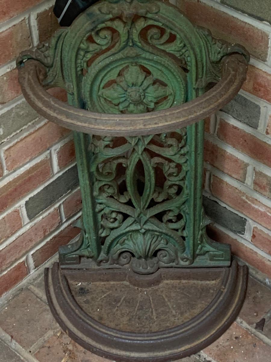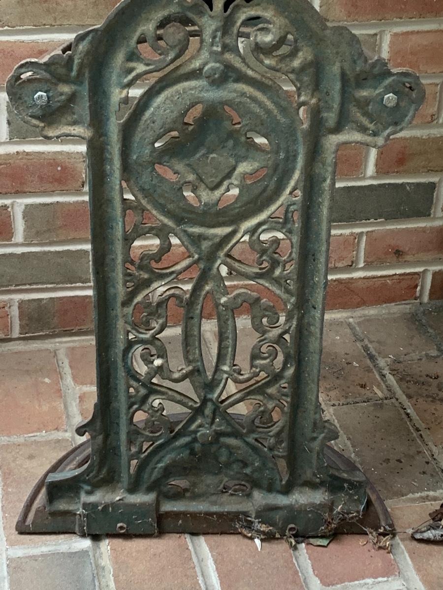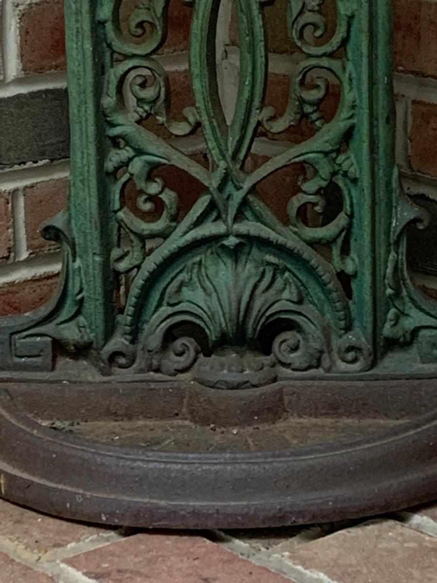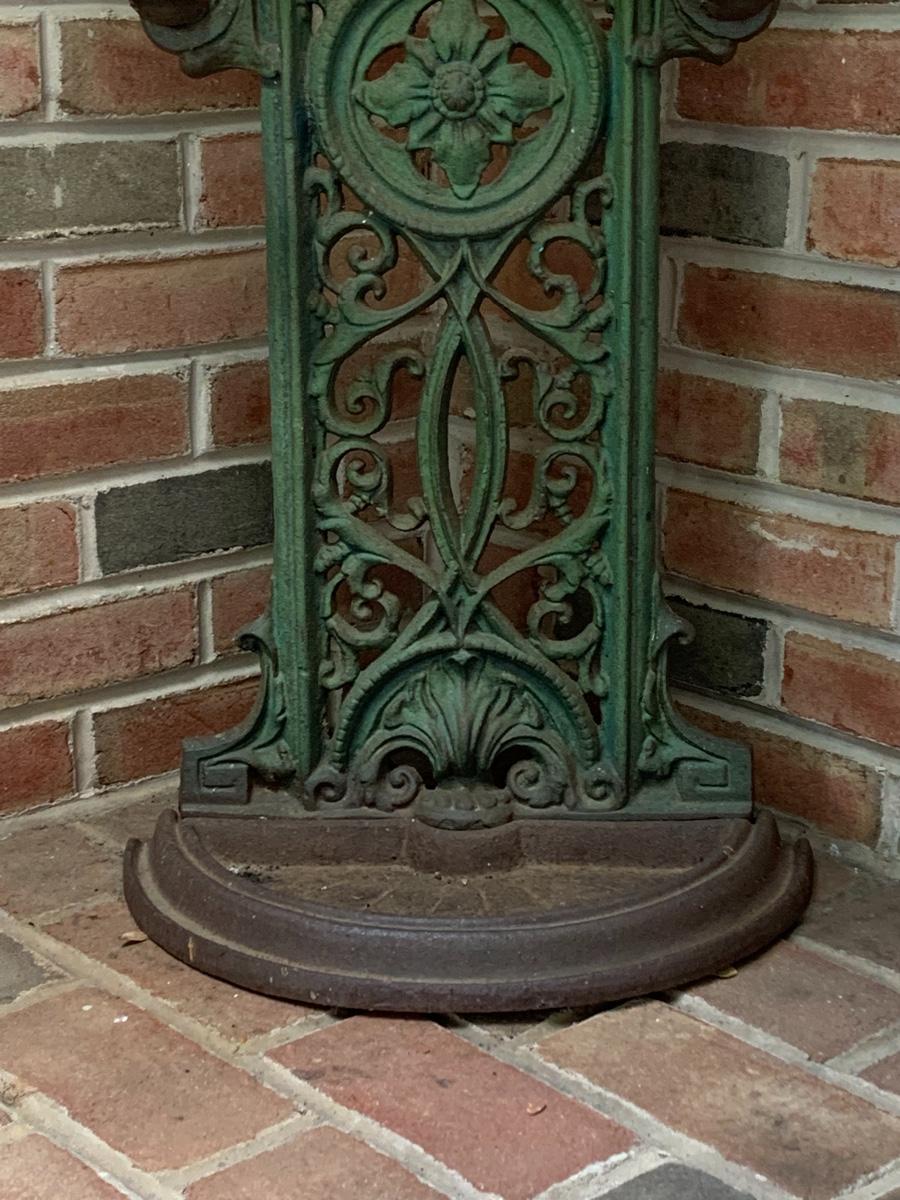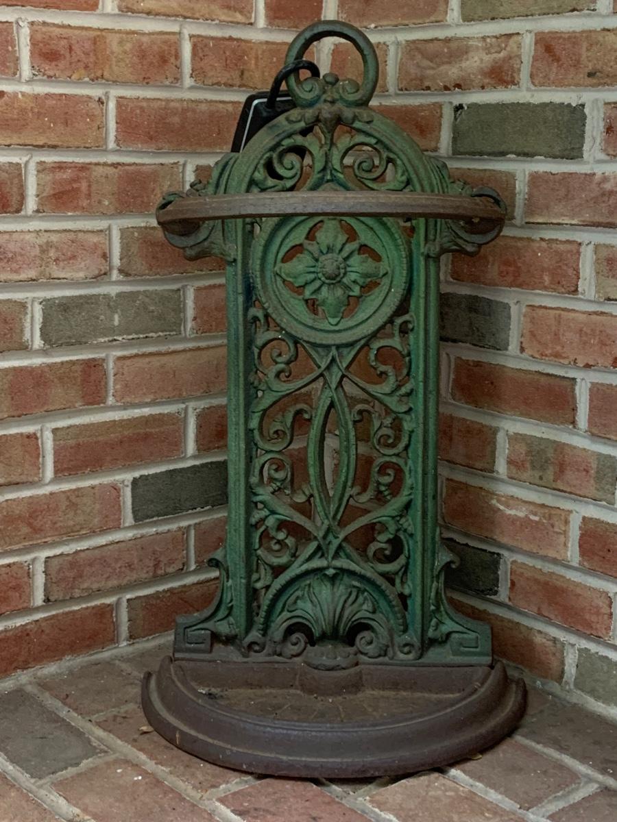 Beautiful ornate cast iron umbrella stand. This has been used on porch and has some rusting.