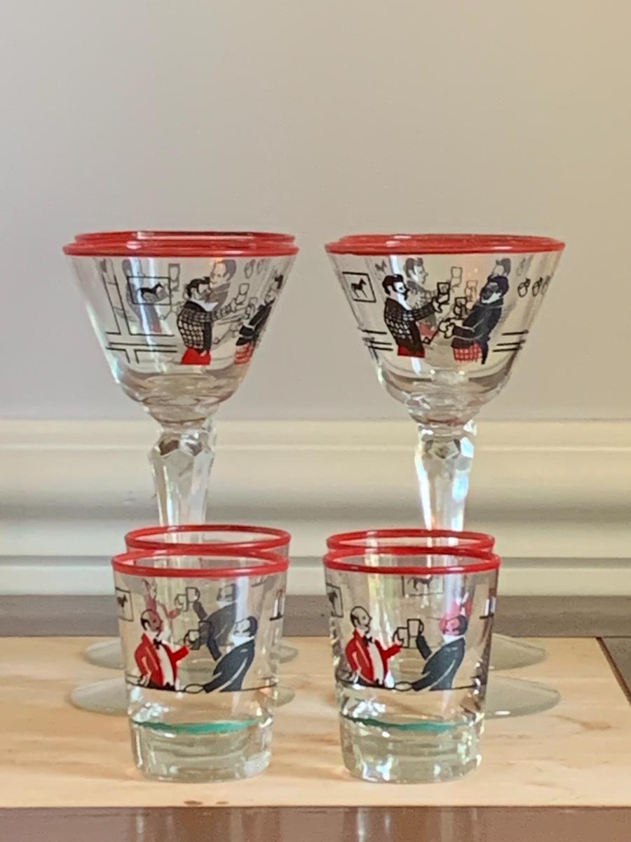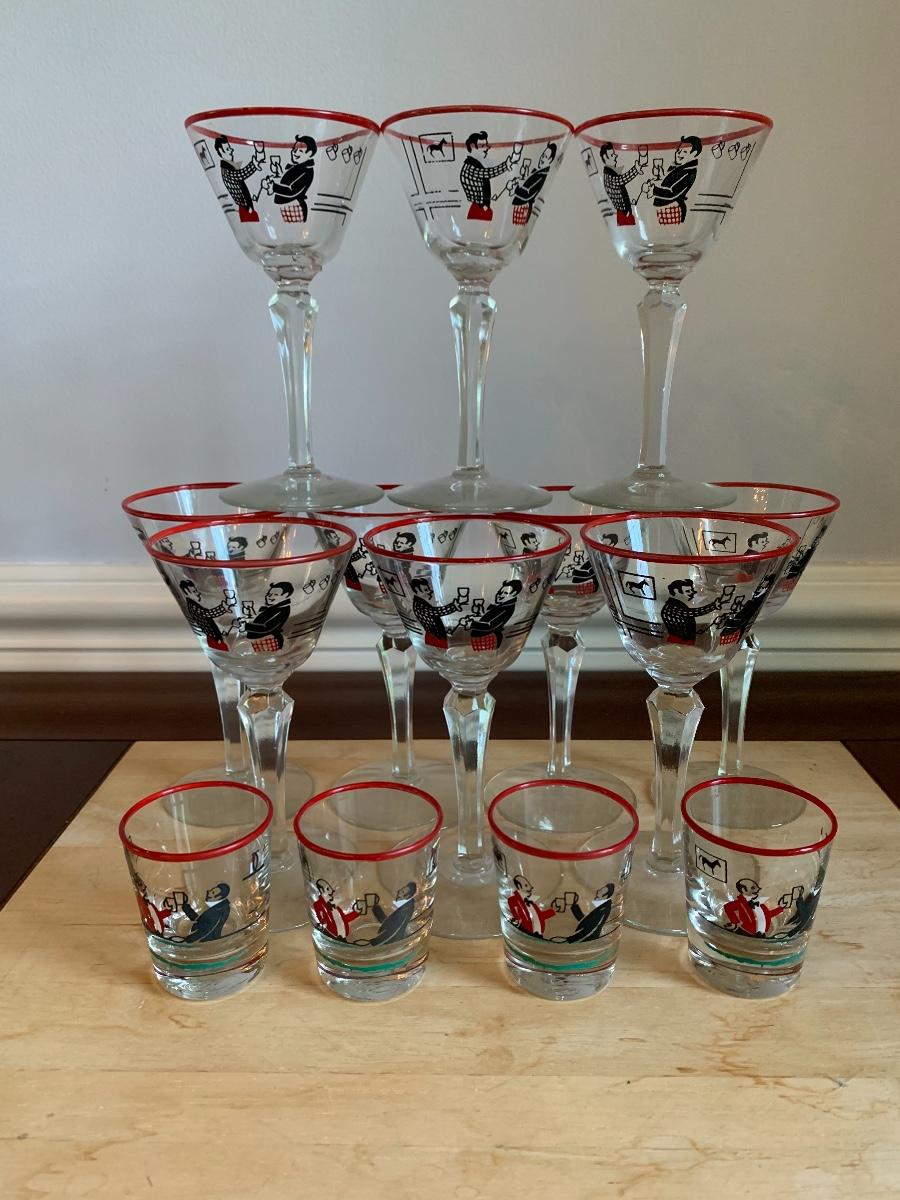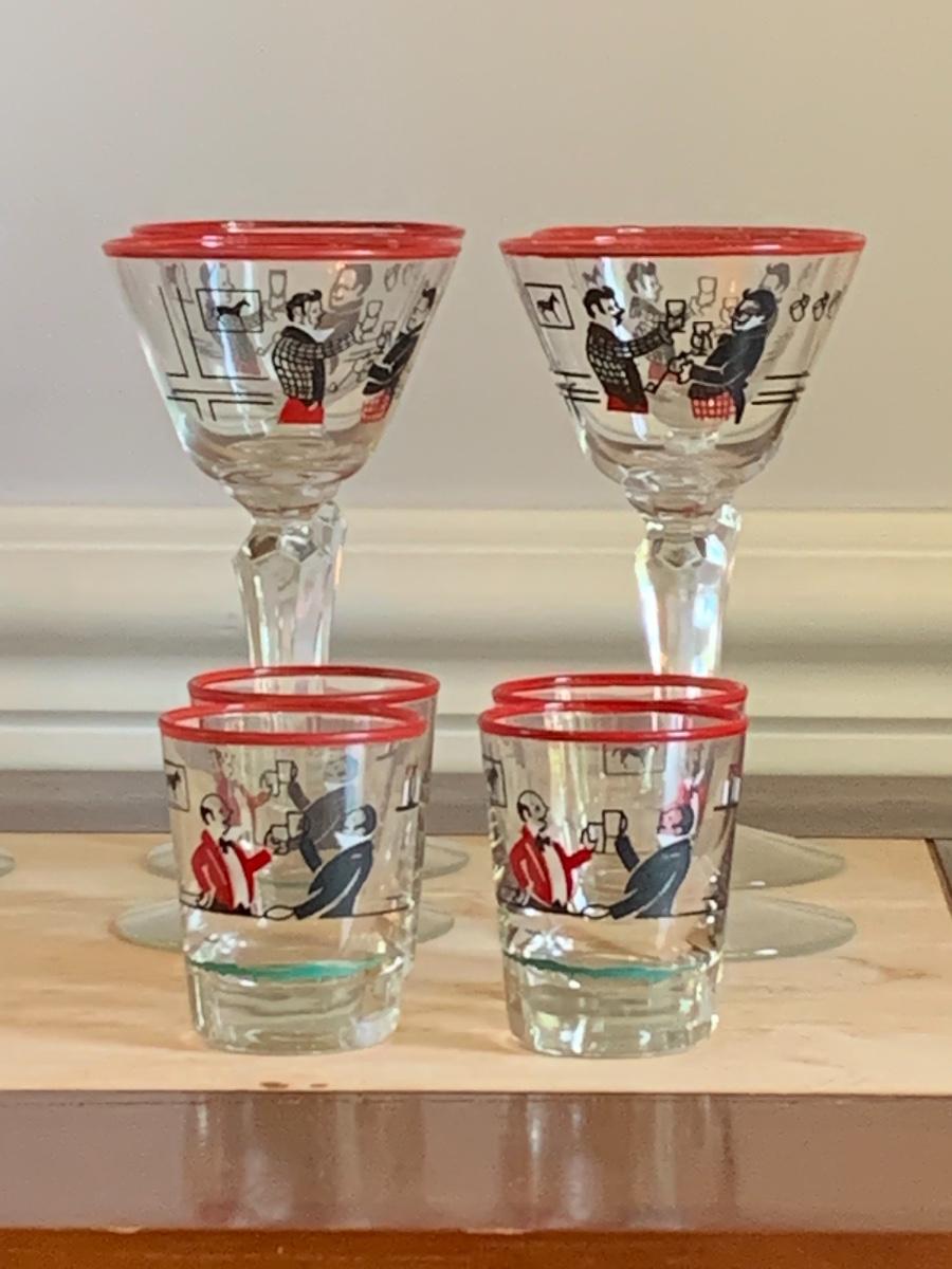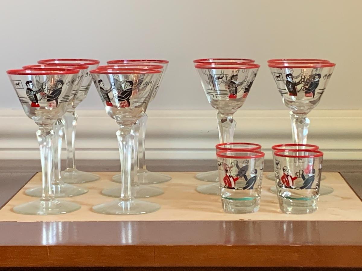 Vintage 1940's Libbey Pickwick Merrymakers Cordial Cocktail Glasses Men Toasting along with matching shot glasses