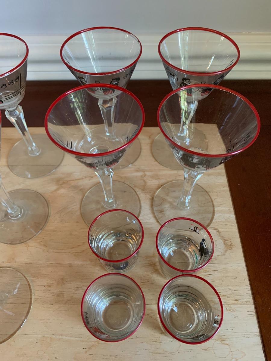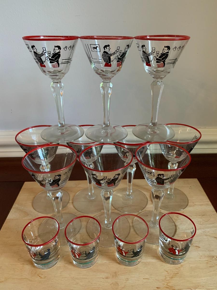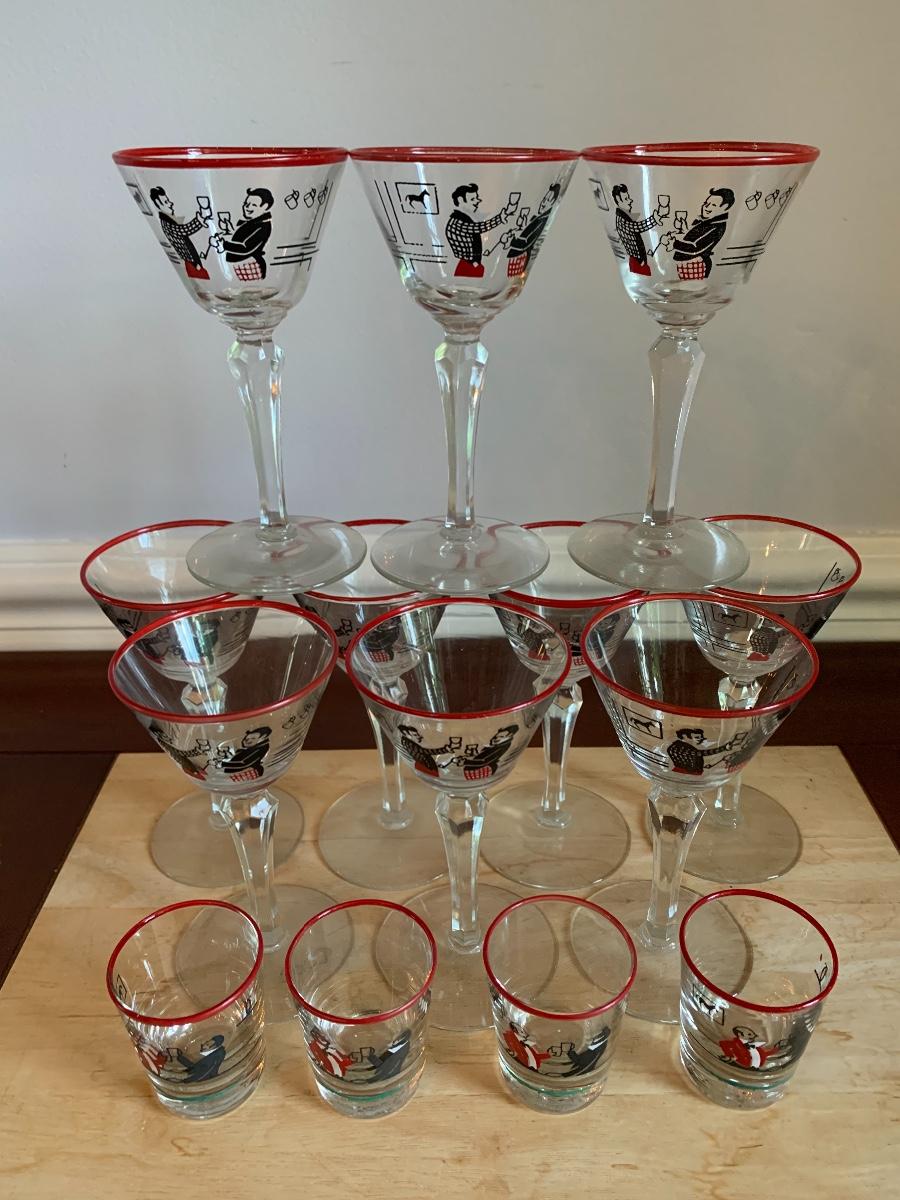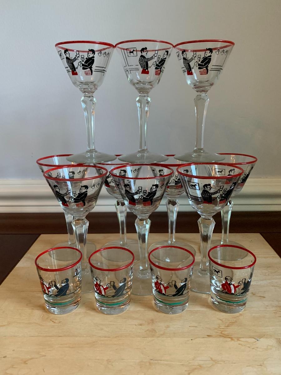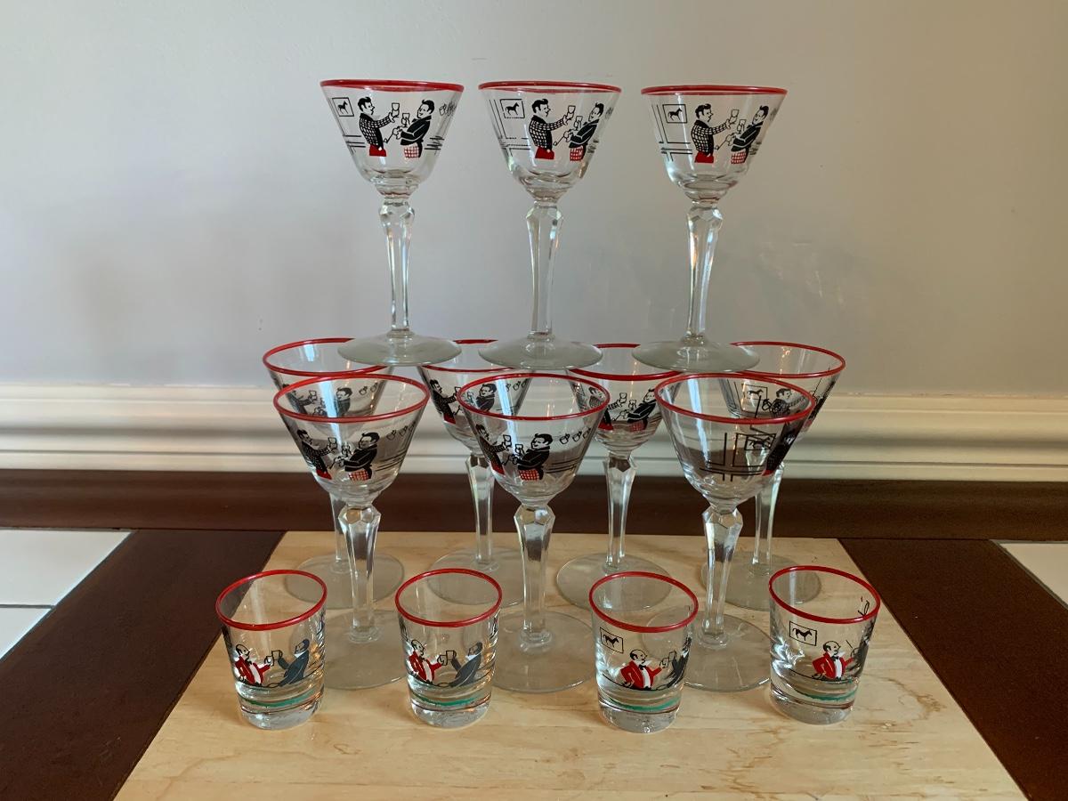 Vintage 1940's Libbey Pickwick Merrymakers Cordial Cocktail Glasses Men Toasting along with matching shot glasses