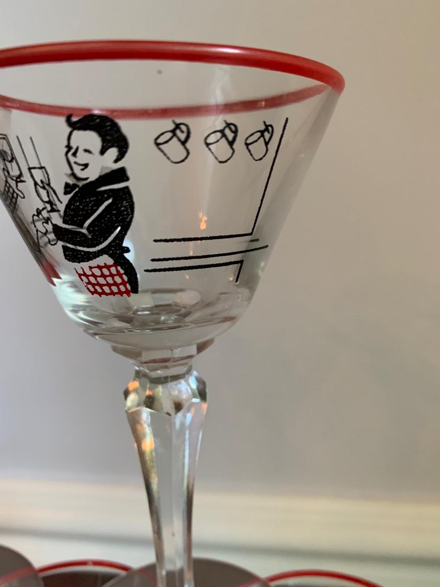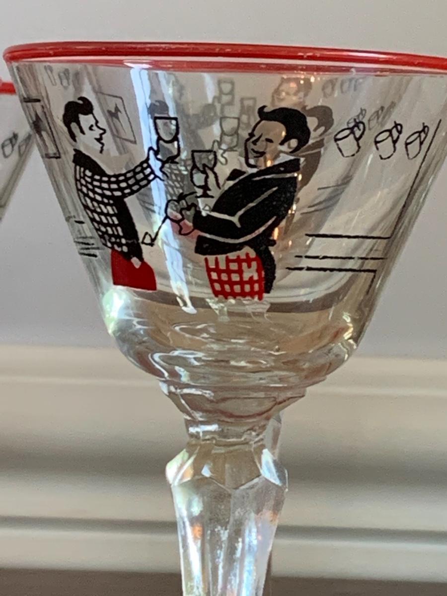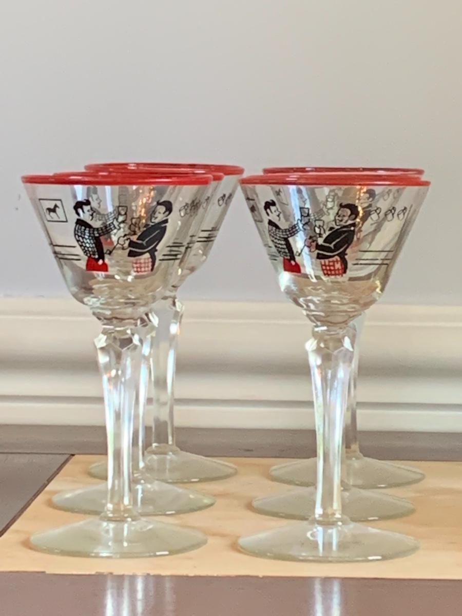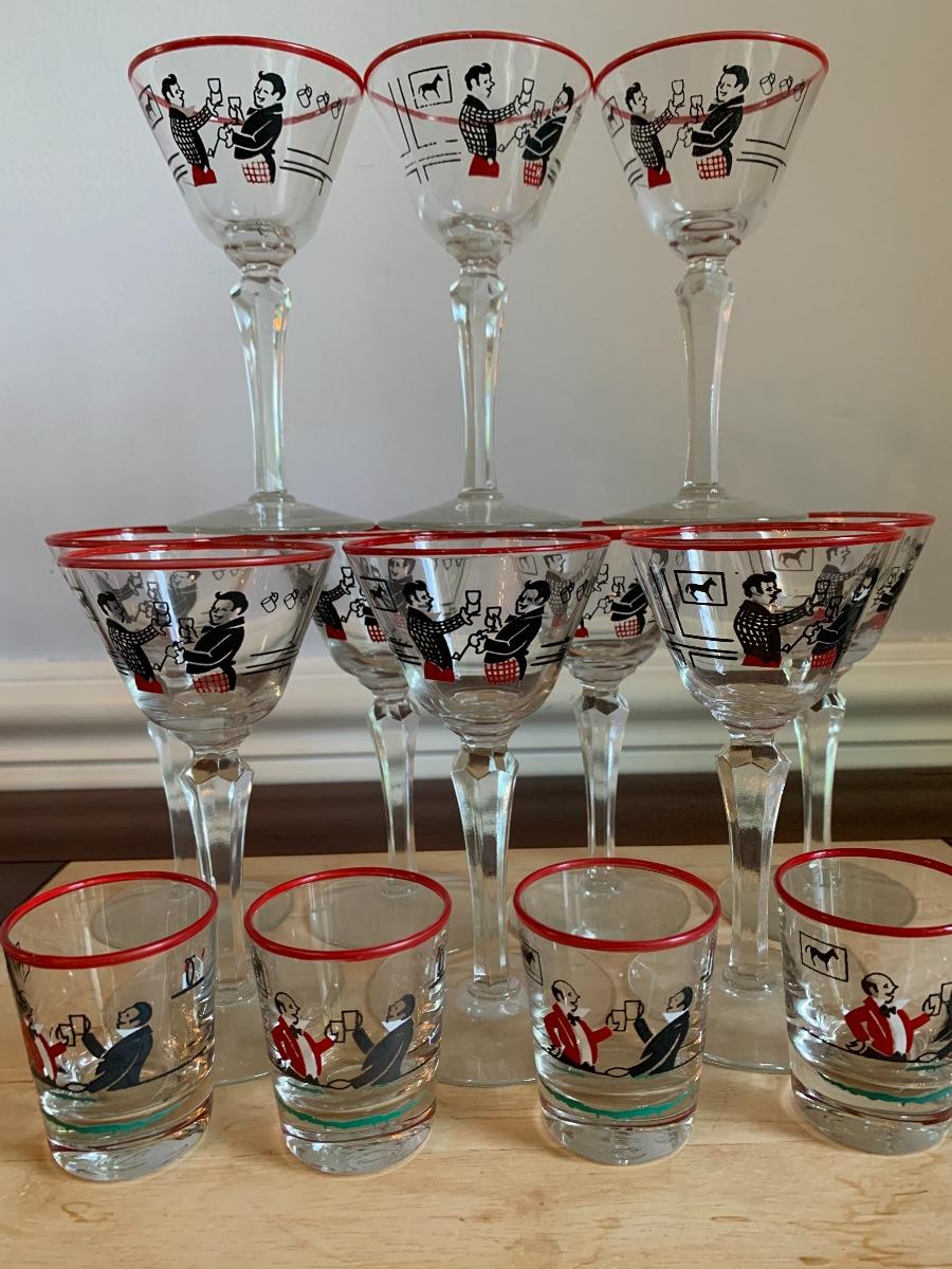 Vintage 1940's Libbey Pickwick Merrymakers Cordial Cocktail Glasses Men Toasting along with matching shot glasses