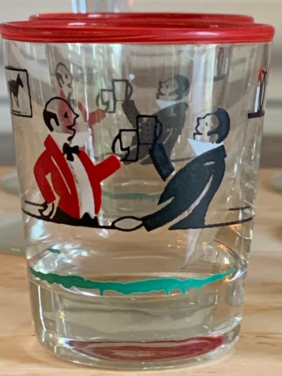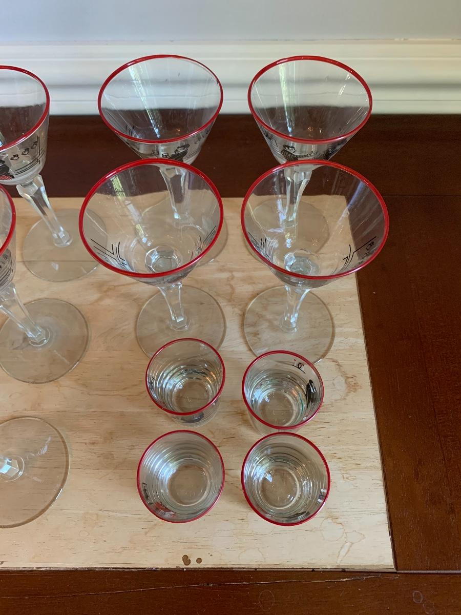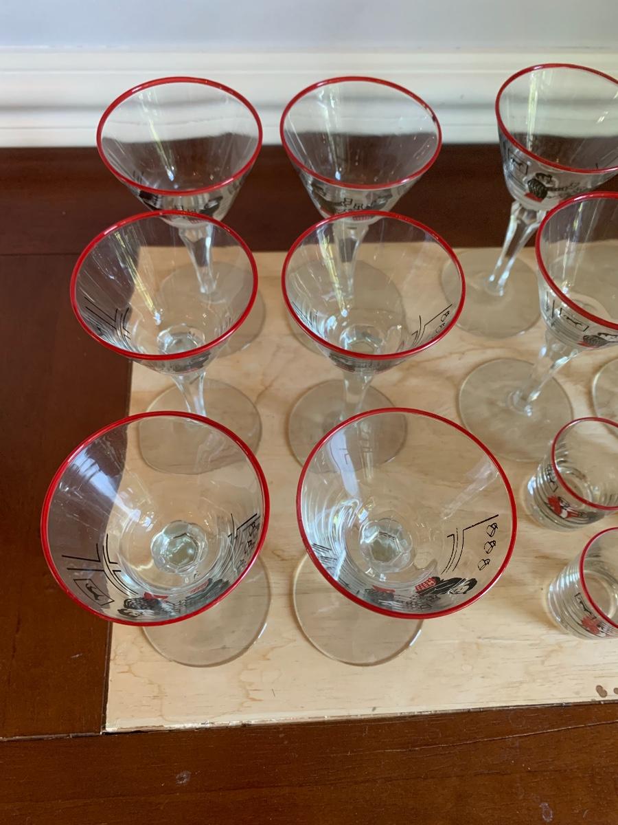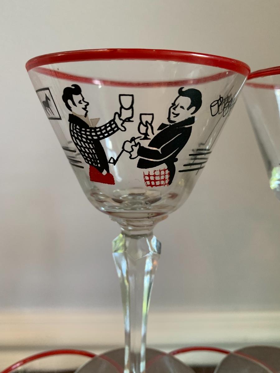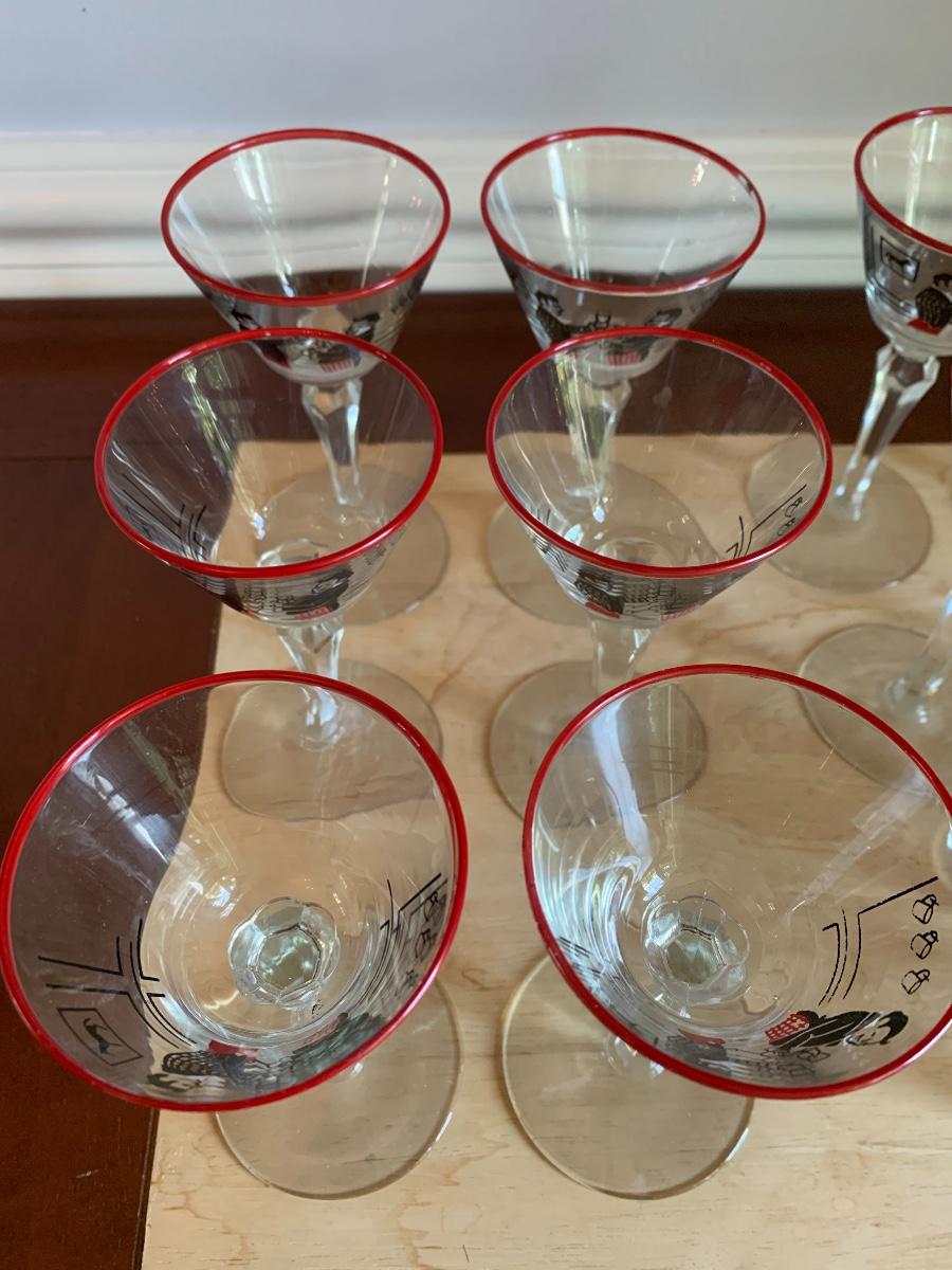 Vintage 1940's Libbey Pickwick Merrymakers Cordial Cocktail Glasses Men Toasting along with matching shot glasses