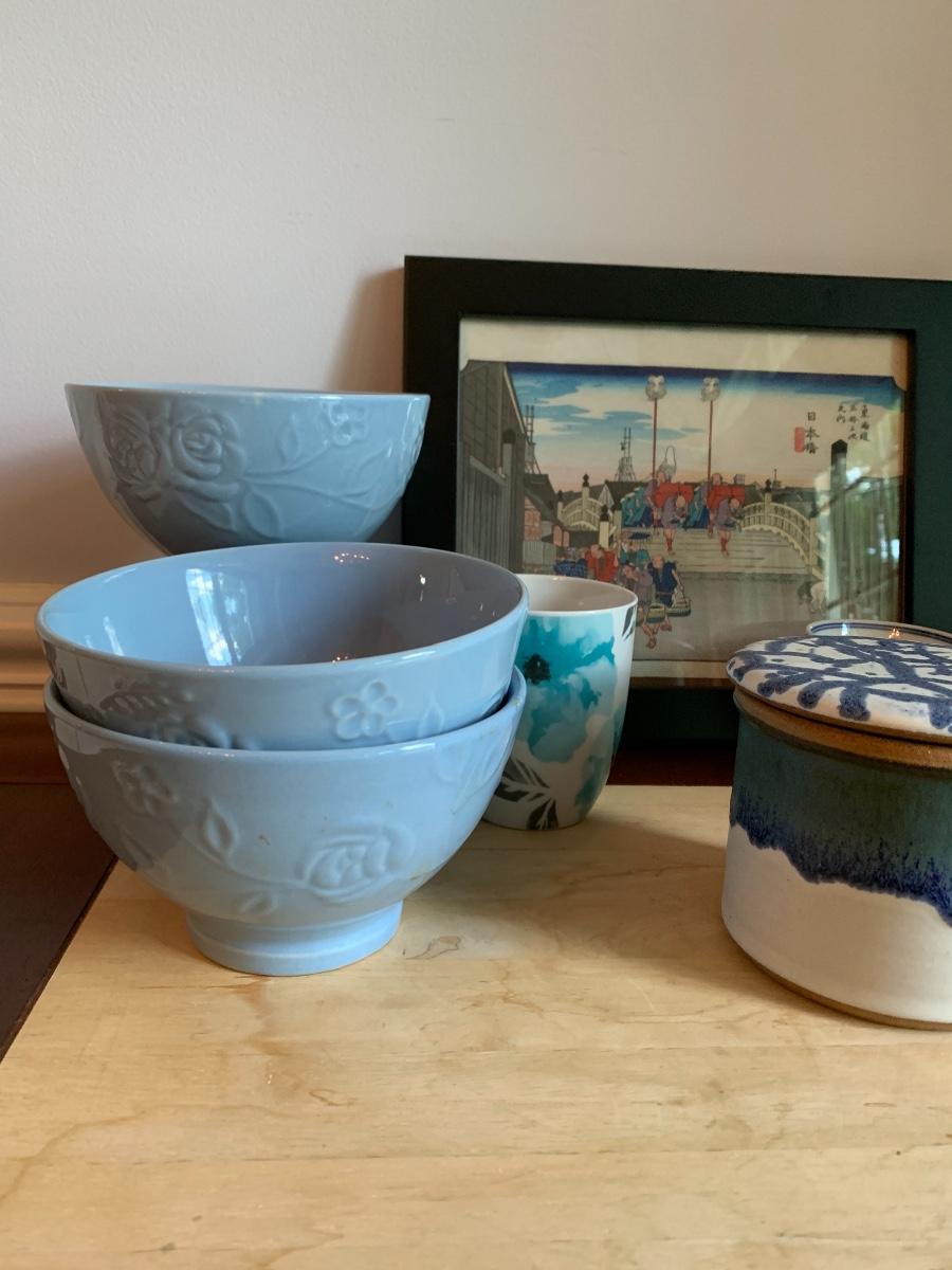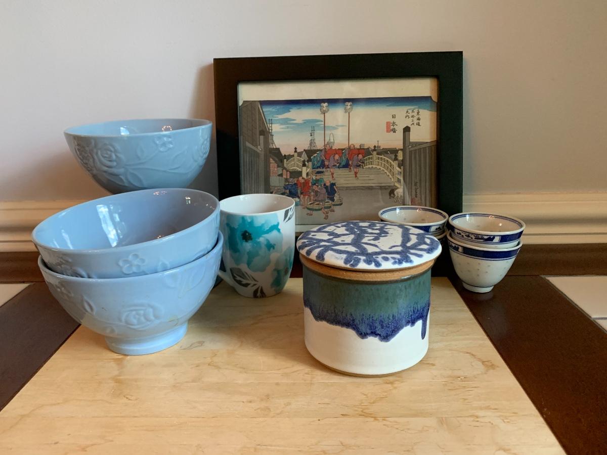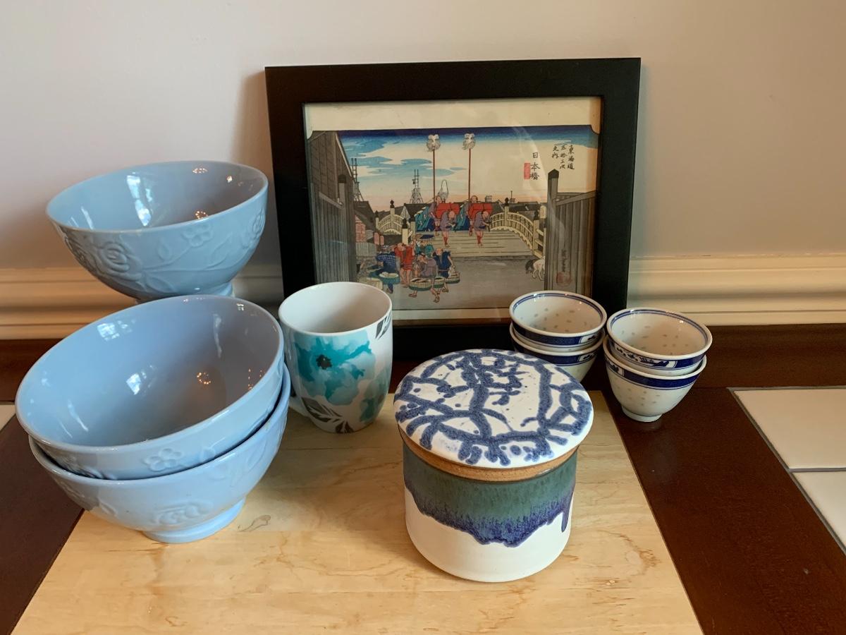 Eclectic lot of French butter dish, Oriental Market Print (12 x 10), bowls and more.