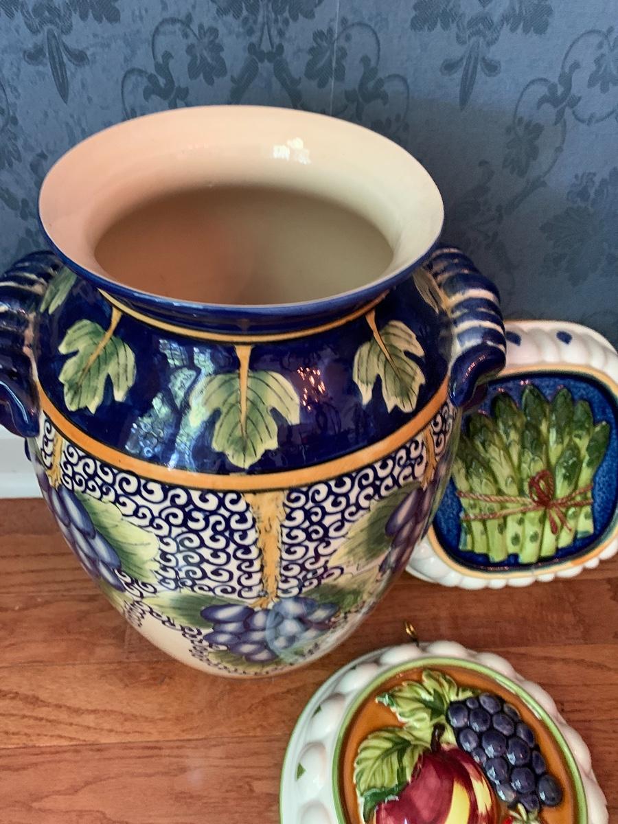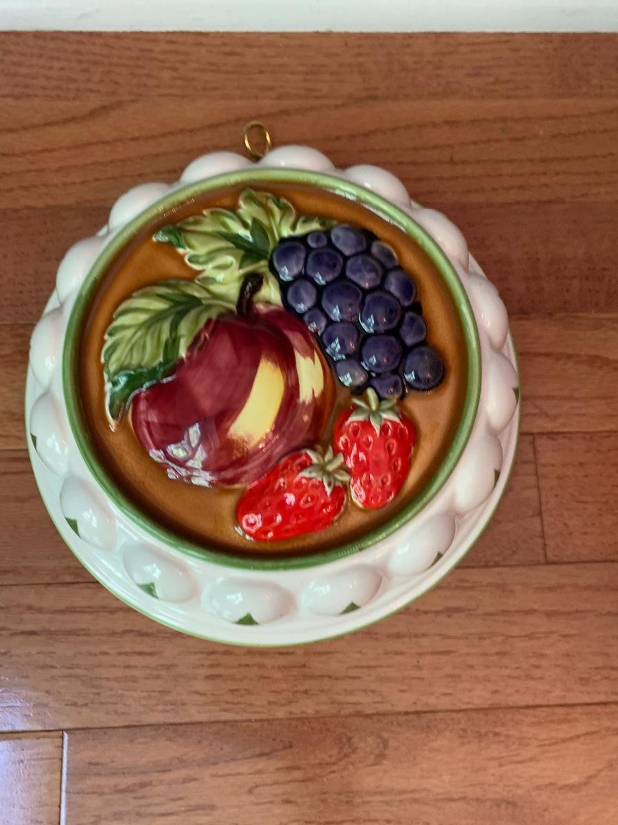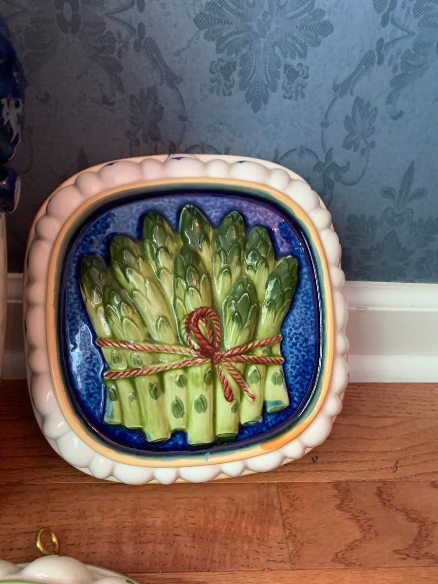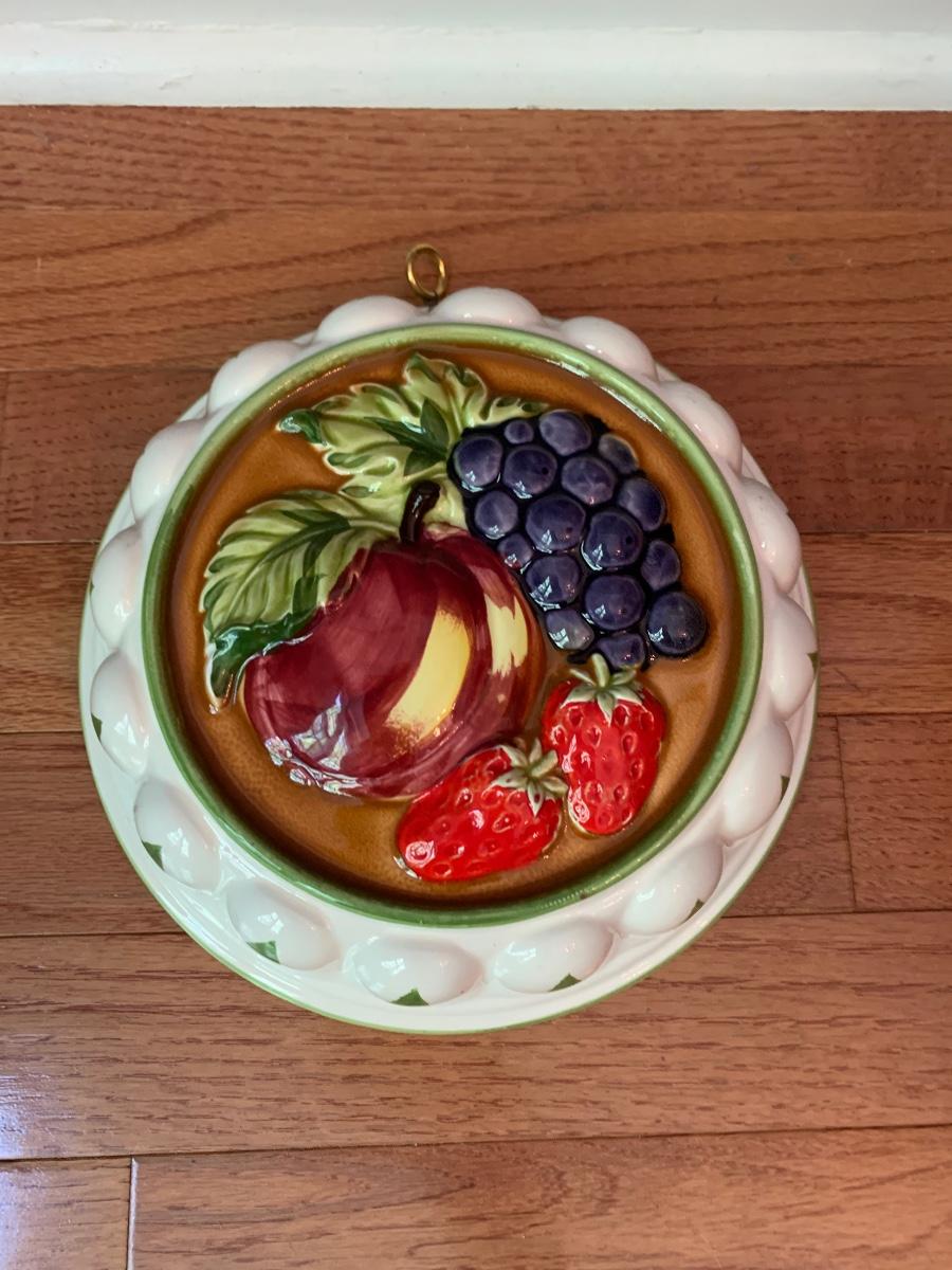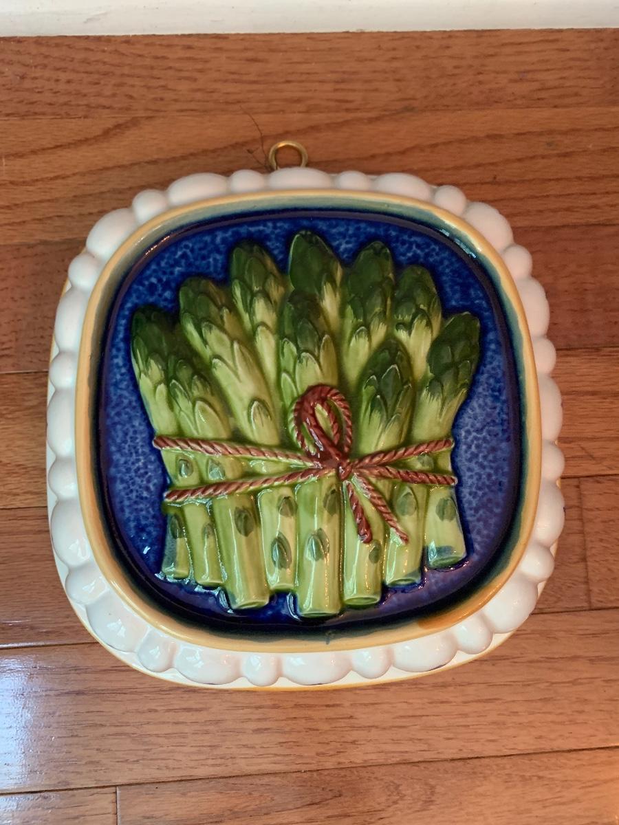 Large polished pottery vase with handles, Vintage Ceramic wall hanging plaque/mold - asparagus and fruit (8.5 x 8.5)
