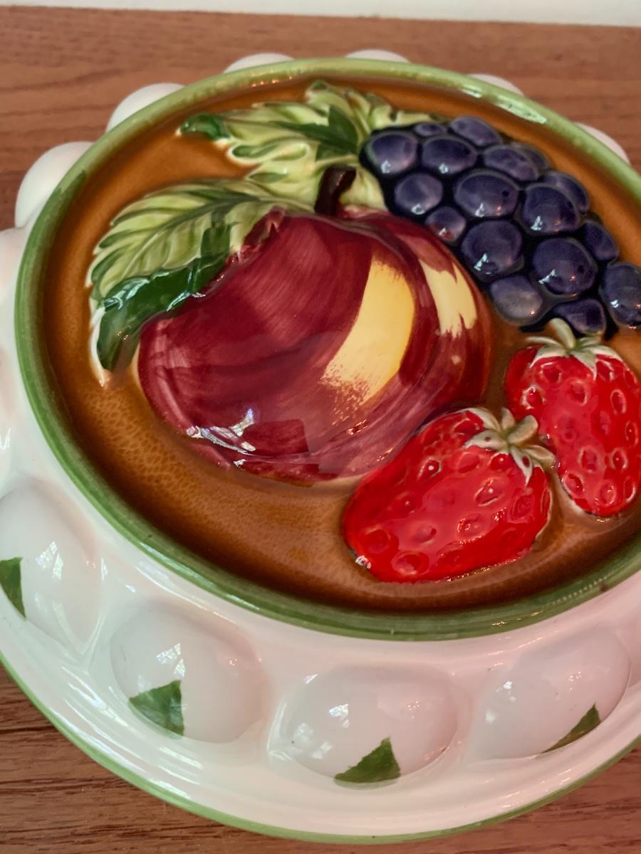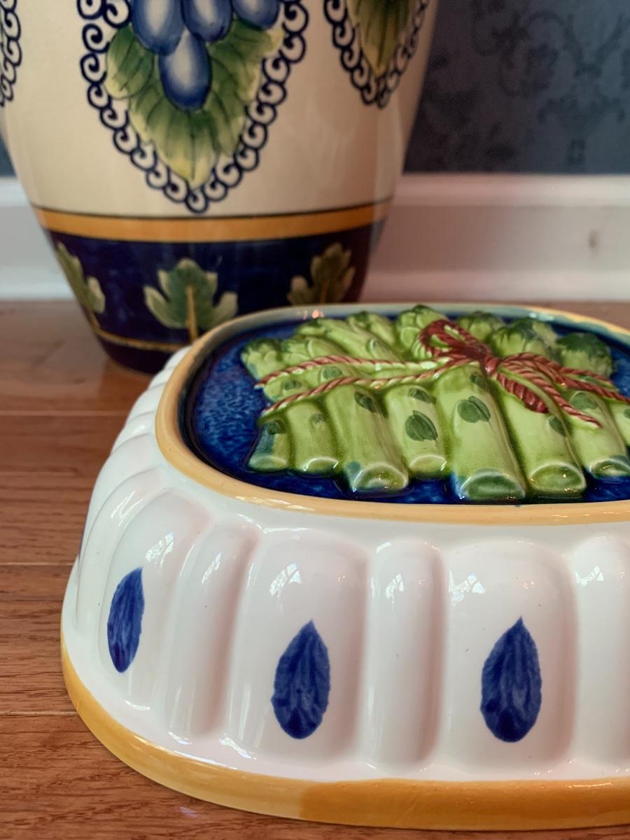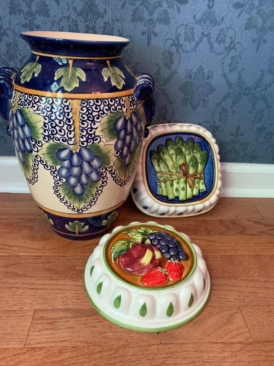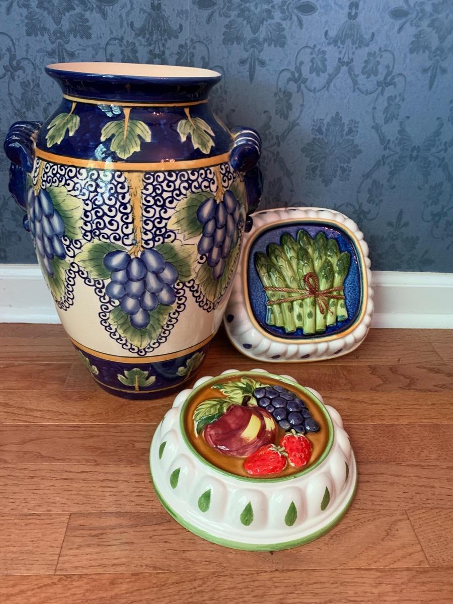 Large polished pottery vase with handles, Vintage Ceramic wall hanging plaque/mold - asparagus and fruit (8.5 x 8.5)