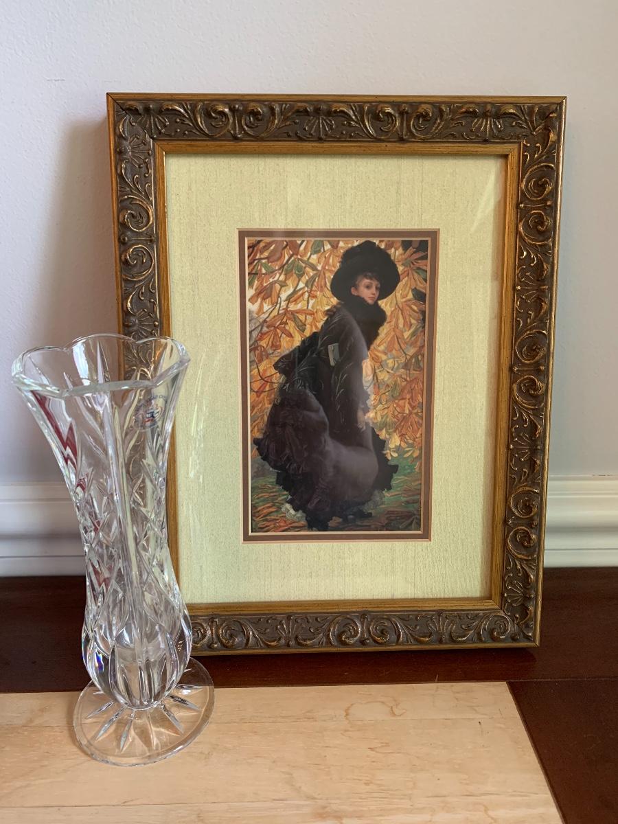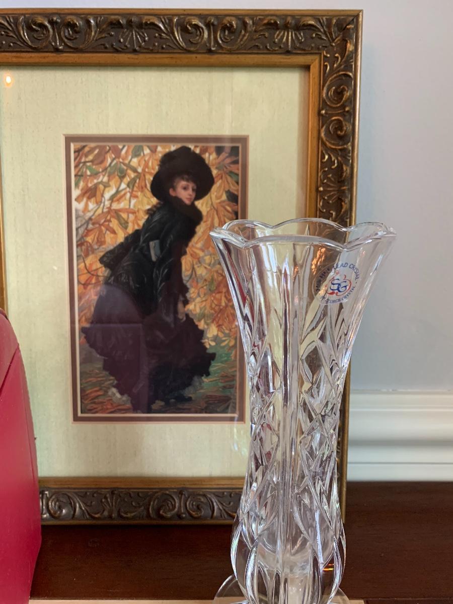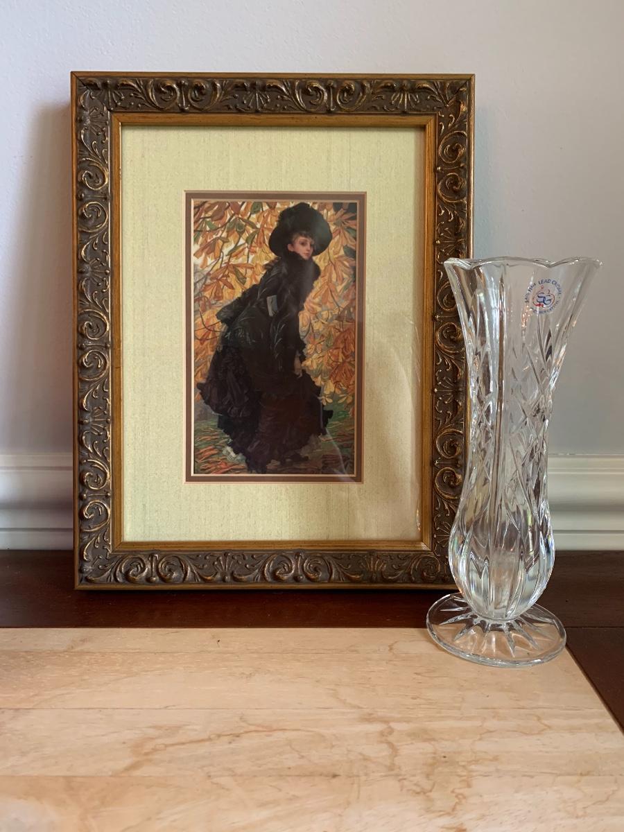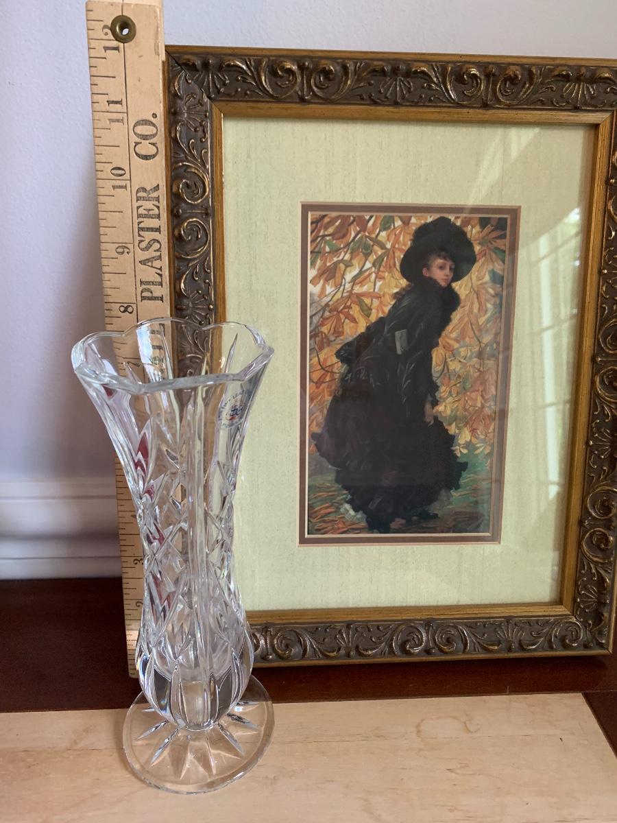 Lot 490:  St. George Crystal Vase, Tuscan Design Leather Jewelry Box, Framed Victorian Lady Print & More