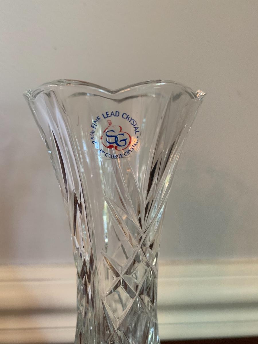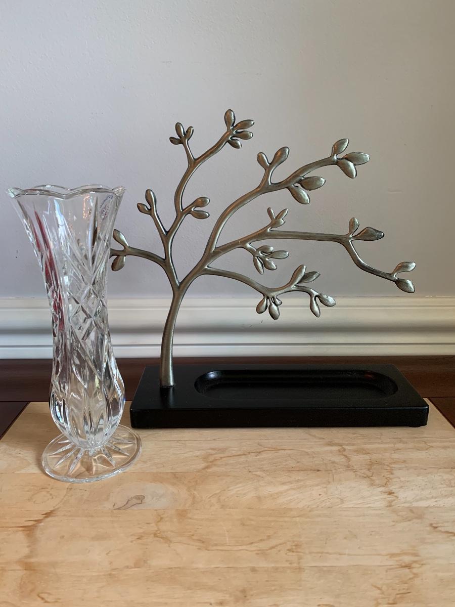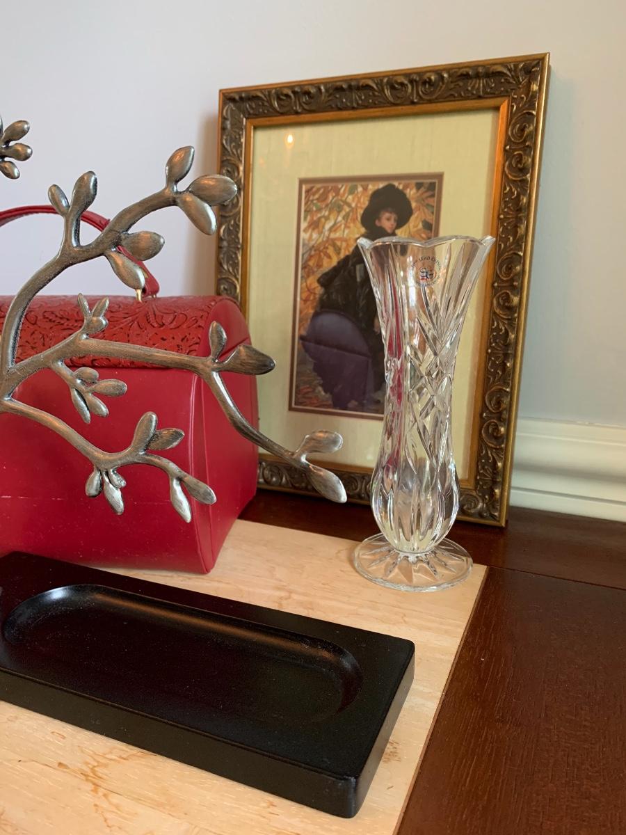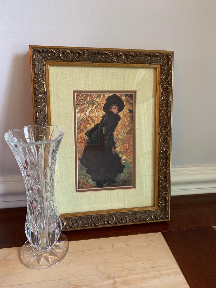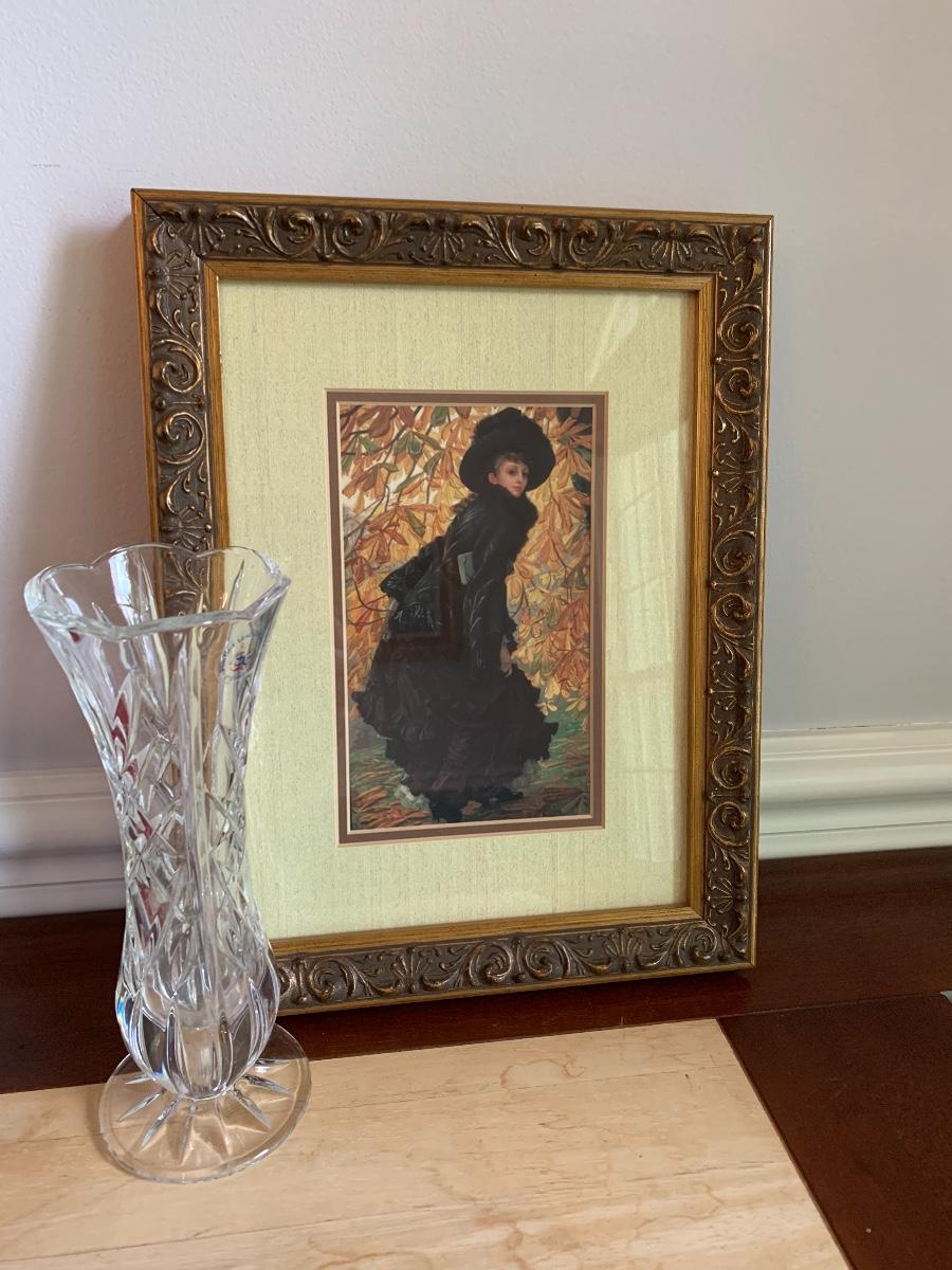 Lot 490:  St. George Crystal Vase, Tuscan Design Leather Jewelry Box, Framed Victorian Lady Print & More