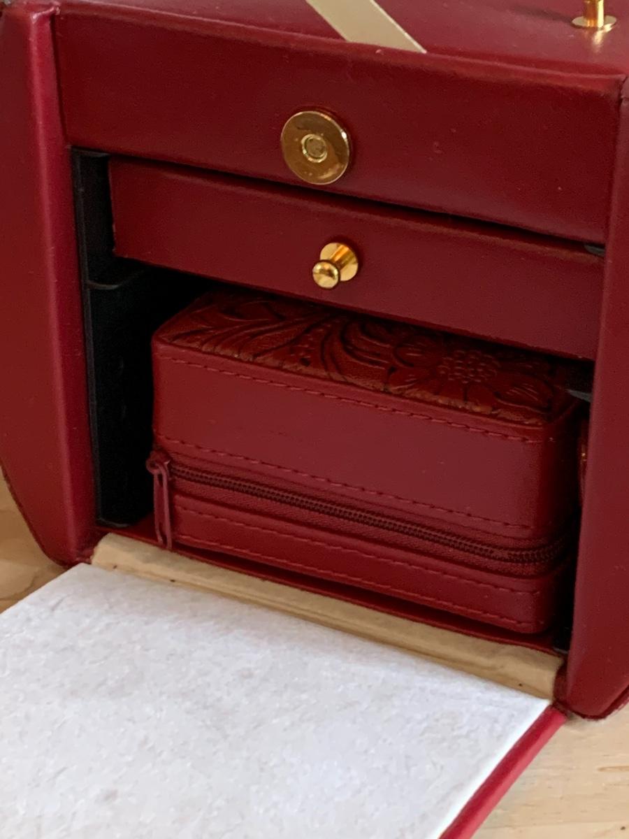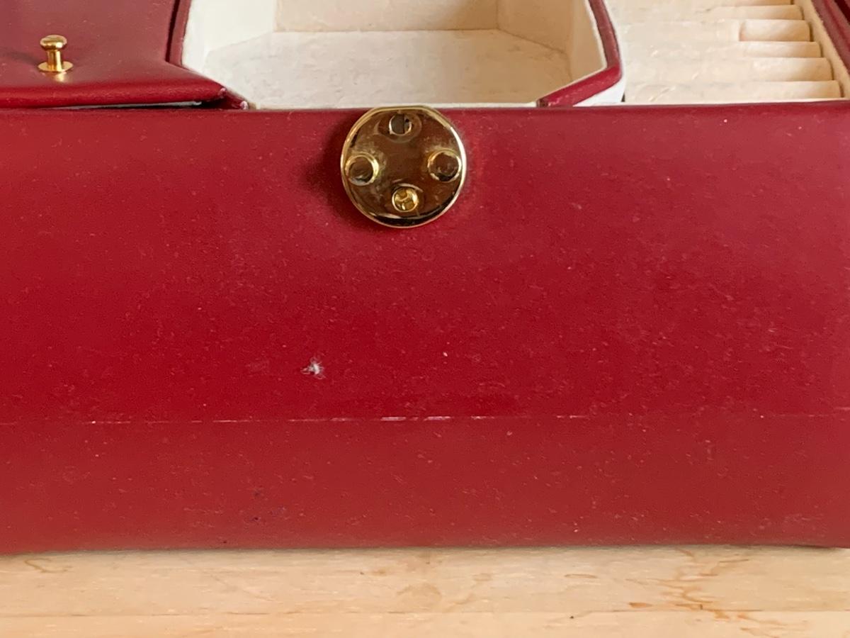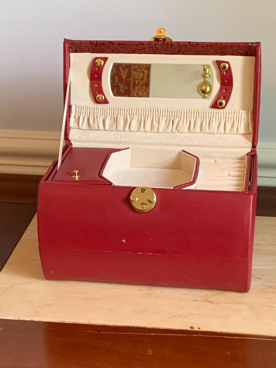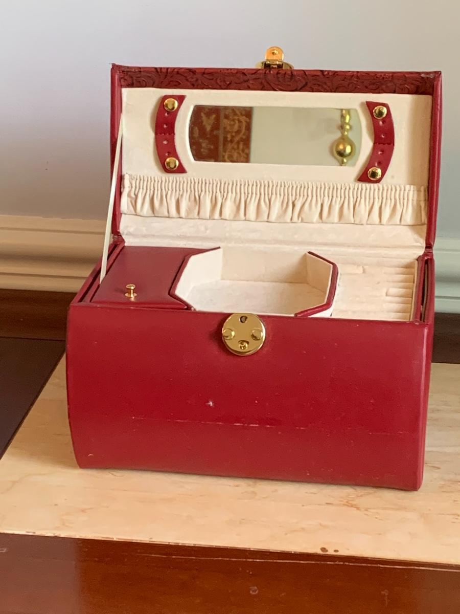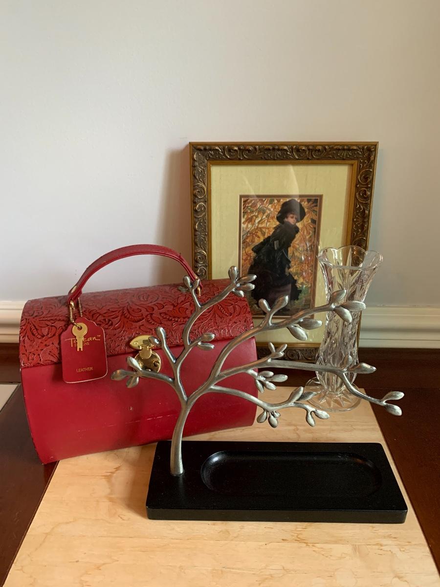 Red leather jewelry box had multiple compartments & key, a jewelry tree for hanging necklaces, Framed Ren-Wil Inc. print of Victorian Lady along with a beautiful lead crystal vase.