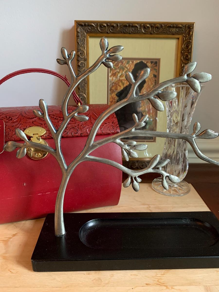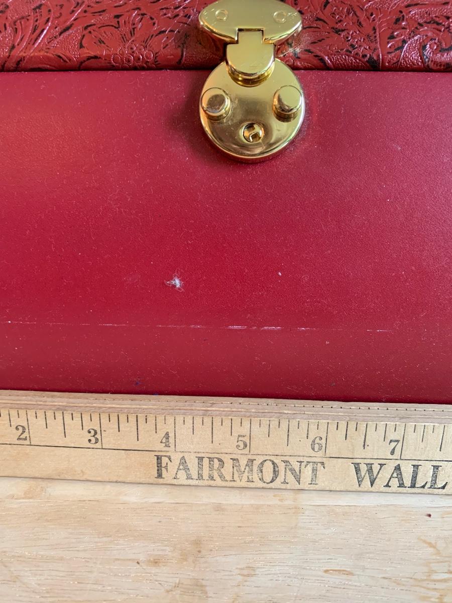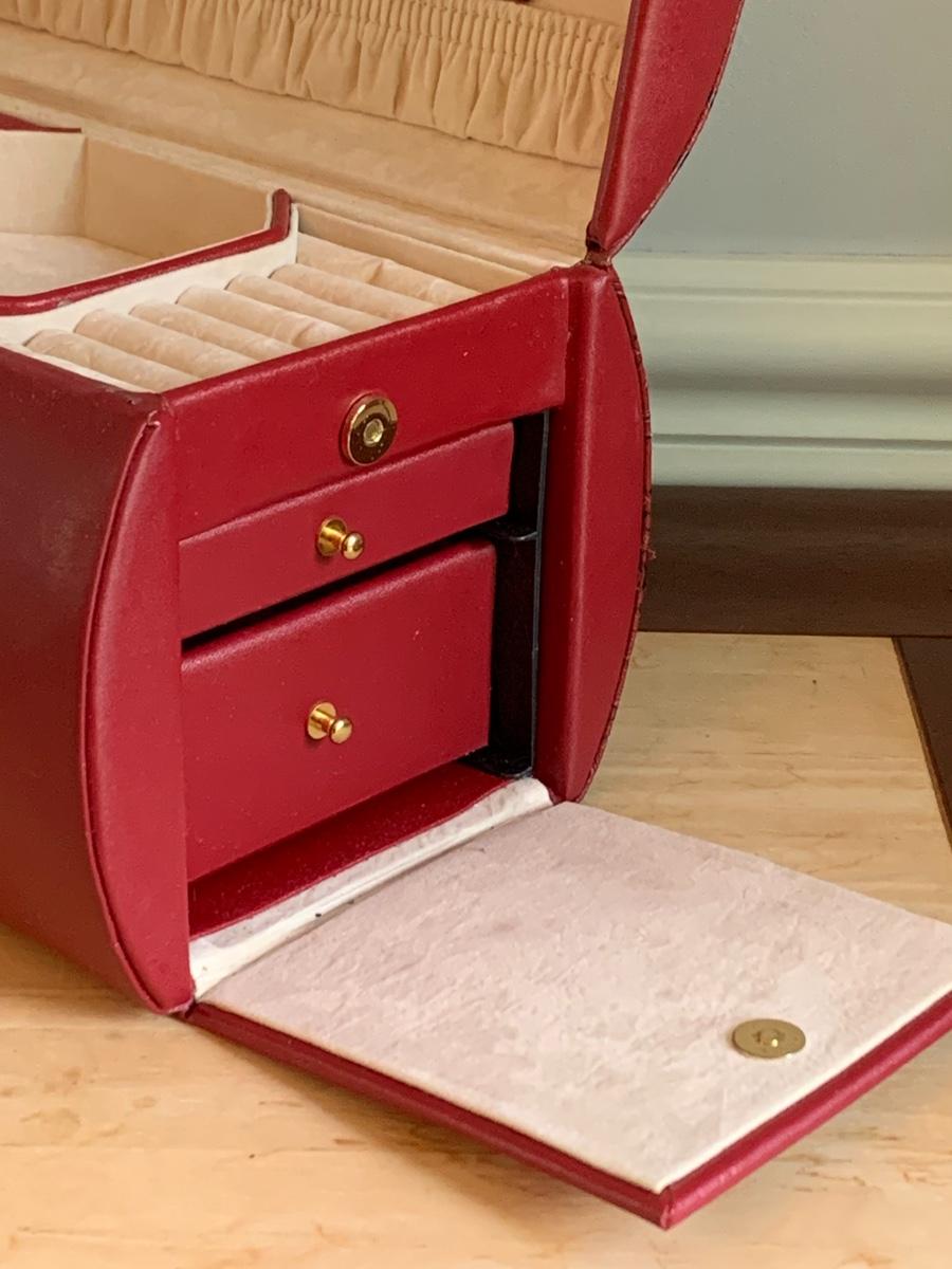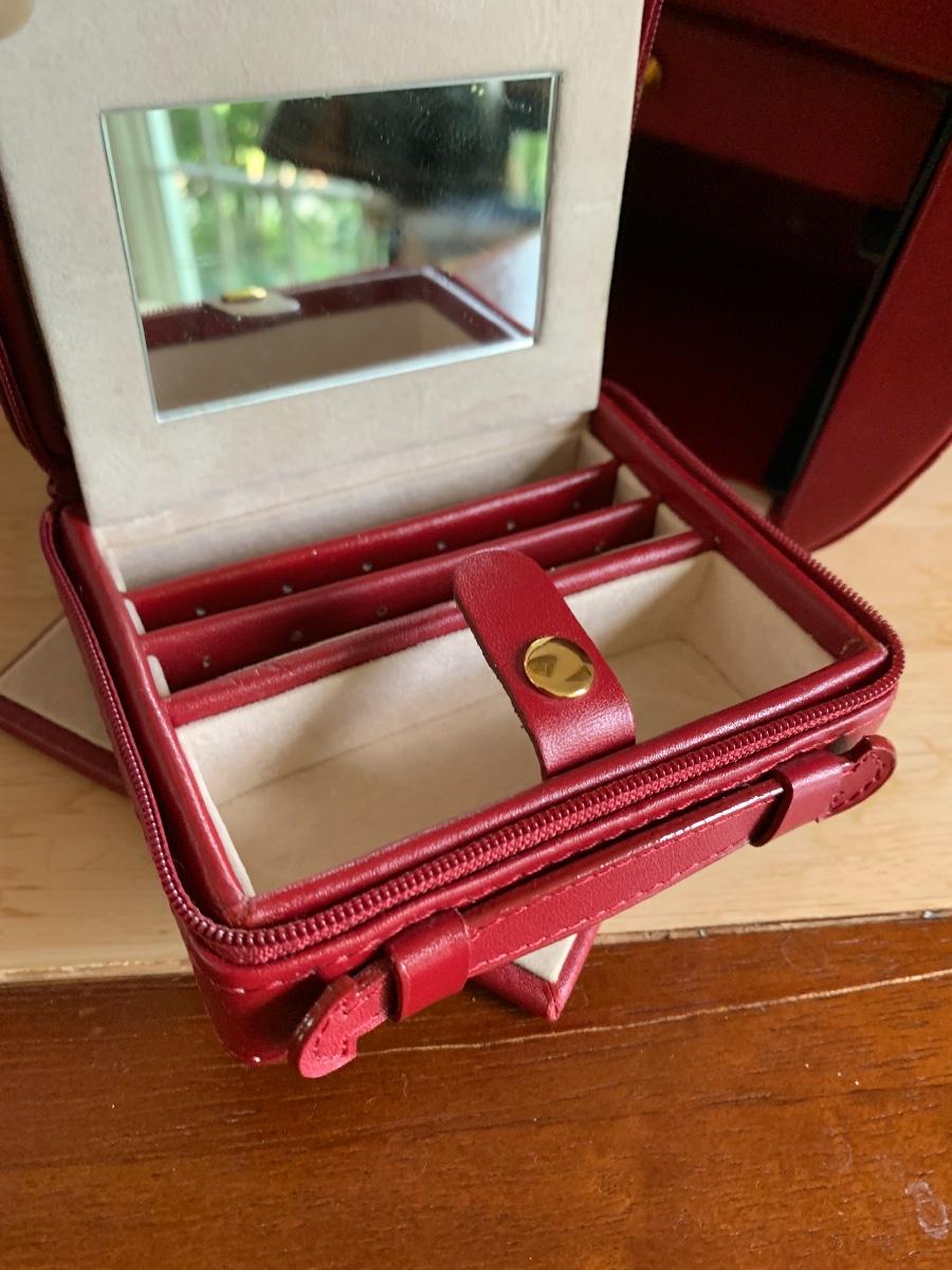 Red leather jewelry box had multiple compartments & key, a jewelry tree for hanging necklaces, Framed Ren-Wil Inc. print of Victorian Lady along with a beautiful lead crystal vase.