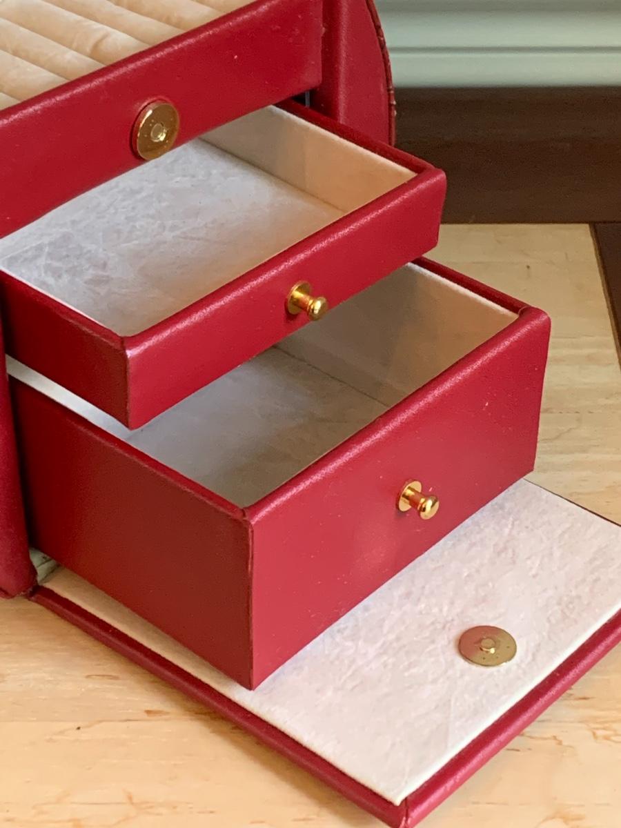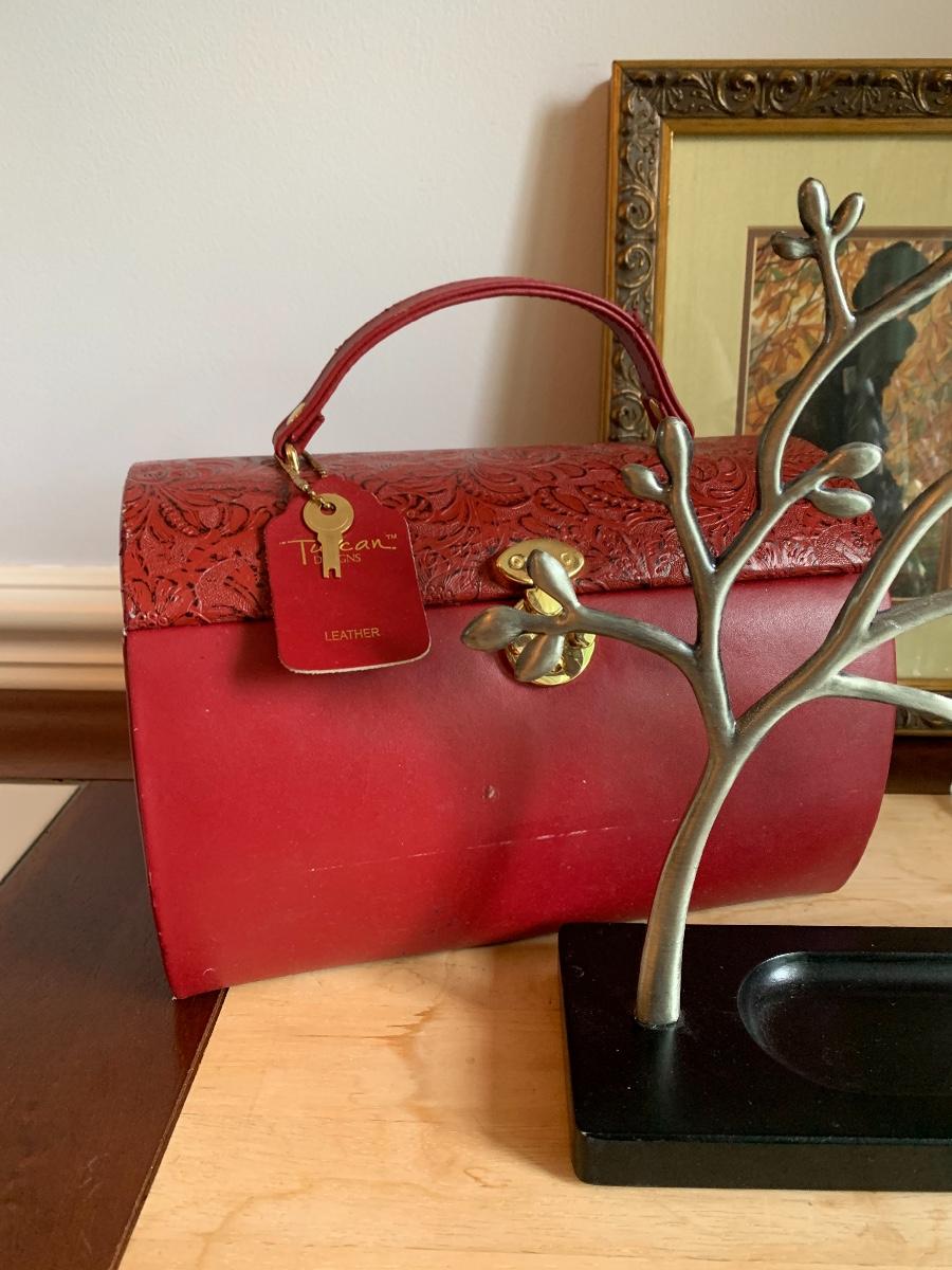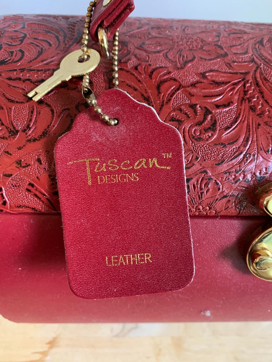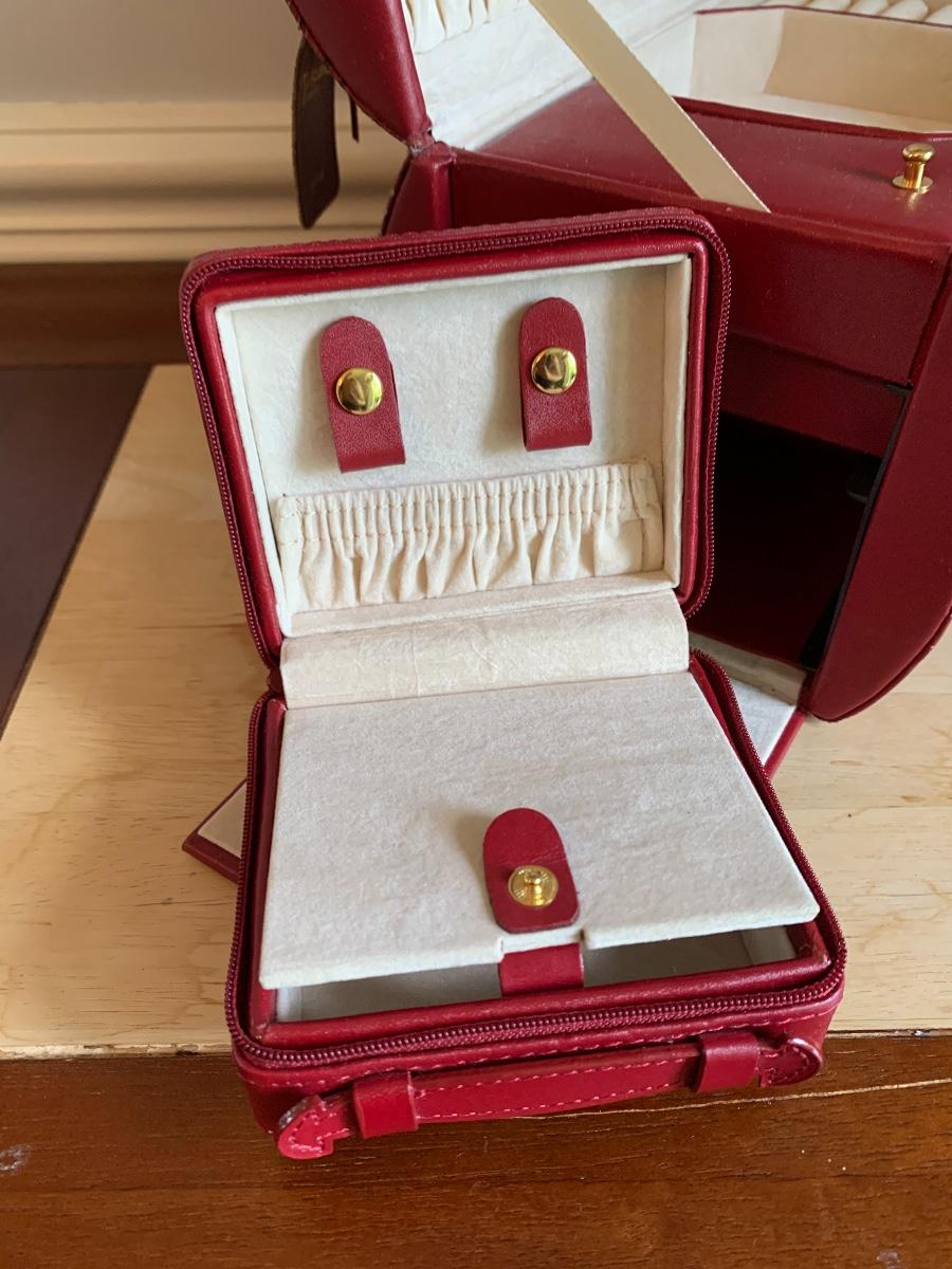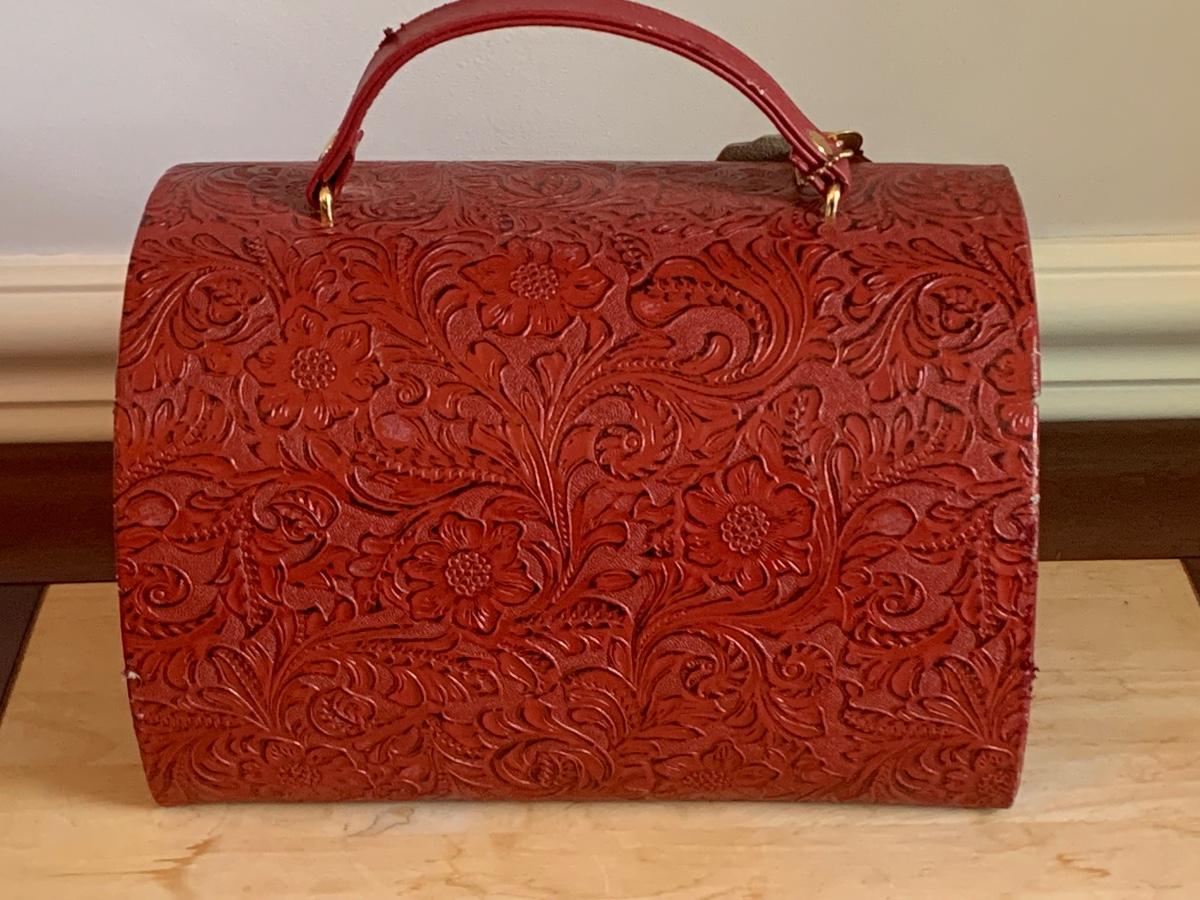 Red leather jewelry box had multiple compartments & key, a jewelry tree for hanging necklaces, Framed Ren-Wil Inc. print of Victorian Lady along with a beautiful lead crystal vase.