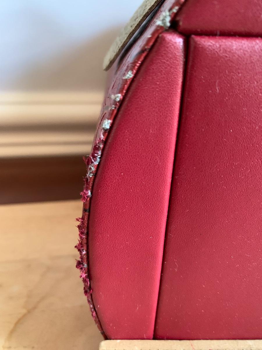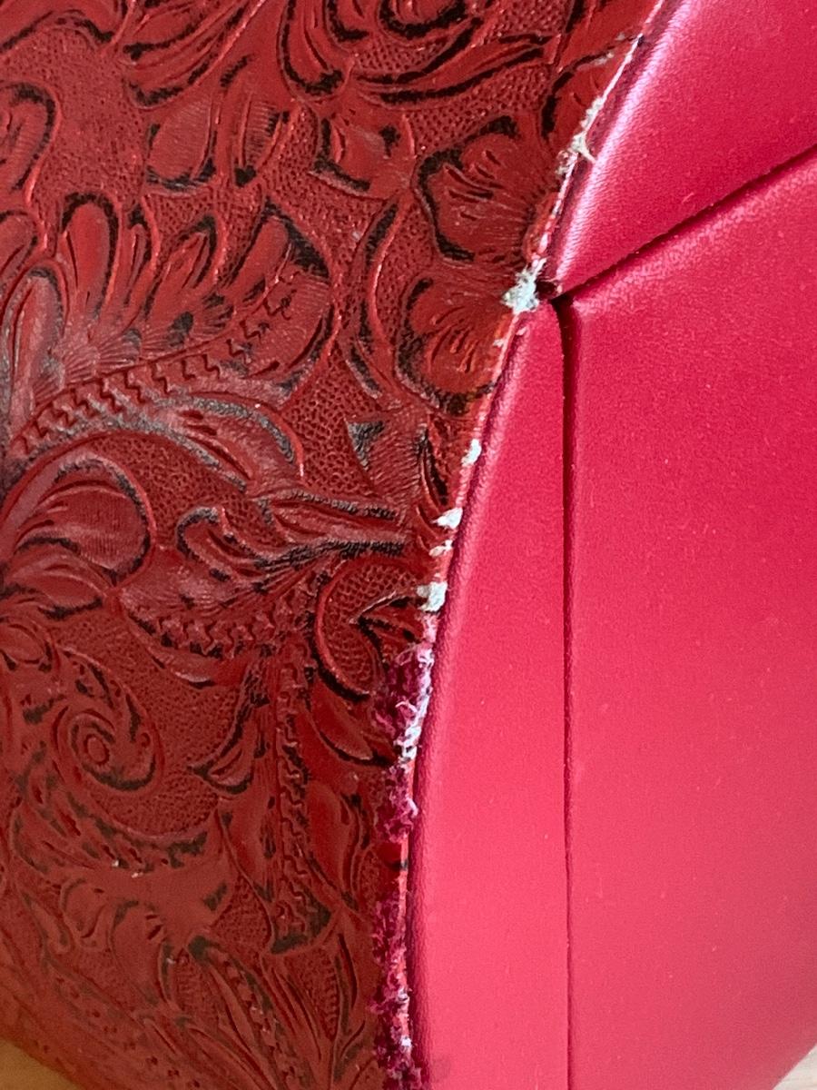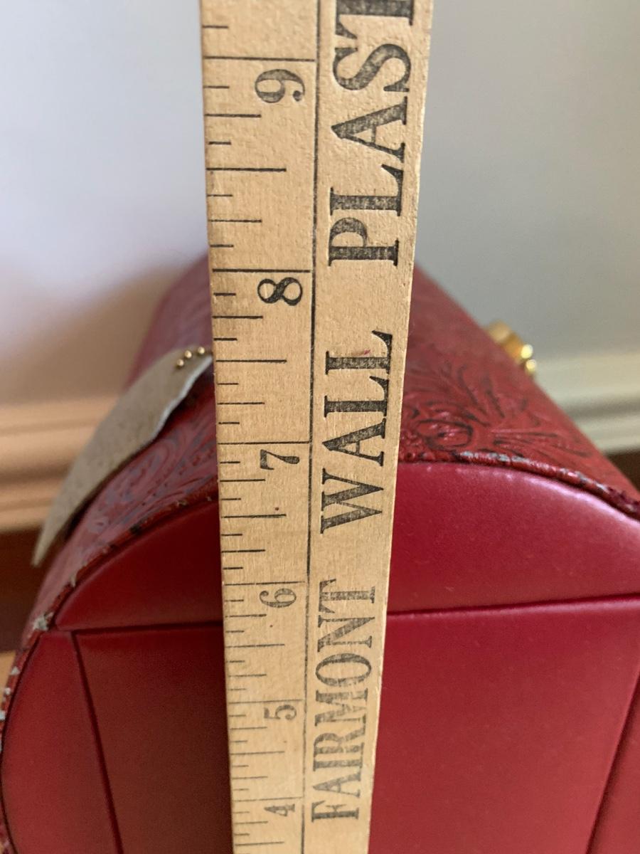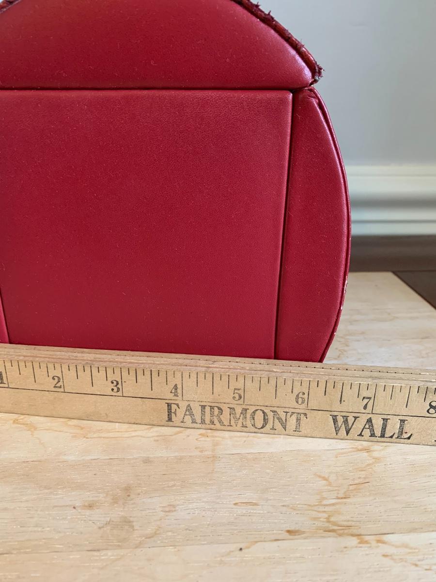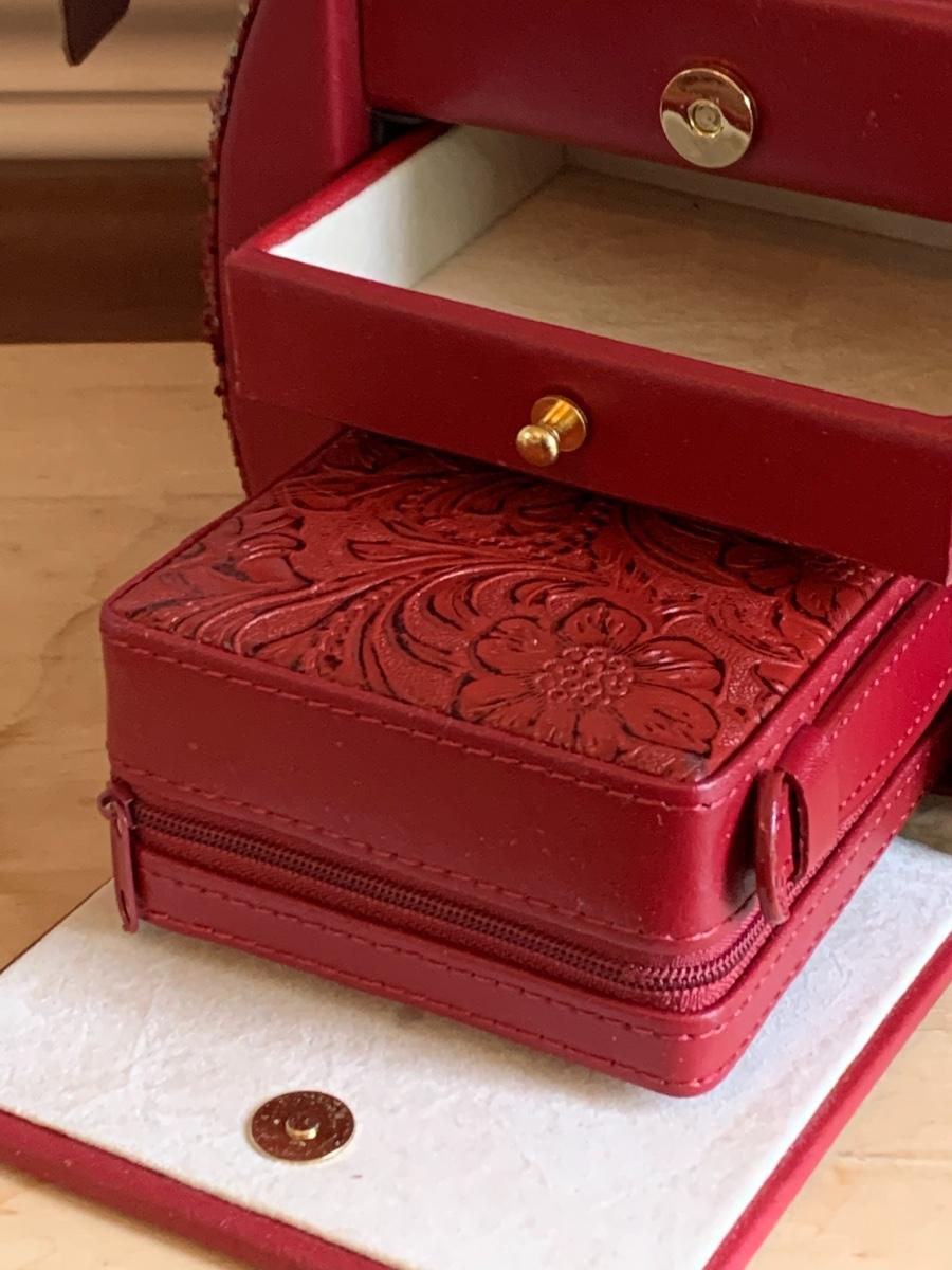 Red leather jewelry box had multiple compartments & key, a jewelry tree for hanging necklaces, Framed Ren-Wil Inc. print of Victorian Lady along with a beautiful lead crystal vase.
