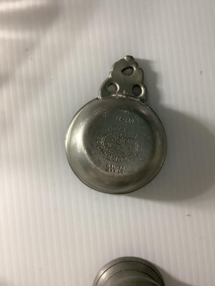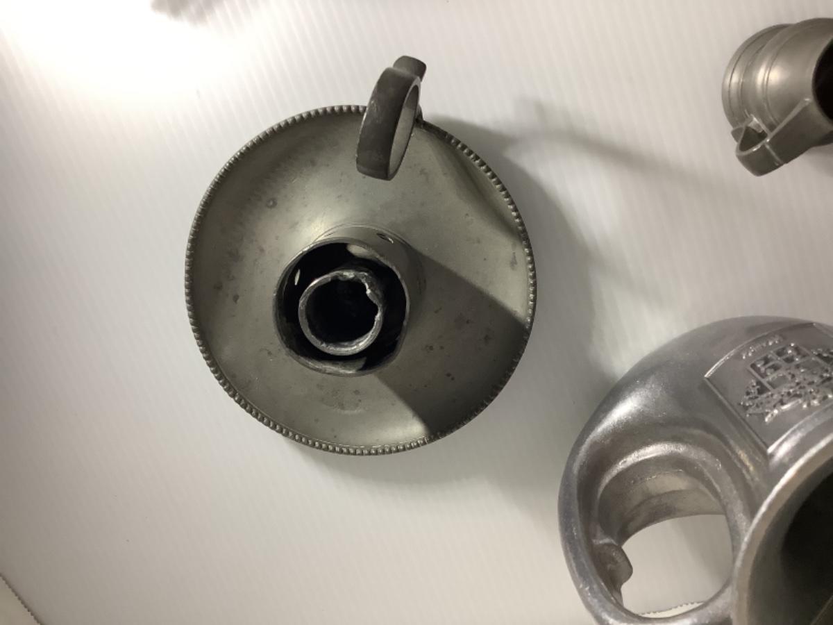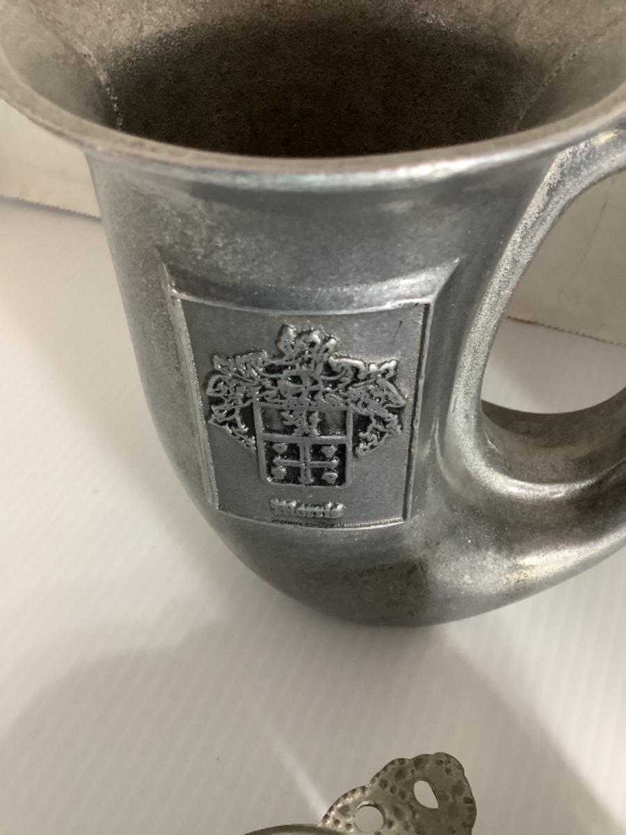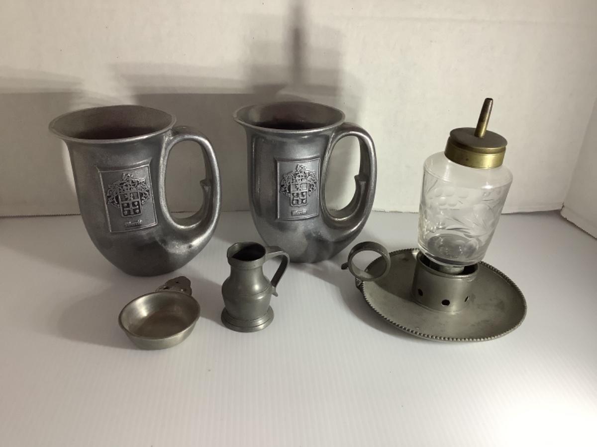R939. Antique Pewter Finger Lamp and Hunting Mugs