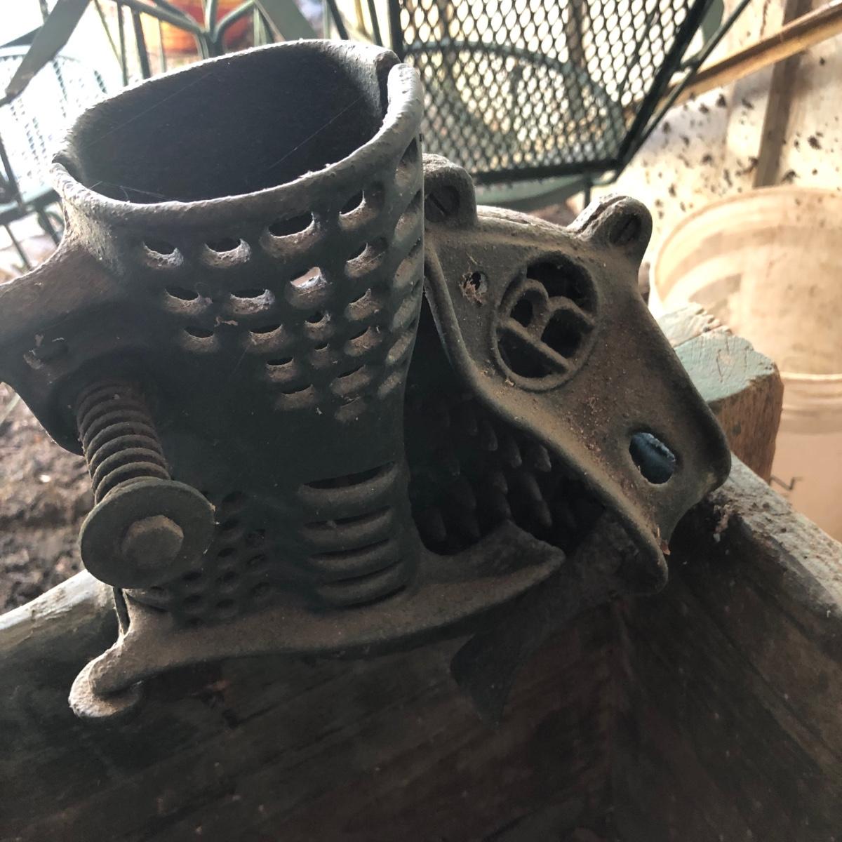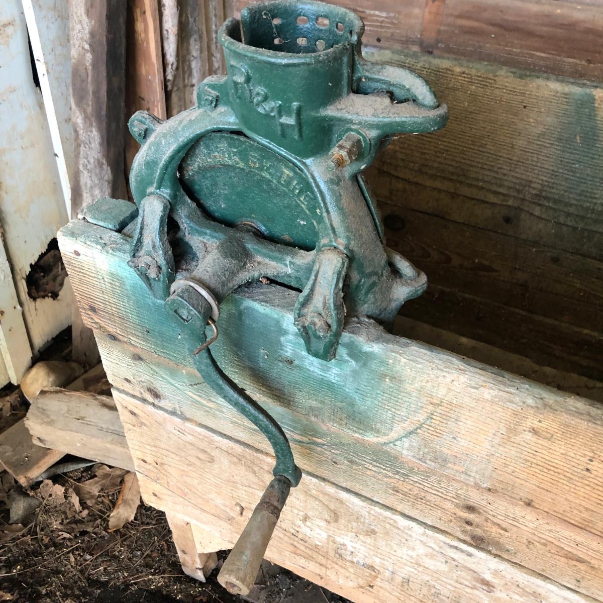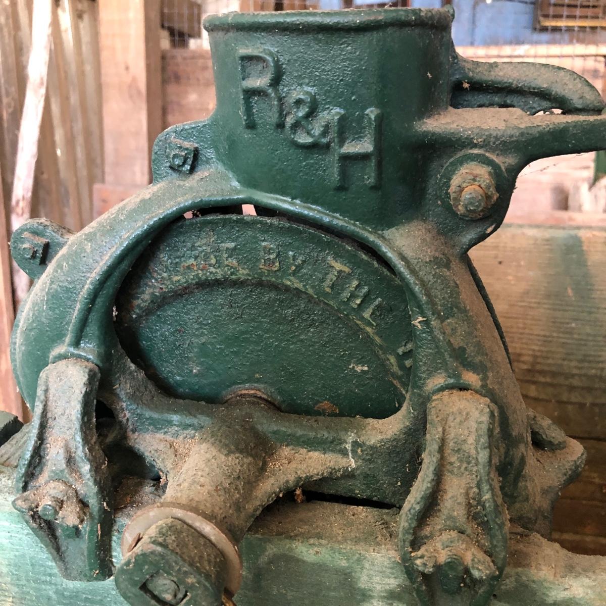 This vintage sheller has “The Root-Heath M.F.G Co. Plymouth O. USA” on the grinding wheel. sheller is attached to homemade bin which buyer can have or leave. Note the nail in the handle. Local pick up only.