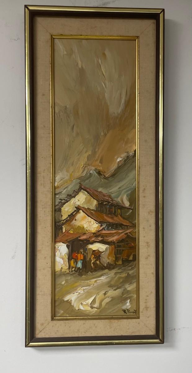 Description: R. Pinott House in Mountains Oil on wood; Framed Measurement: 24.75 x 10; Subject Measurement: 20 x 6