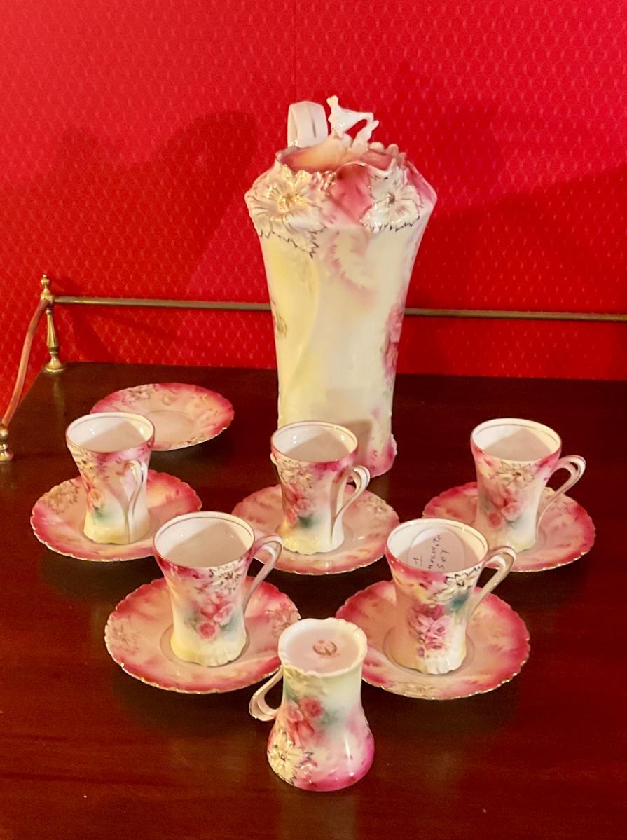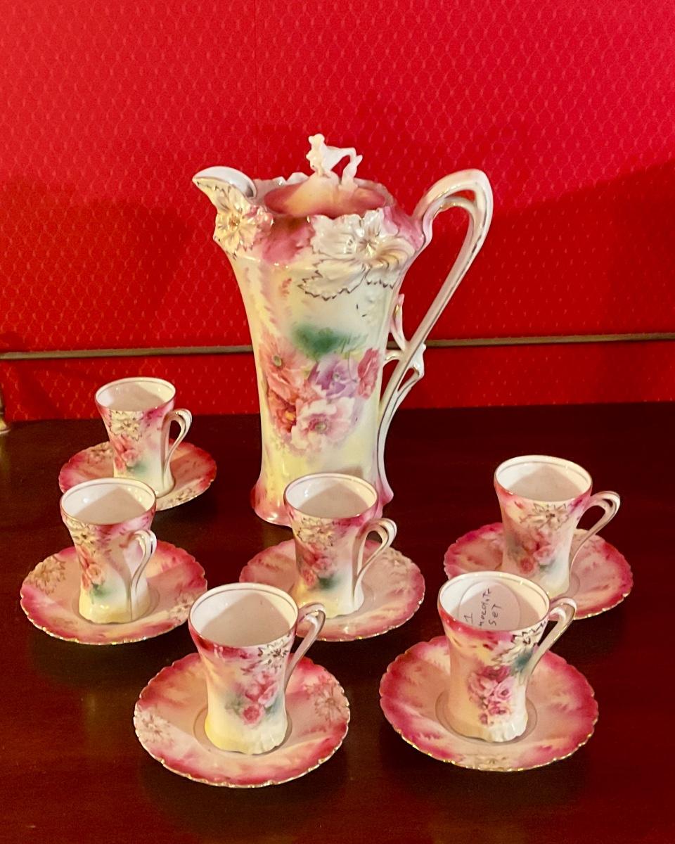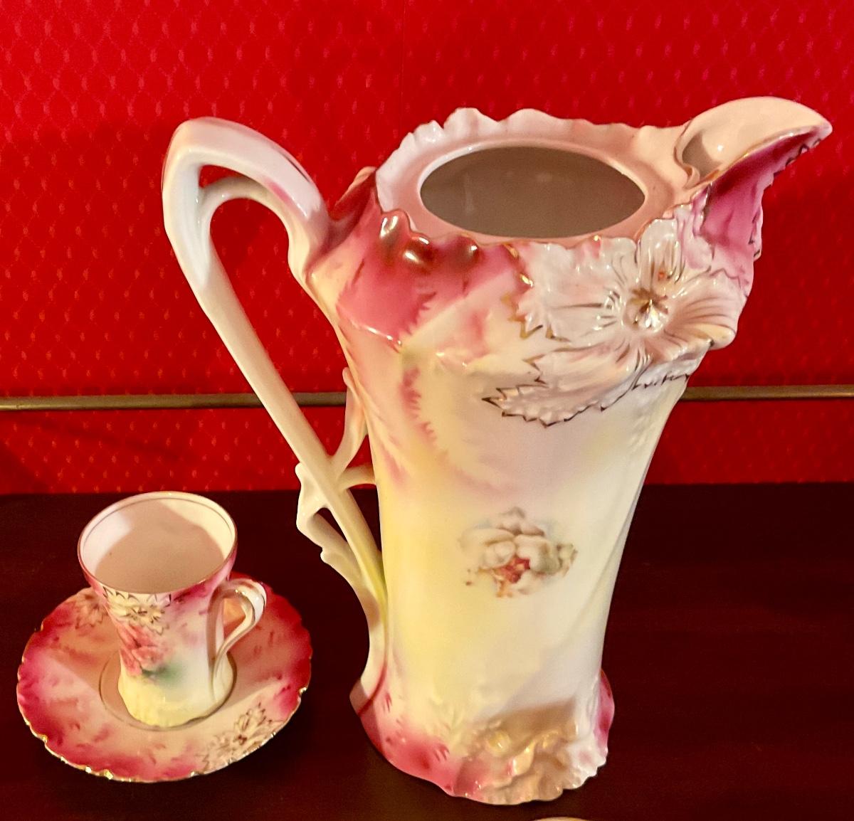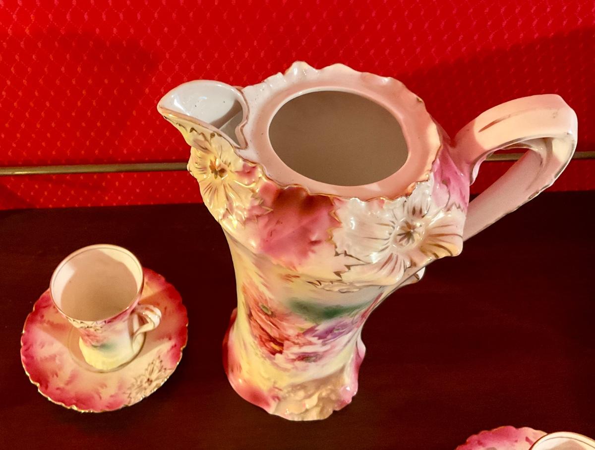 R S Prussia chocolate pot with 6 cups and saucers, floral decal, in great condition