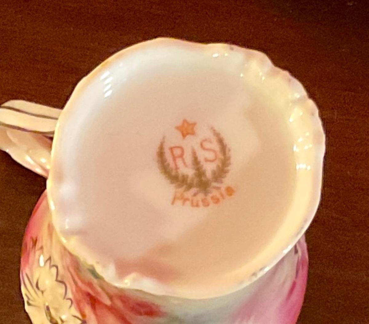Chocolate pot with 6 cups and saucers, marked R. S. Prussia on saucers and bottom of pot