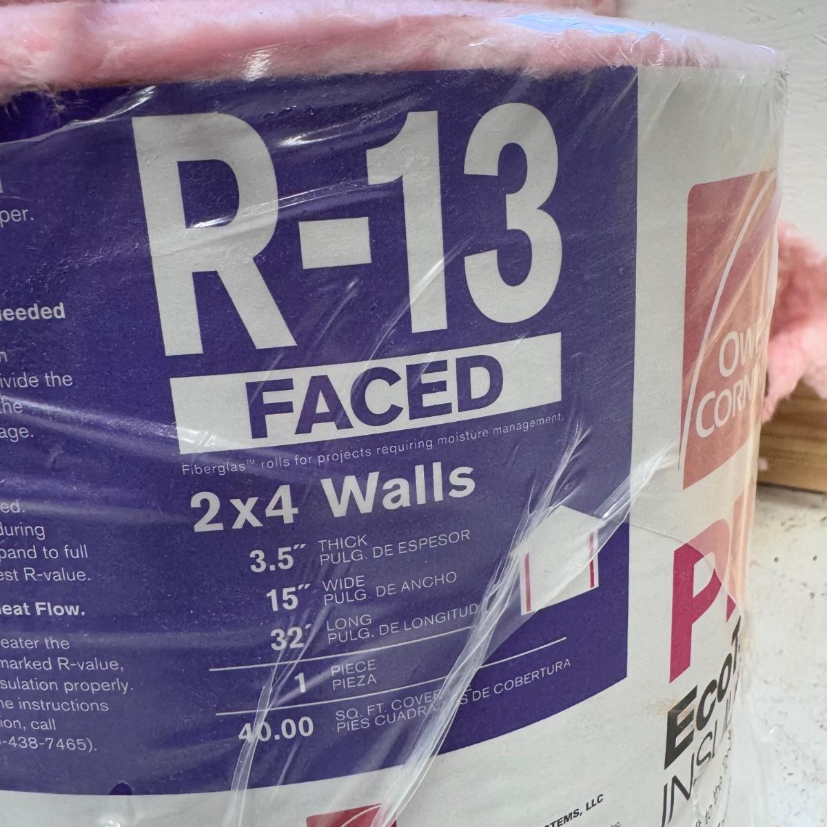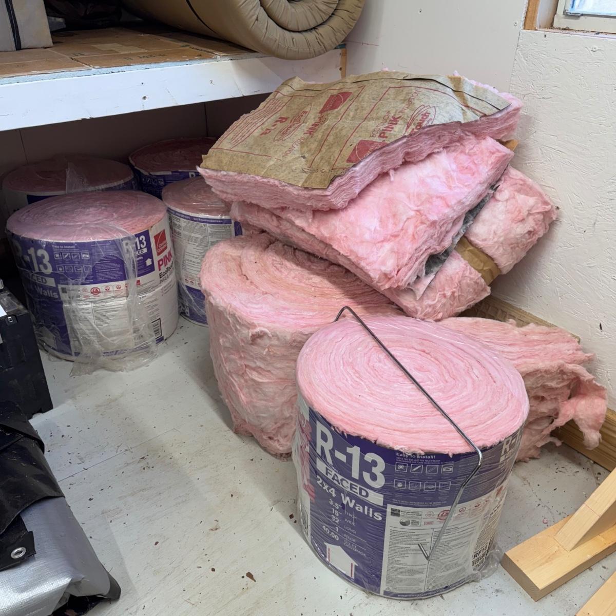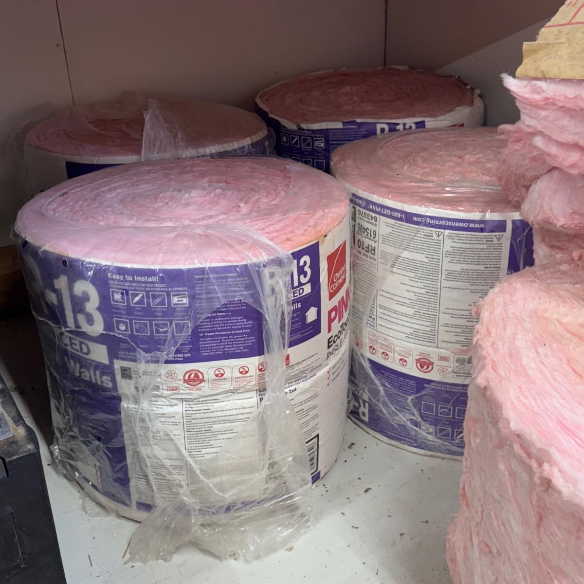 This lot includes six full rolls of R-13 Faced 2x4 pink wall insulation, along with a pile of unrolled insulation. Local pickup only.