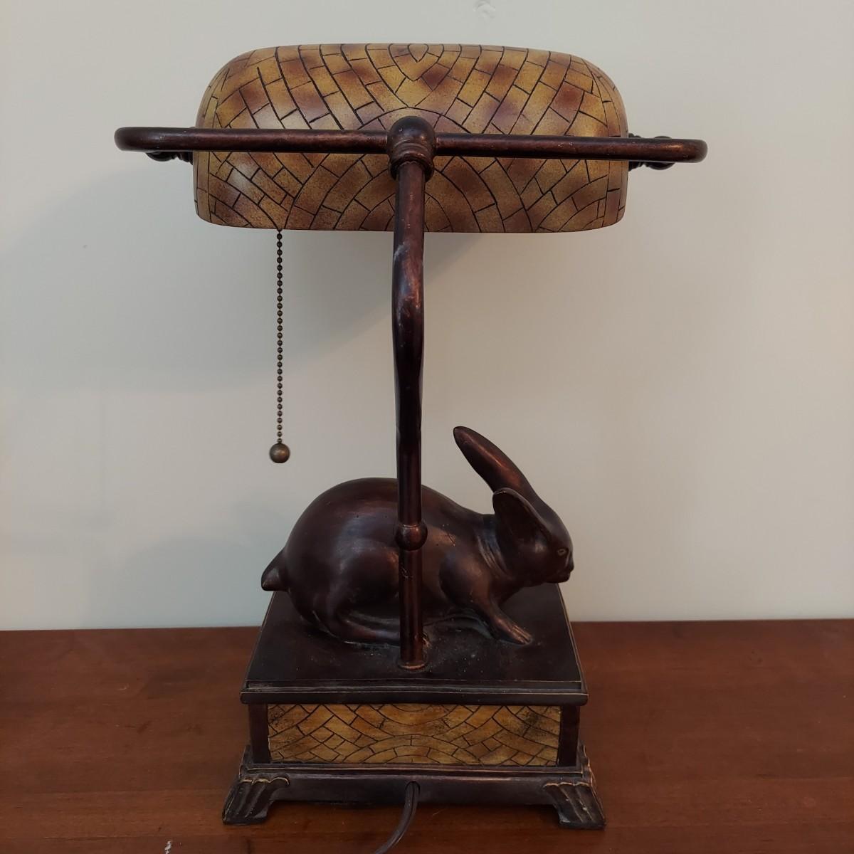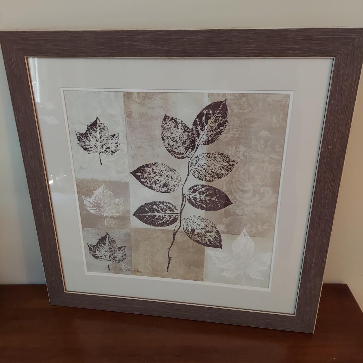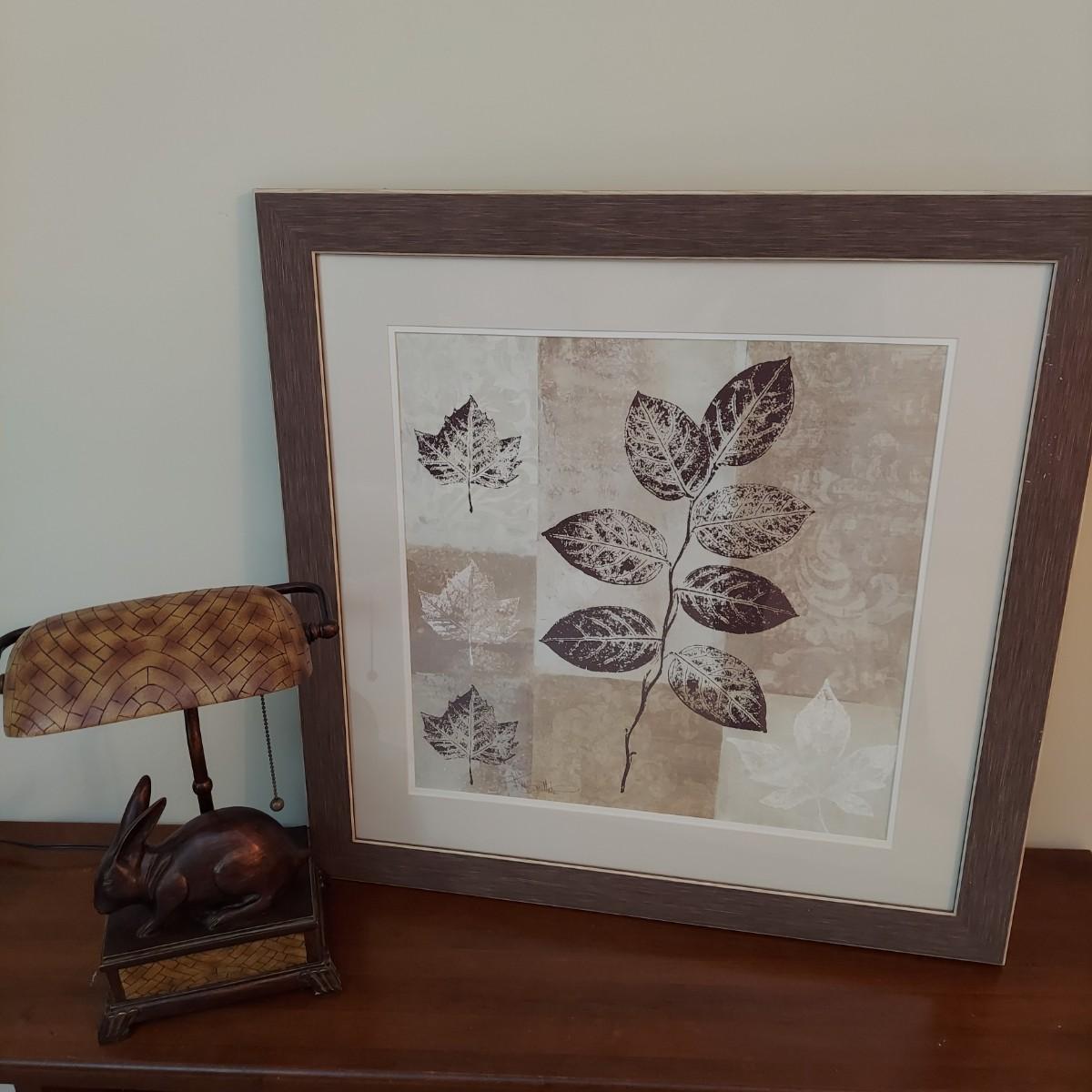 Framed and matted leaf print in wood frame. Measures 26.5" x 26.5"H. Bronze colored rabbit desk lamp measures 11" x 6" x 16"H. Lamp turned on when plugged in. Local Pickup Only.
