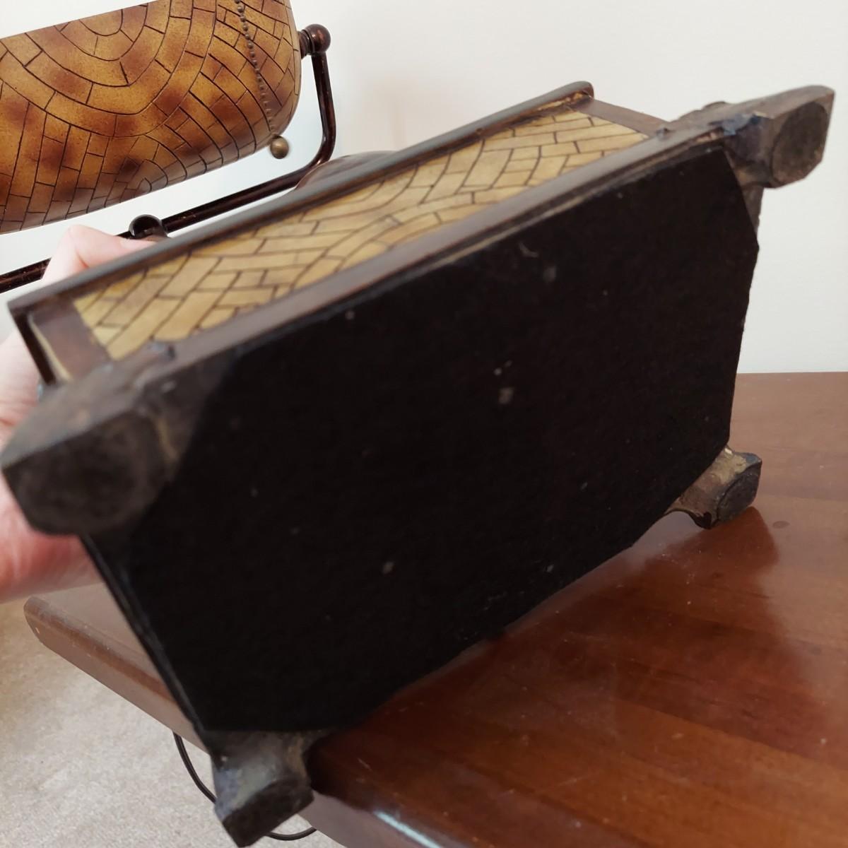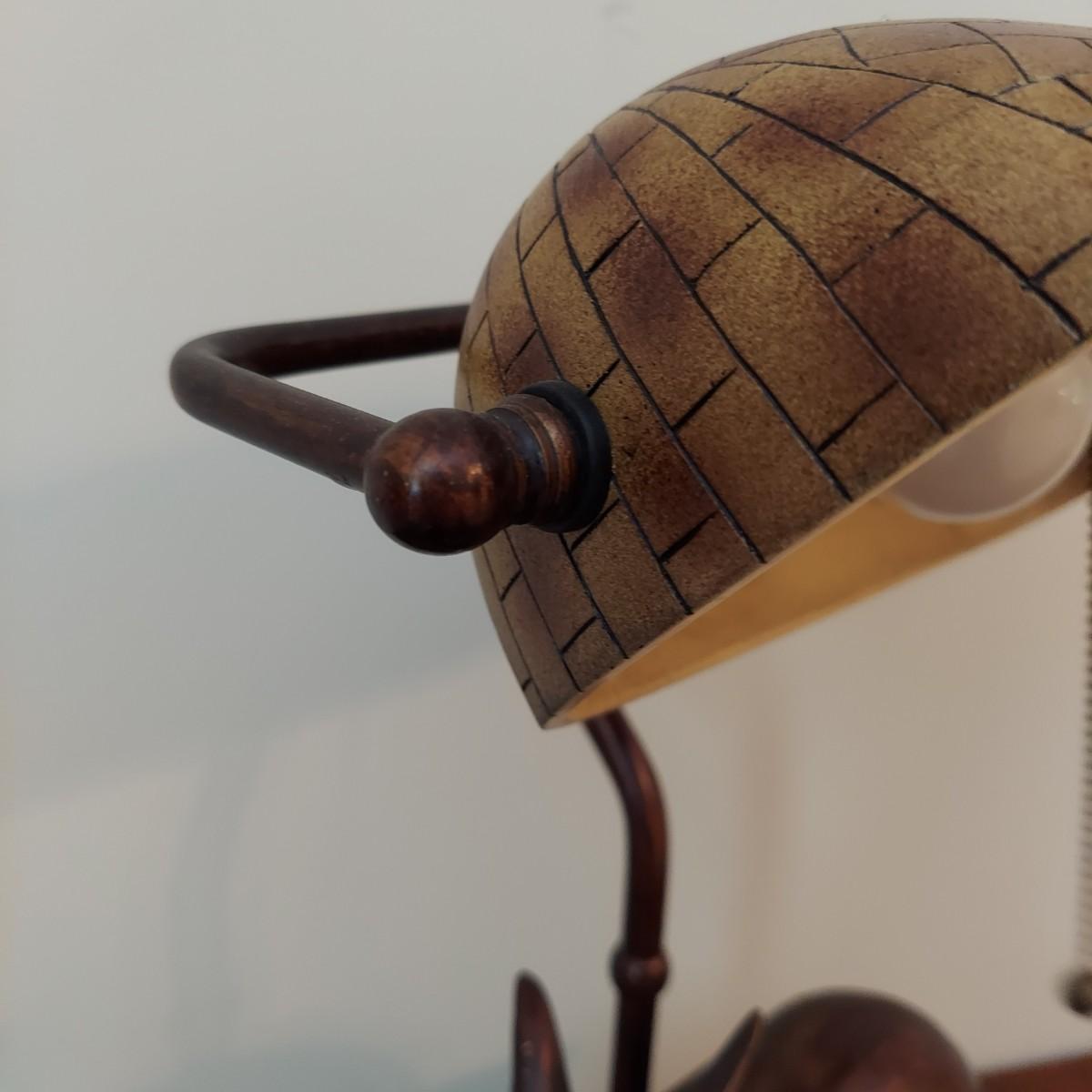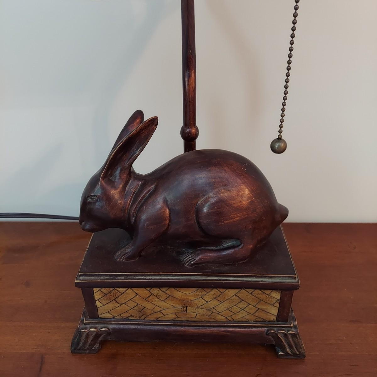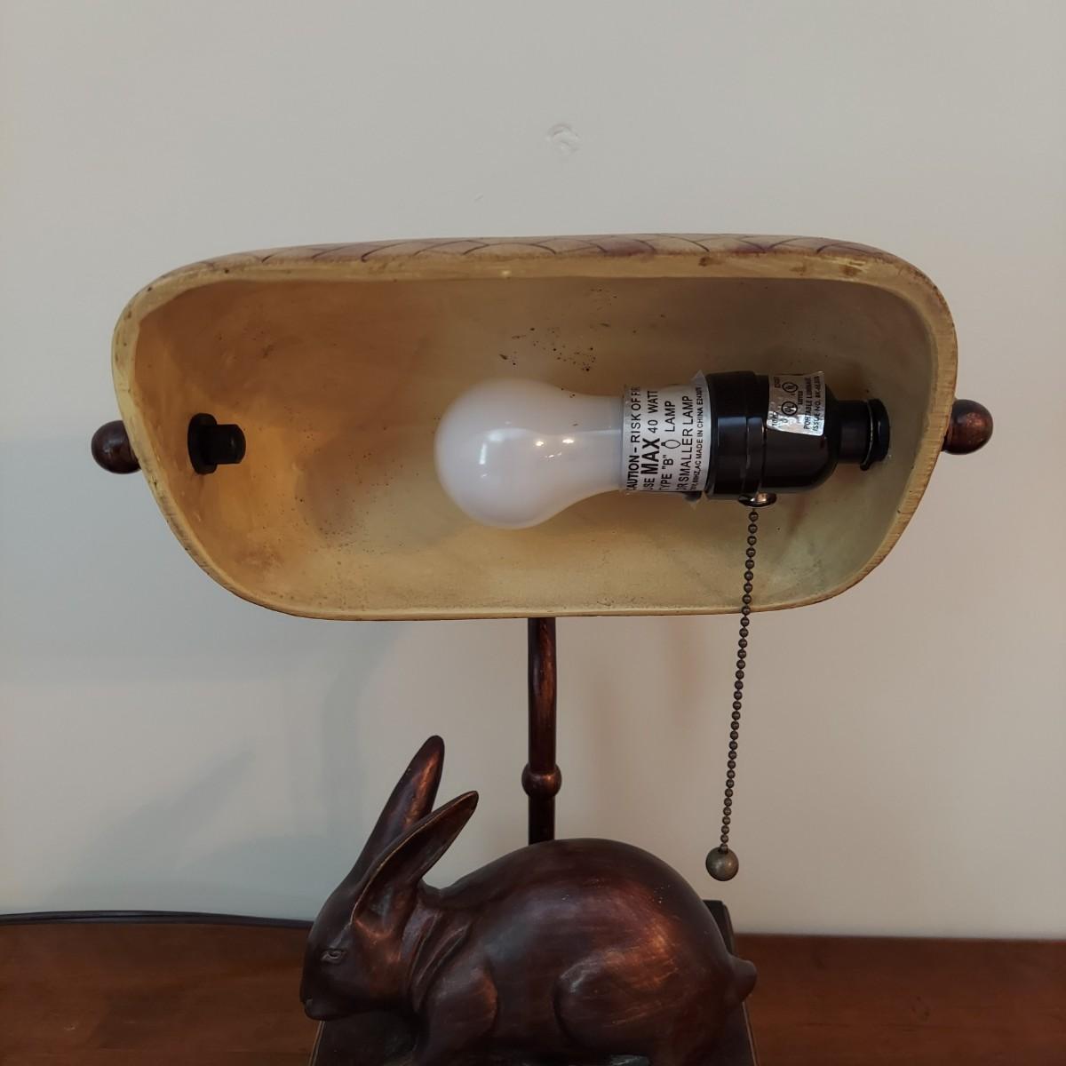 Framed and matted leaf print in wood frame. Measures 26.5" x 26.5"H. Bronze colored rabbit desk lamp measures 11" x 6" x 16"H. Lamp turned on when plugged in. Local Pickup Only.