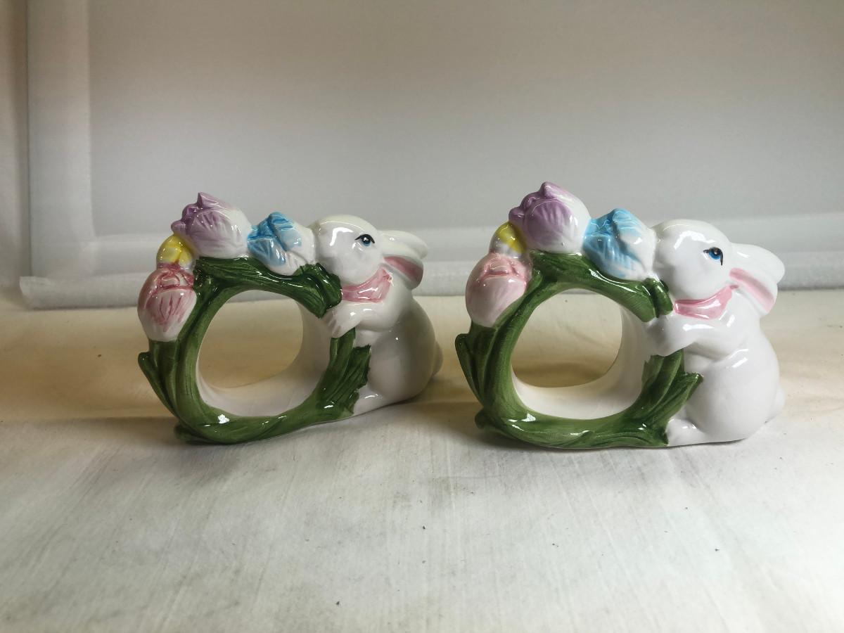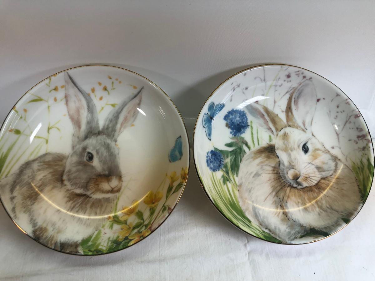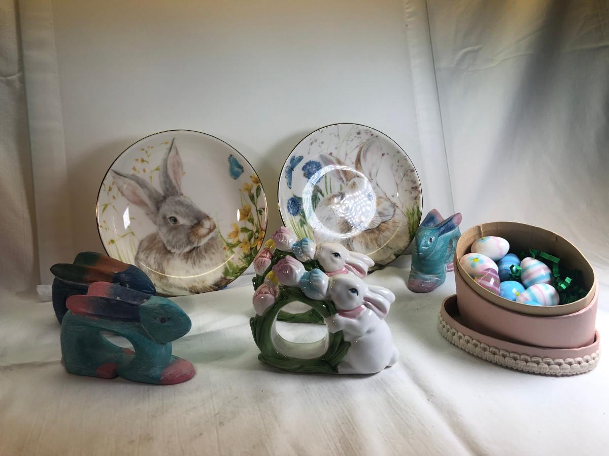 Rabbit plates William Sonoma, 5 Rabbit Napkin rings and a pink basket full of miniature glass eggs.