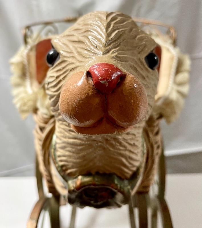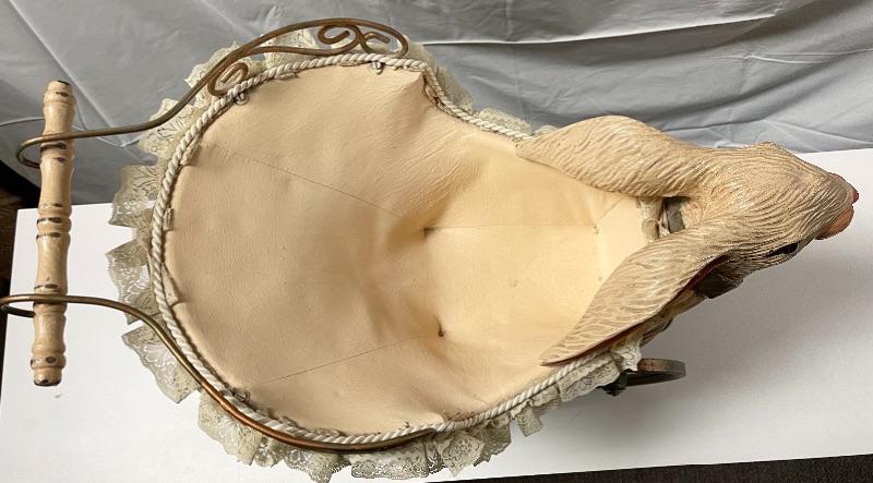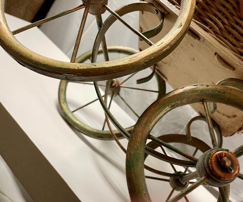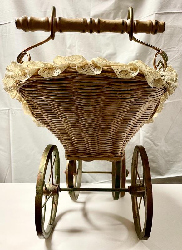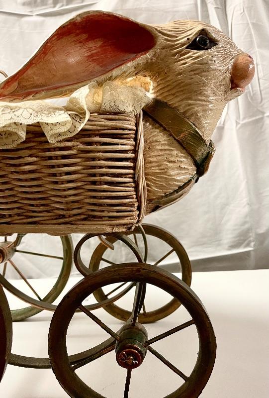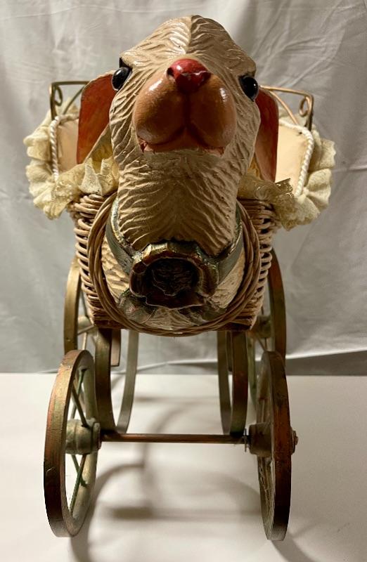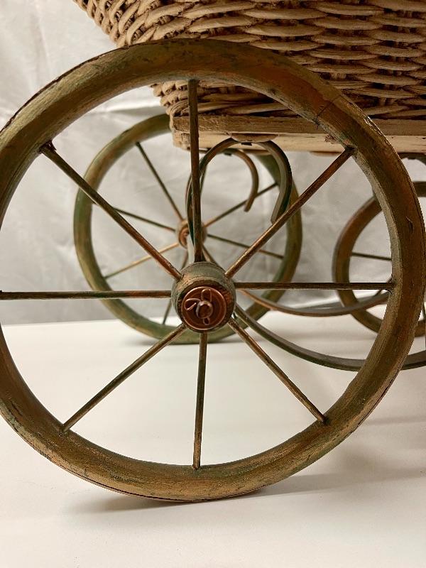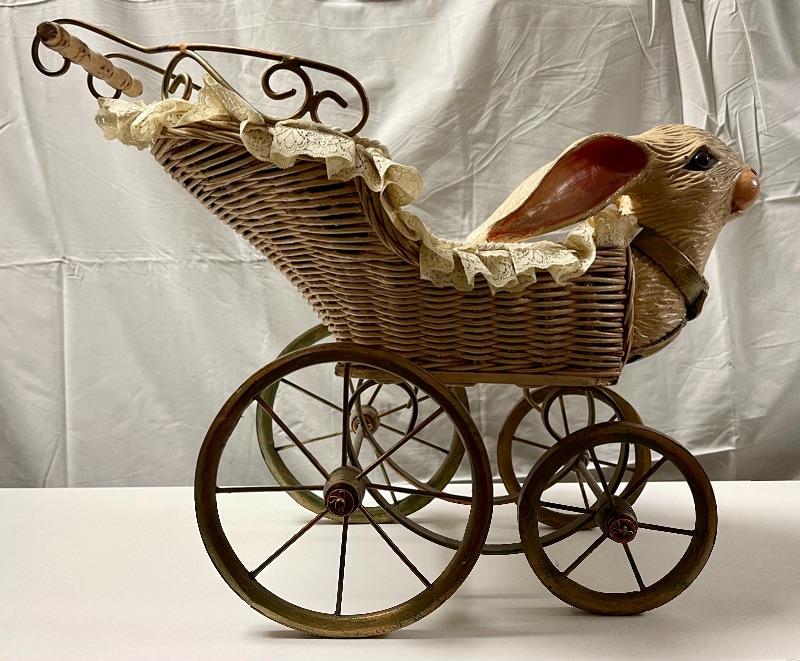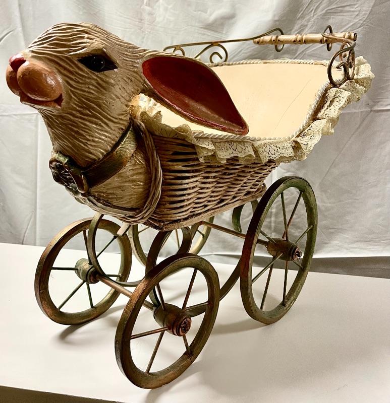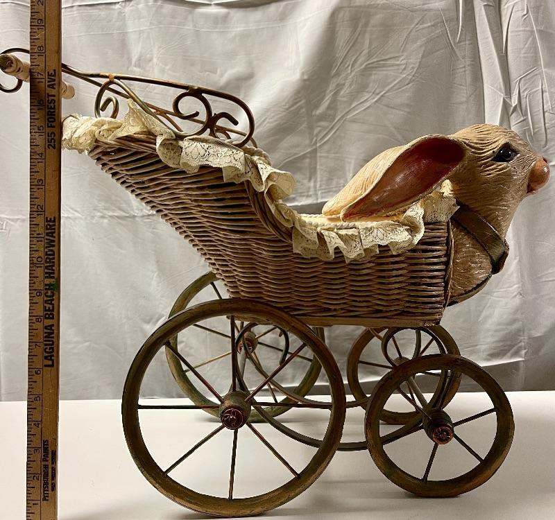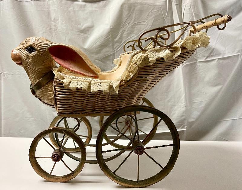 Decorative wicker doll stroller. Has a carved rabbits head at the front. Measures about 23” x 18” x 13”. Displays well.