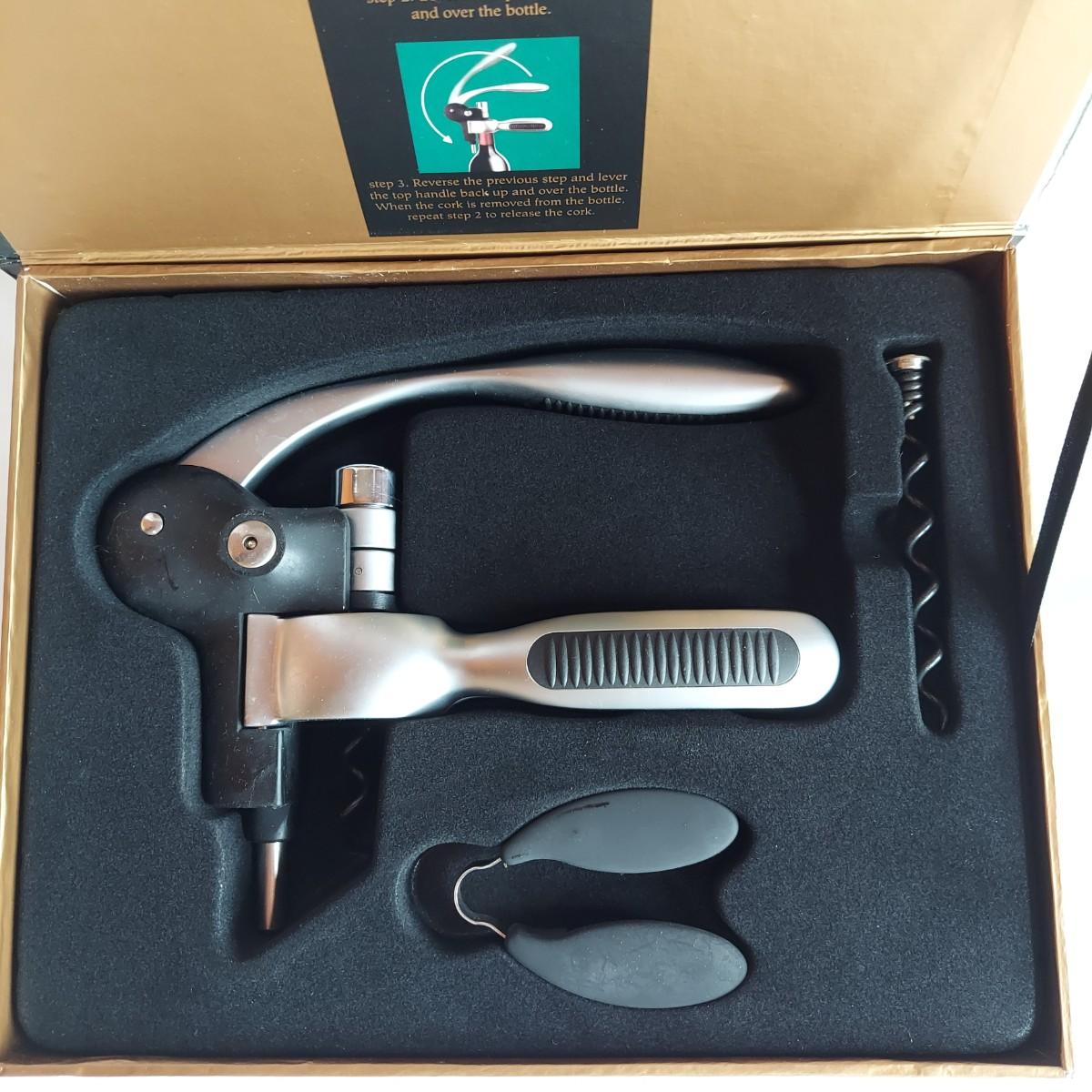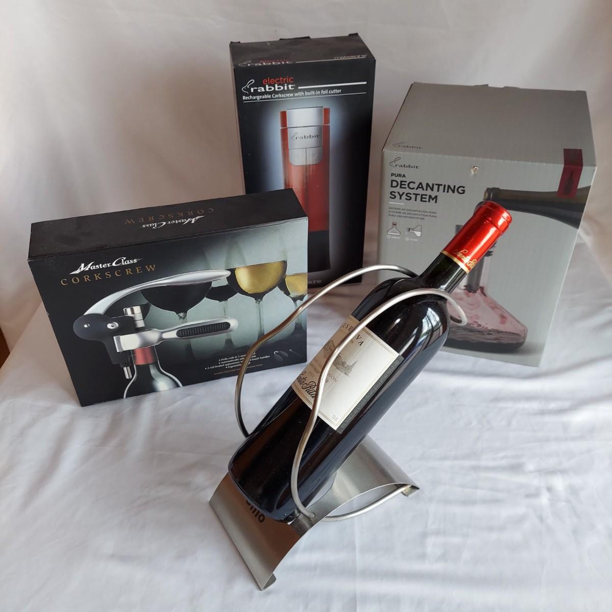 This lot includes many wine tools and accessories. There is a Rabbit brand bottle opener and decanter. The bottle opener has its cord. It plugged in and powered on. The Rabbit decanter has filter and aeration system. There is a Brookstone battery operated wine aerator made to aerate in the glass. There is also a Master Class brand manual bottle opener and a Cilio metal bottle holder. Wine is not included in lot! Shipping available. Shipping can be costly. We suggest contacting our preferred local shipping provider, Postage Express, with dimensions and getting an estimate before bidding: (828) 670-5501or postageexpress@yahoo.com.