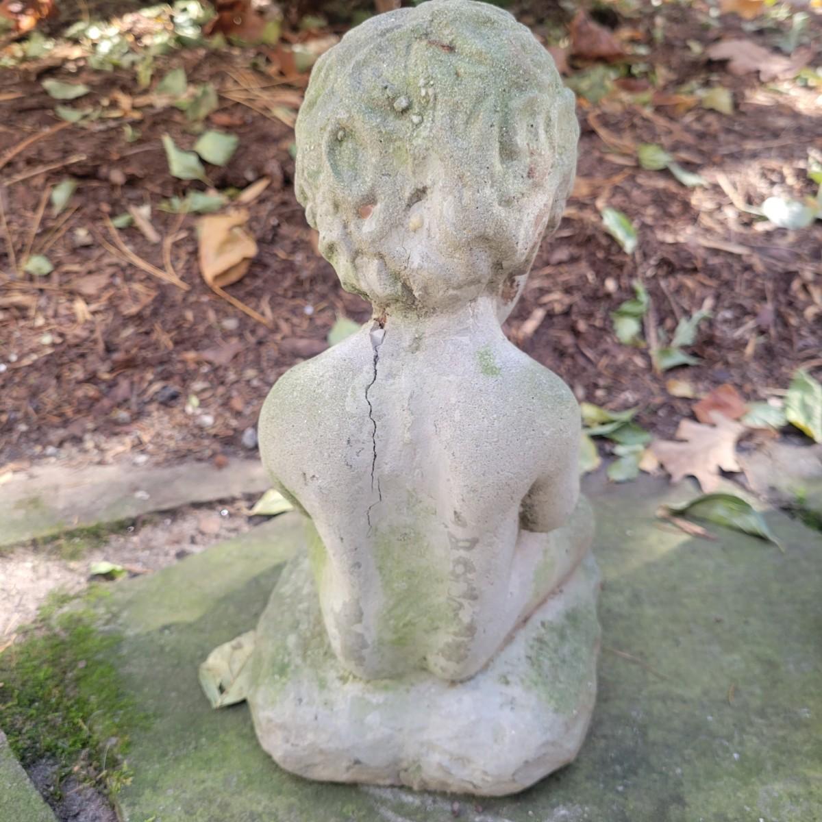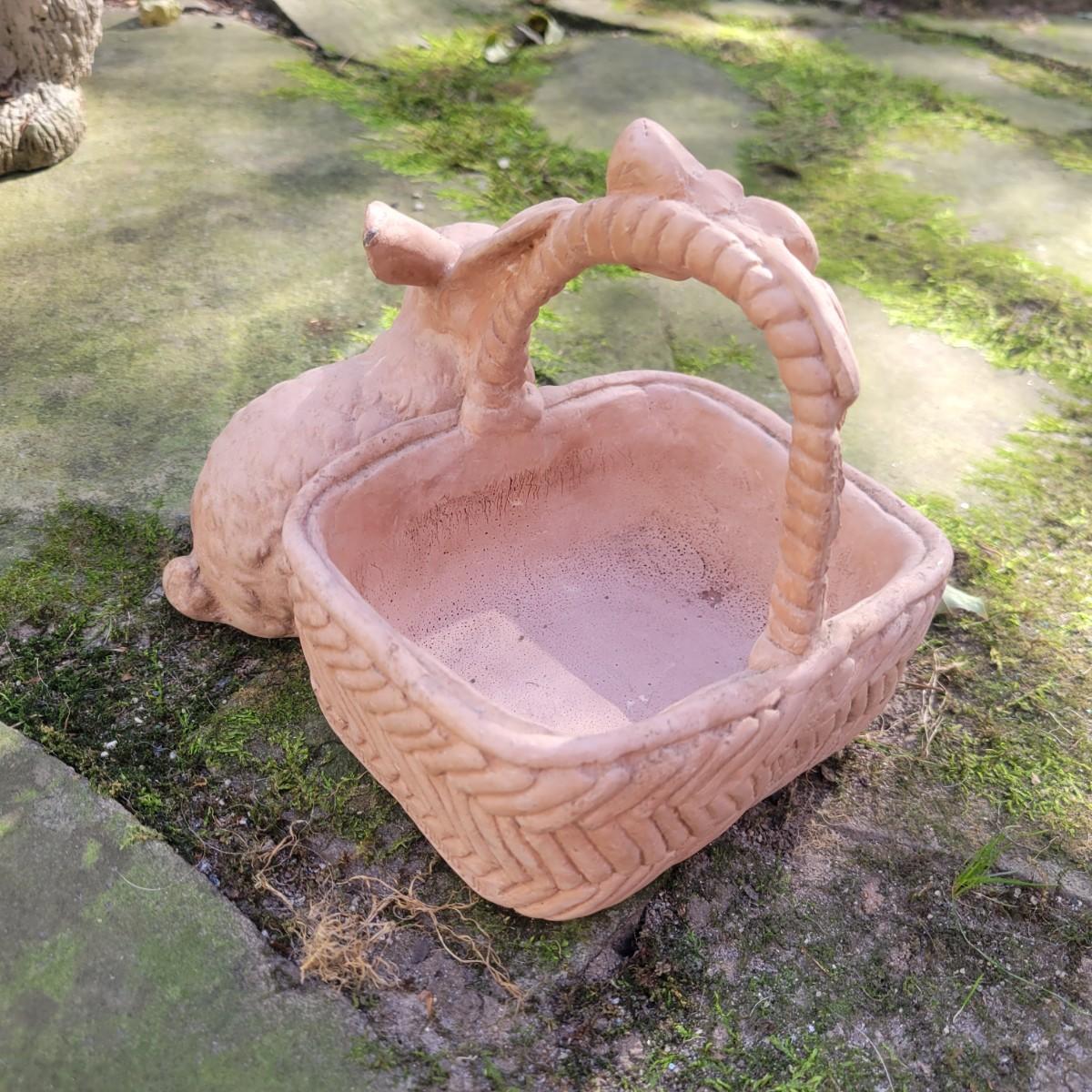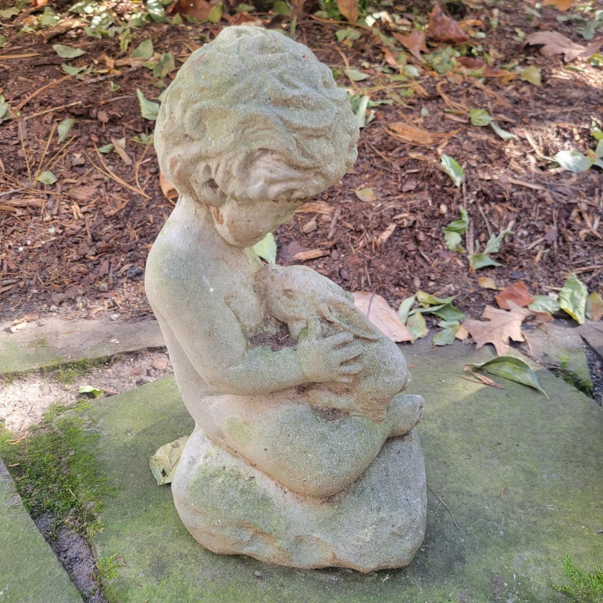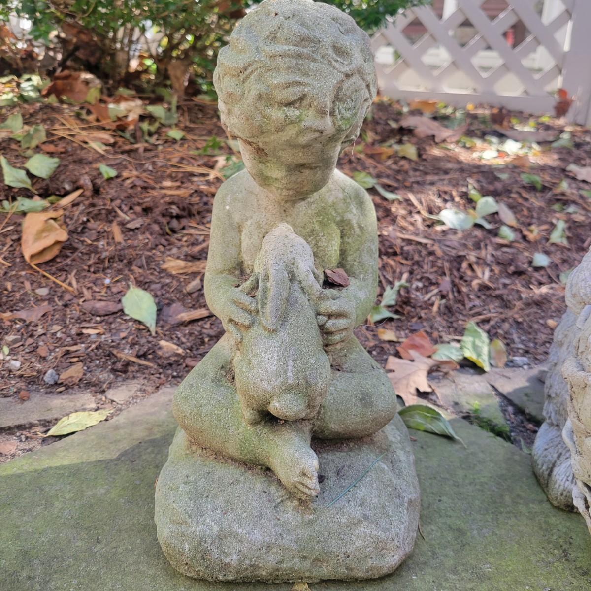A collection of yard decor items that have rabbits. The two small black rabbits appear to made of cast resin and the pinkish rabbit and basket appears to be unglazed ceramic. The remaining pieces are all cement. The largest rabbit measures approximately 8" x 14" x 15" and has broken ears. The boy holding the rabbit also has a crack. Local pickup only