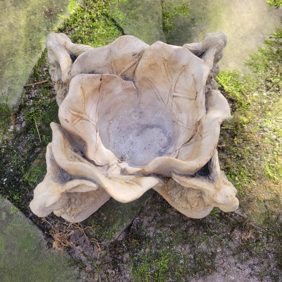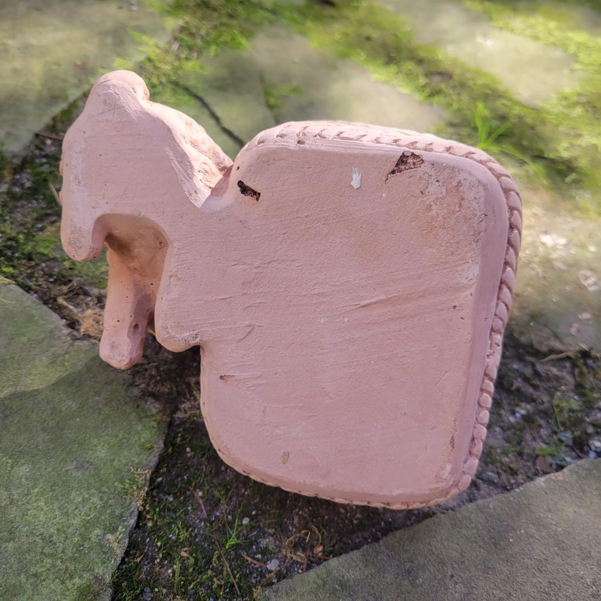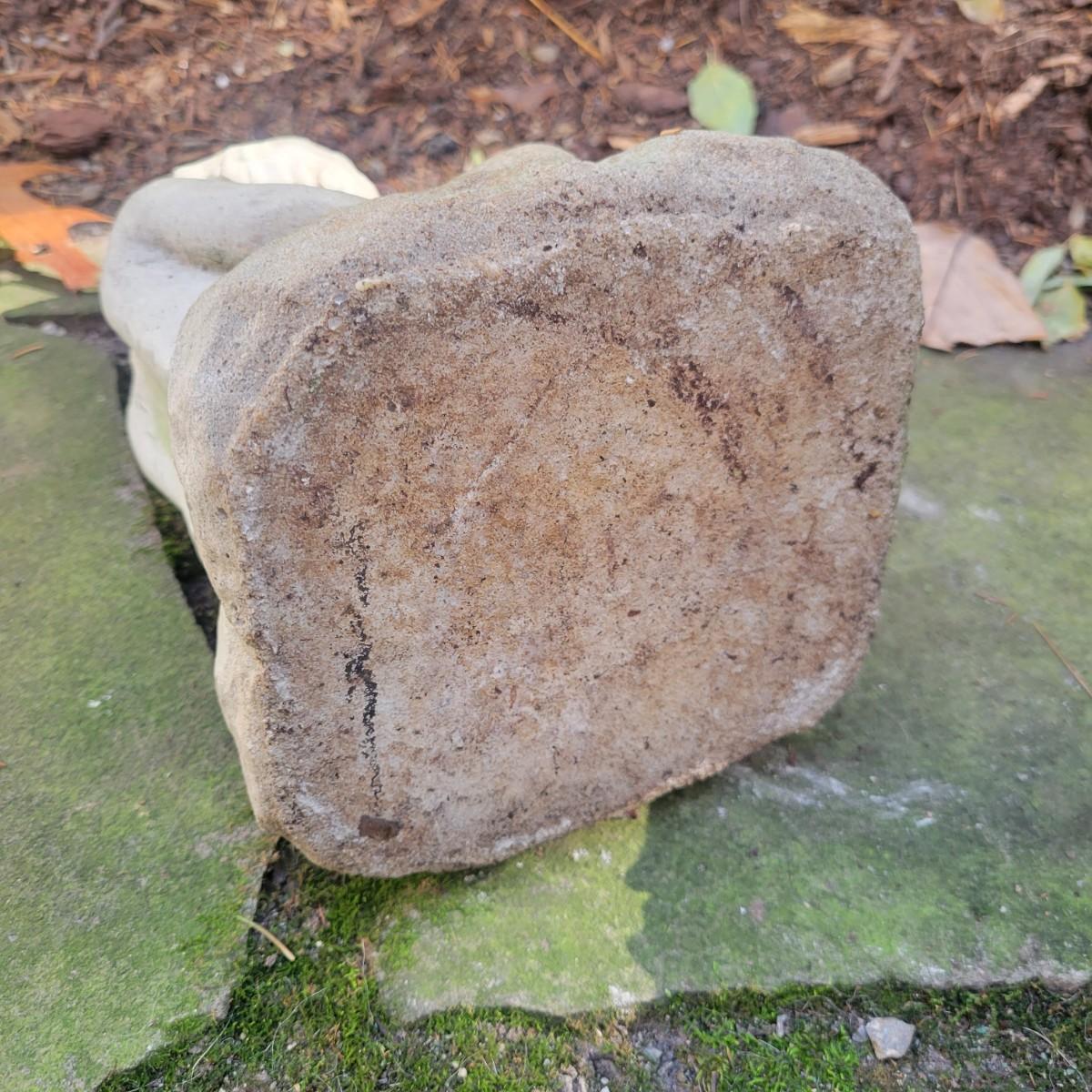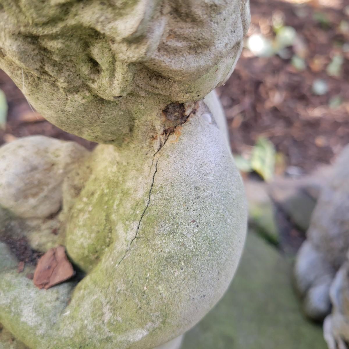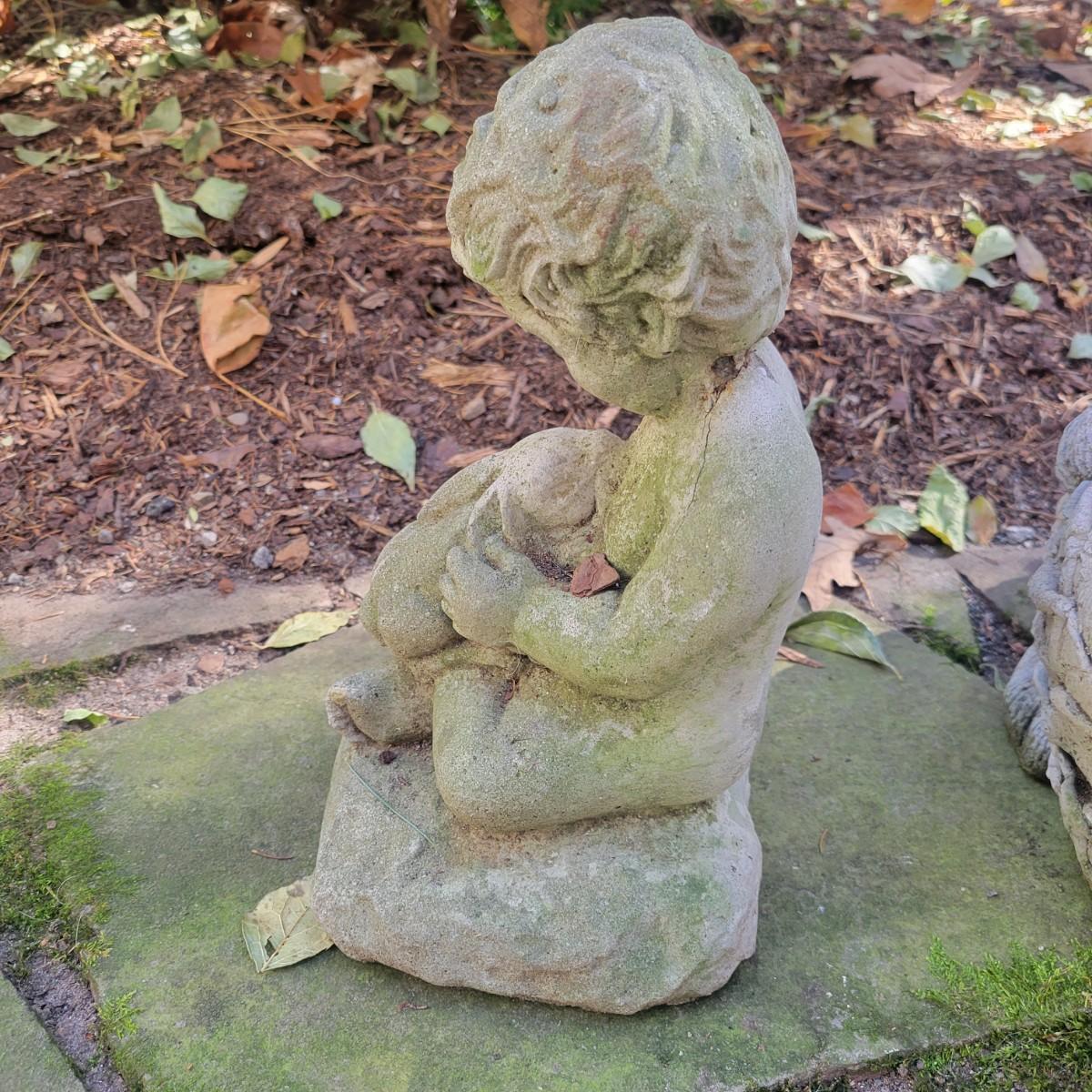 A collection of yard decor items that have rabbits. The two small black rabbits appear to made of cast resin and the pinkish rabbit and basket appears to be unglazed ceramic. The remaining pieces are all cement. The largest rabbit measures approximately 8" x 14" x 15" and has broken ears. The boy holding the rabbit also has a crack. Local pickup only