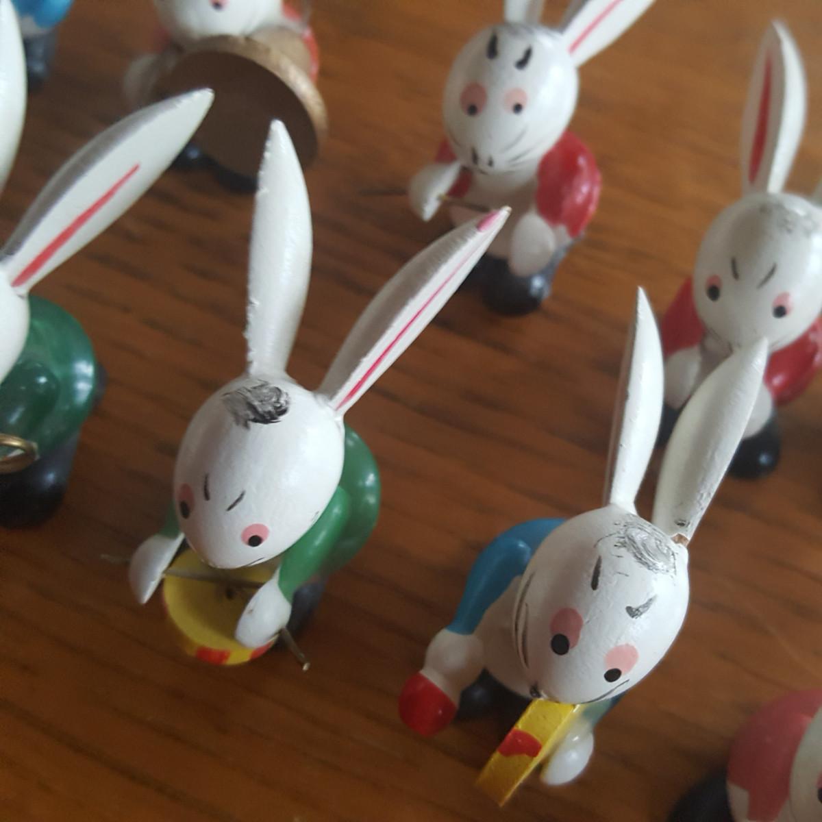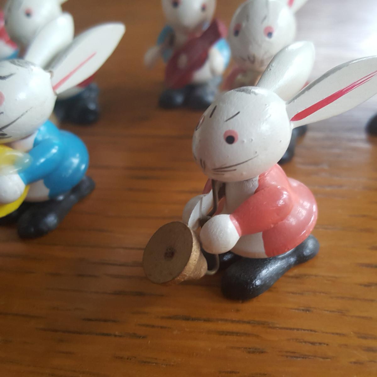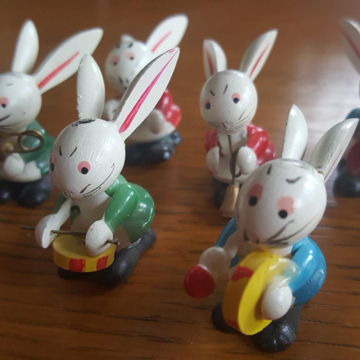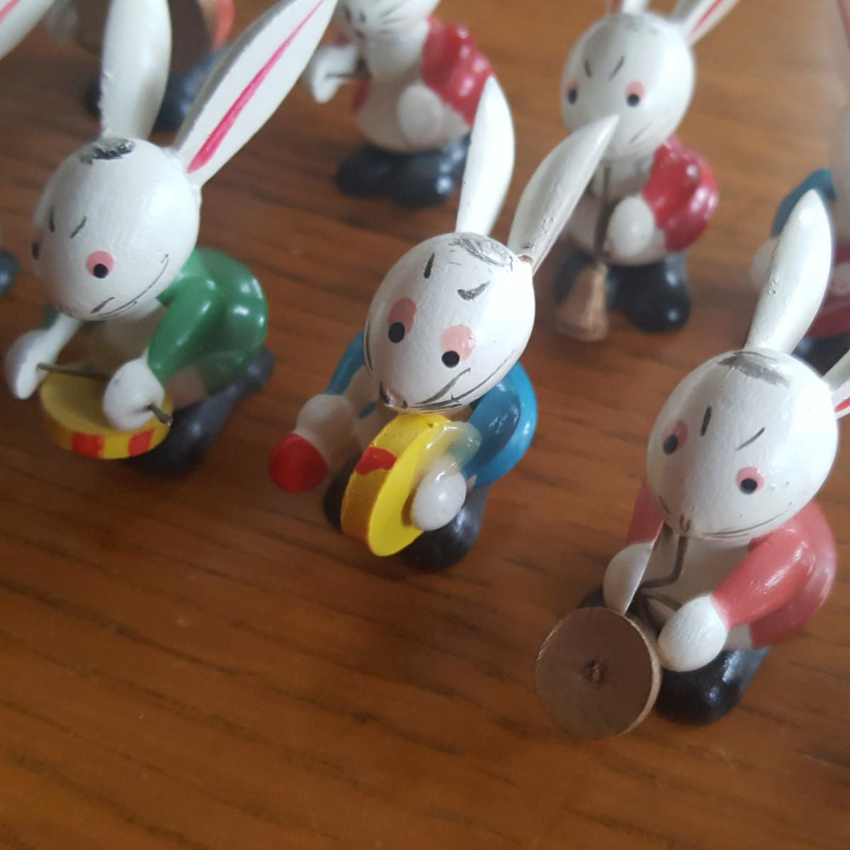 This auction lot is for A Vintage Marching Band of Rabbits. This collection of 12 diminutive marching hares is quite the gathering. Each stands about 1.25-inches tall and are marked Japan on the bottom of the foot. The band has tubas, bells, guitars, drums and cymbals among others. So cute and perfect for a shelf display