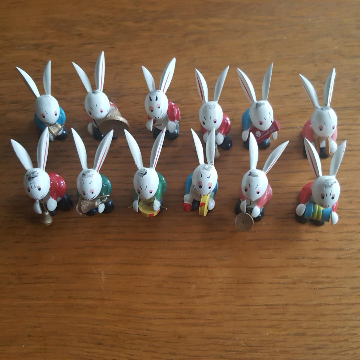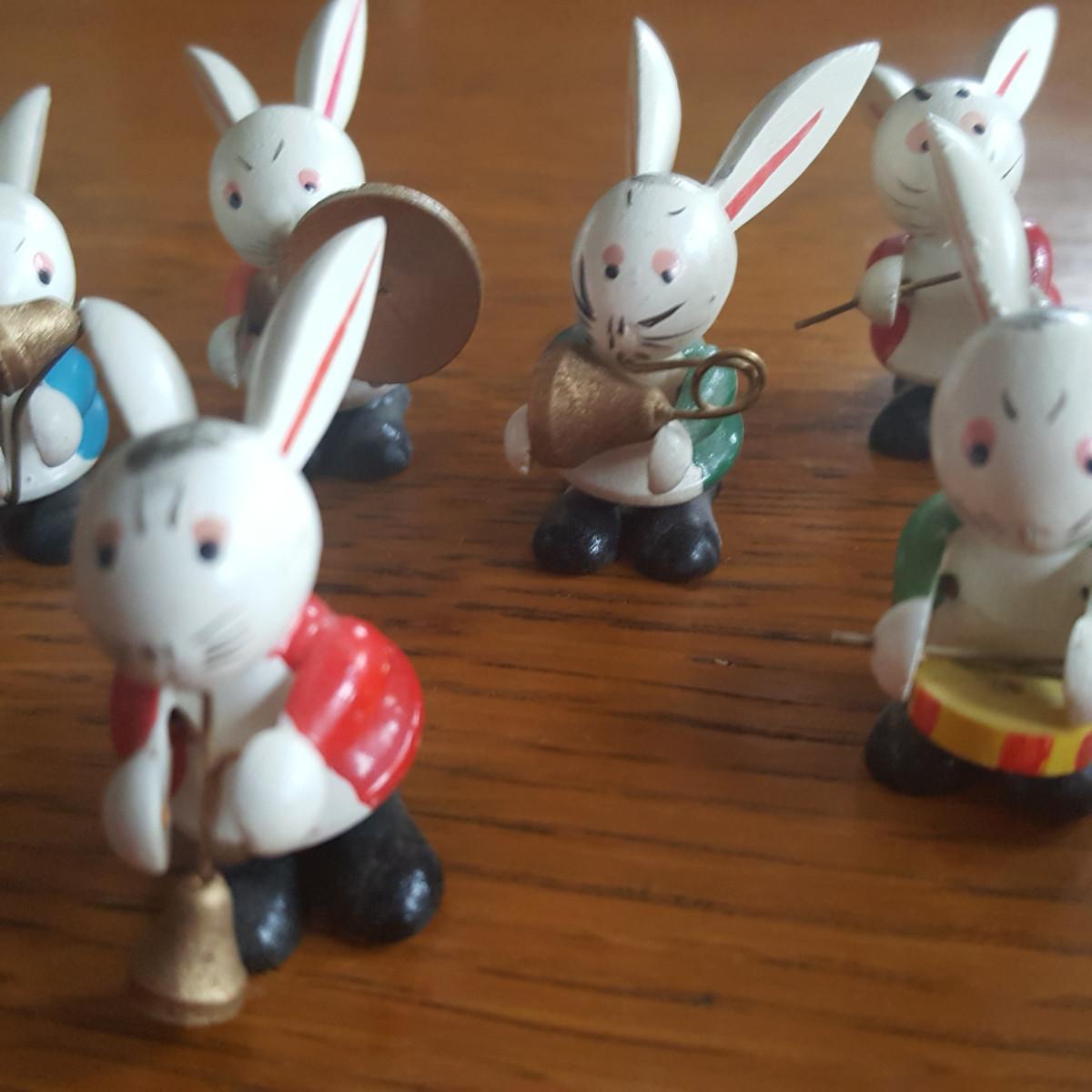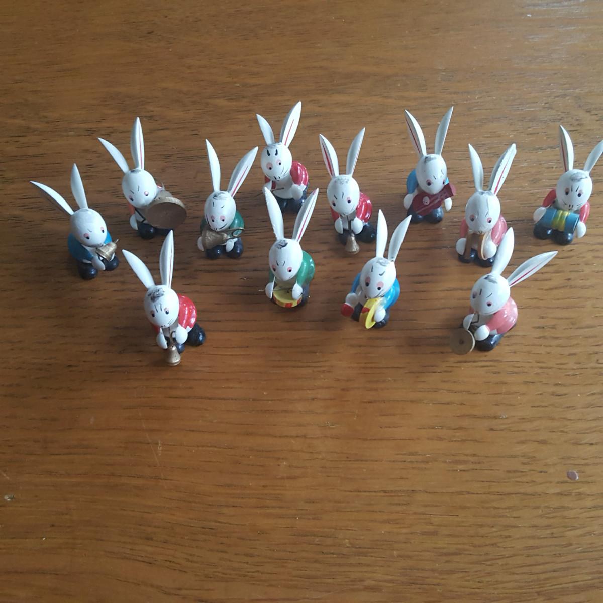 This auction lot is for A Vintage Marching Band of Rabbits. This collection of 12 diminutive marching hares is quite the gathering. Each stands about 1.25-inches tall and are marked Japan on the bottom of the foot. The band has tubas, bells, guitars, drums and cymbals among others. So cute and perfect for a shelf display