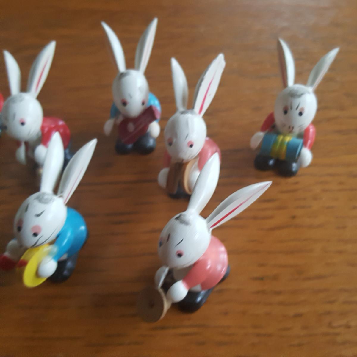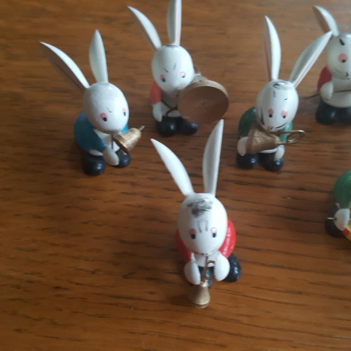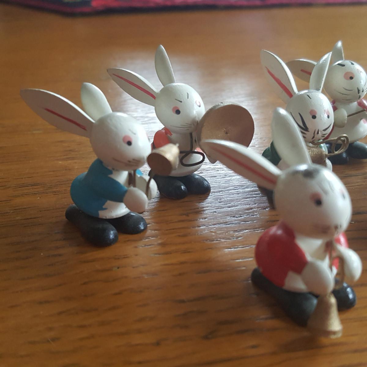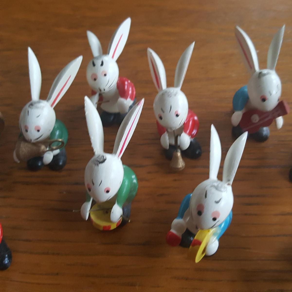 This auction lot is for A Vintage Marching Band of Rabbits. This collection of 12 diminutive marching hares is quite the gathering. Each stands about 1.25-inches tall and are marked Japan on the bottom of the foot. The band has tubas, bells, guitars, drums and cymbals among others. So cute and perfect for a shelf display