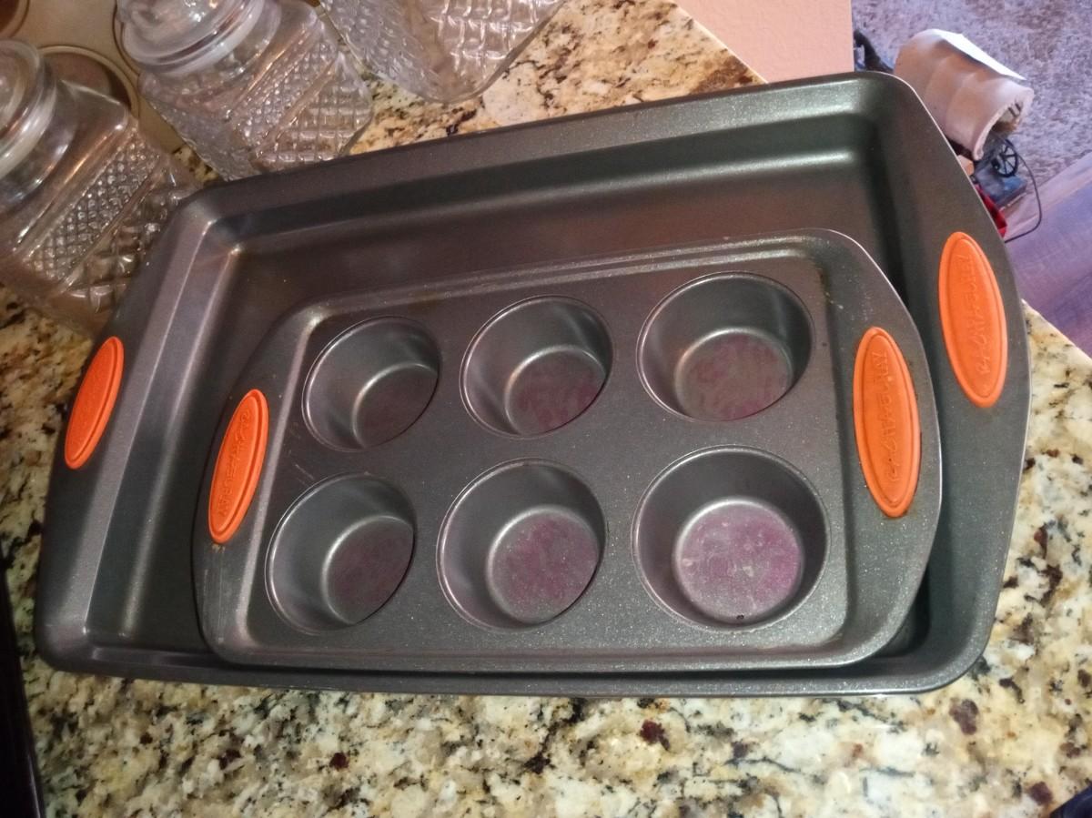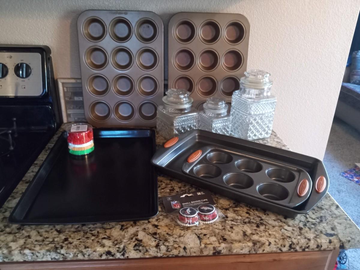 RACHAEL RAY BAKING PANS, MUFFIN PANS COOKIE SHEET AND GLASS CANISTERS