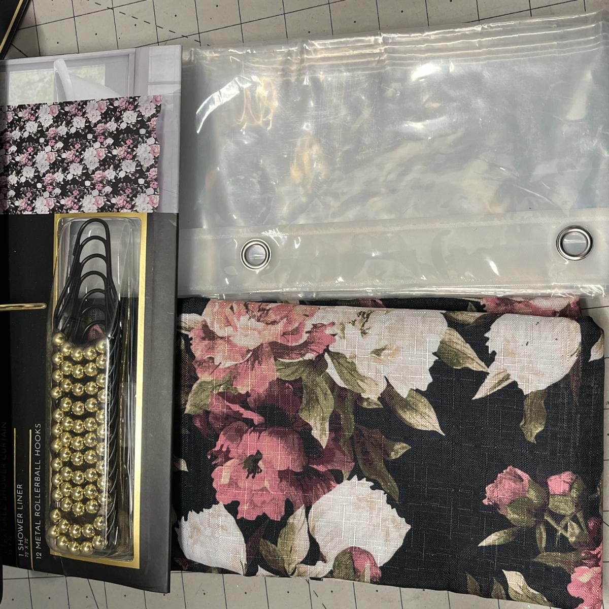 Includes 72×72 curtain, liner, 12 metal rollerball hooks, floral.