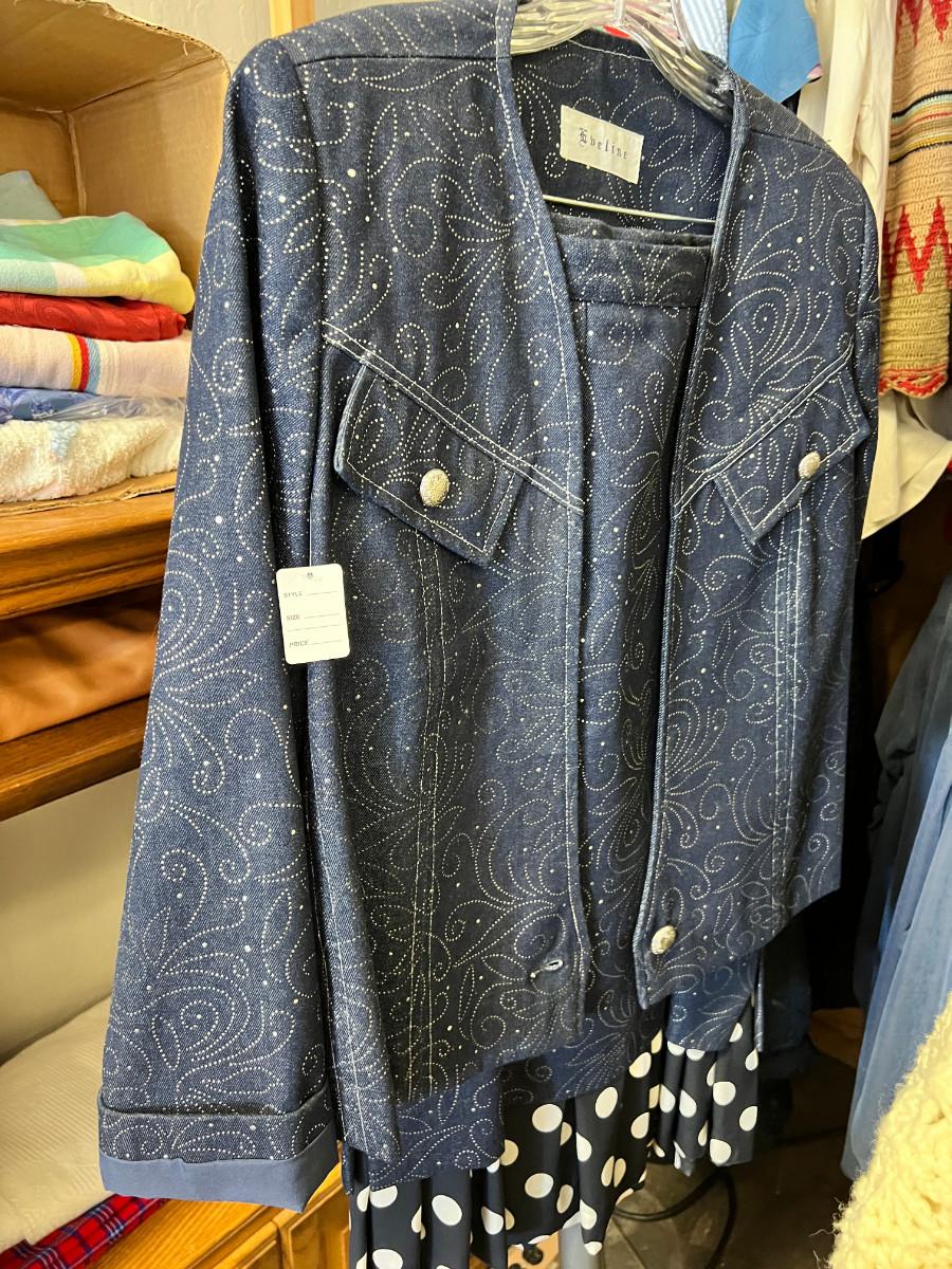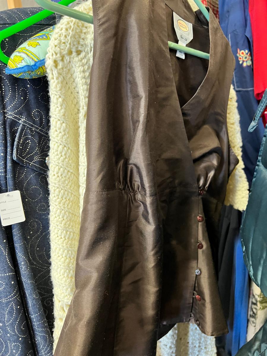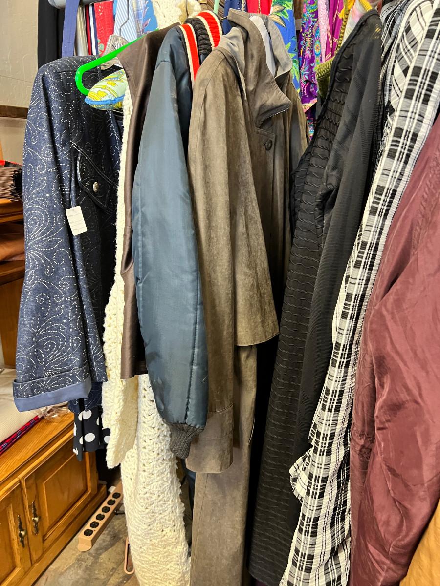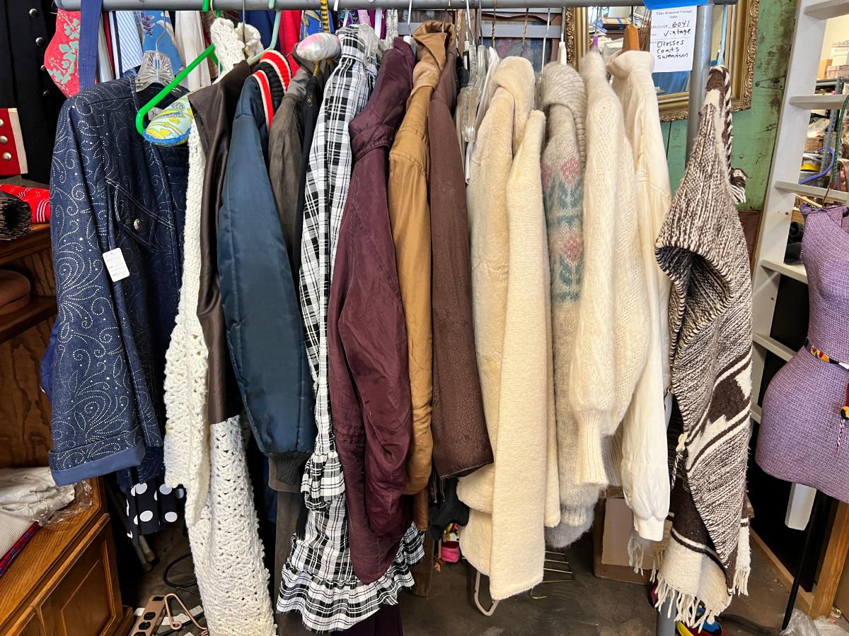 Rack of vintage clothing Crocheted sweater , Silk jackets