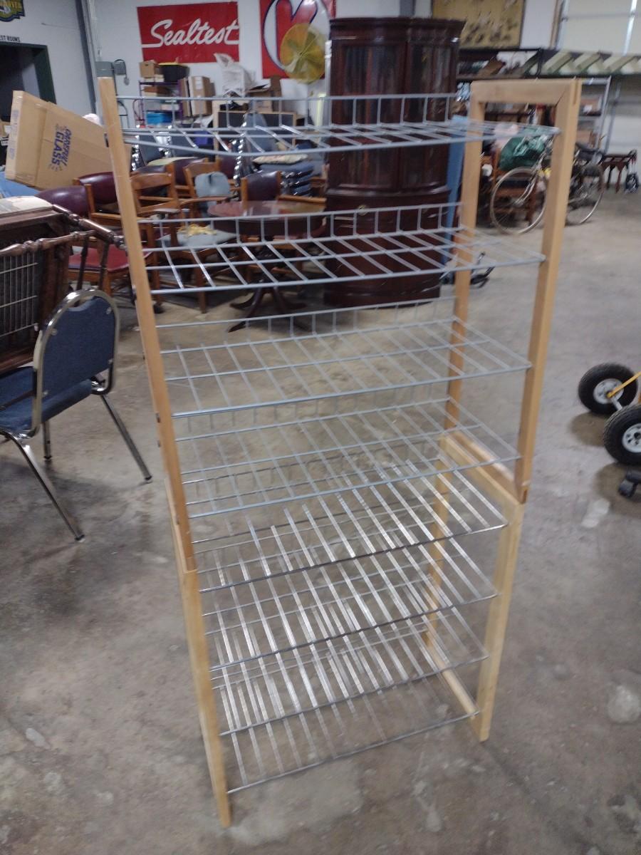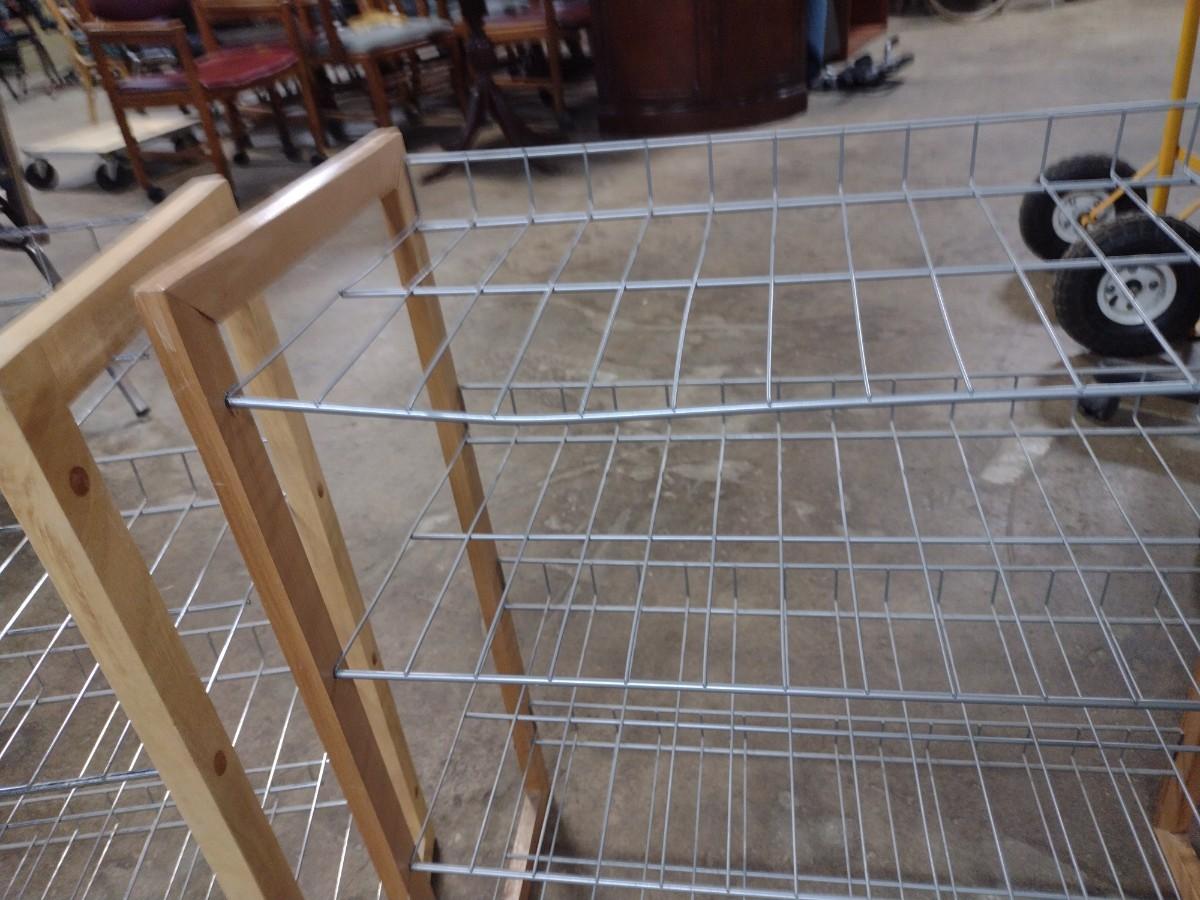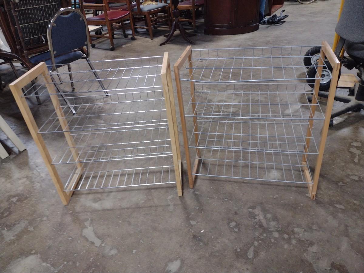 Pair of Wire Shelf Racks with Wood Frame one shelf of rack is slightly bent as shown