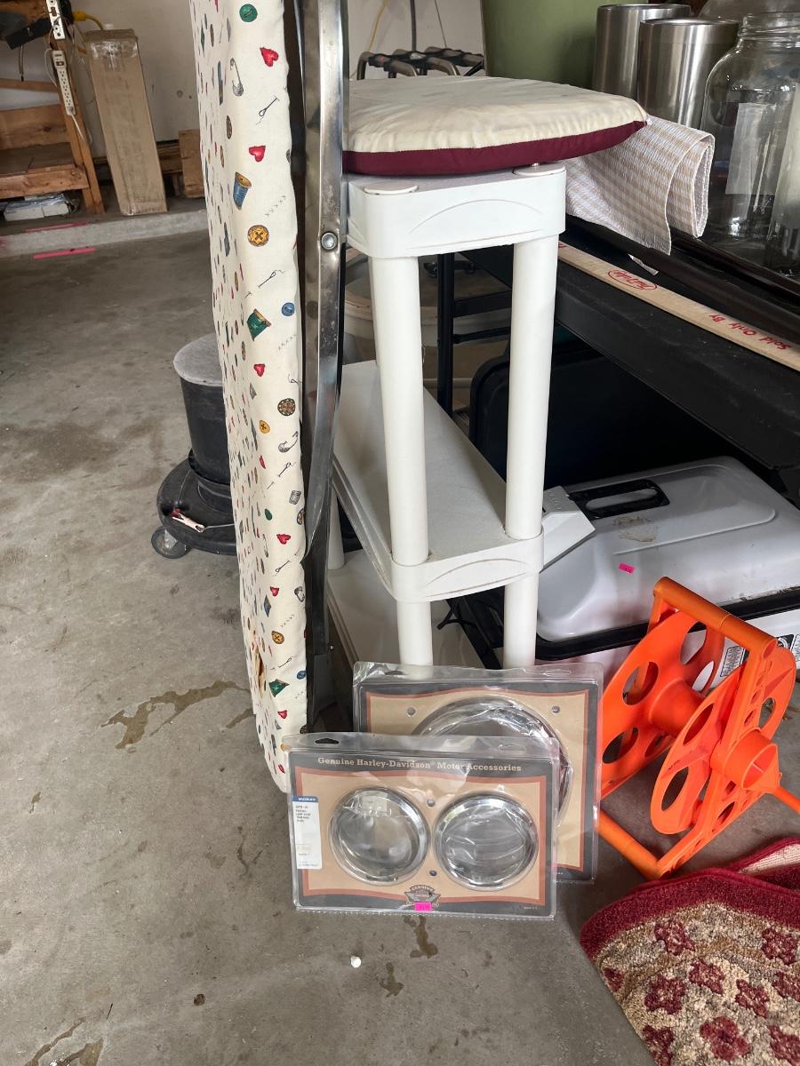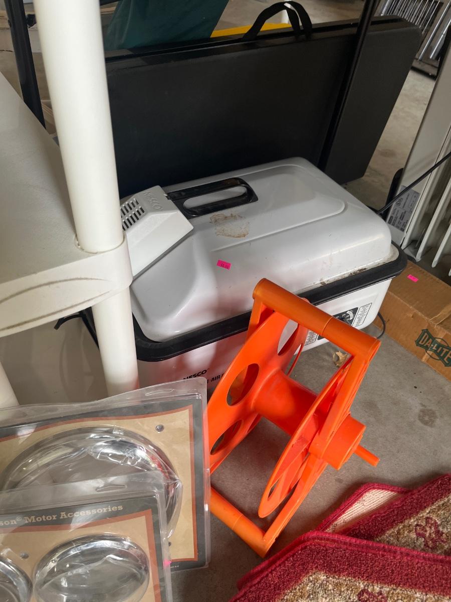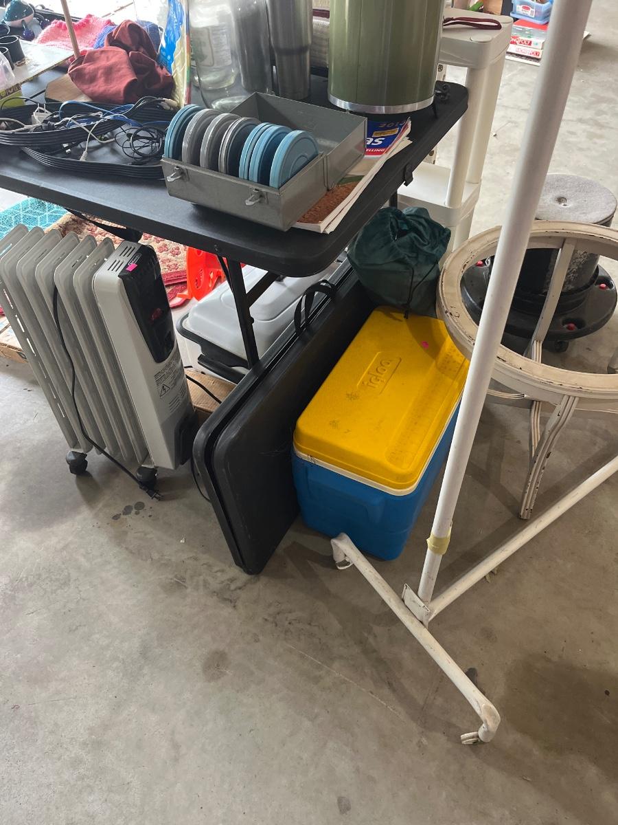 Misc. items, ice chest, radiant heater, ironing board, roaster, rugs, clothes rack