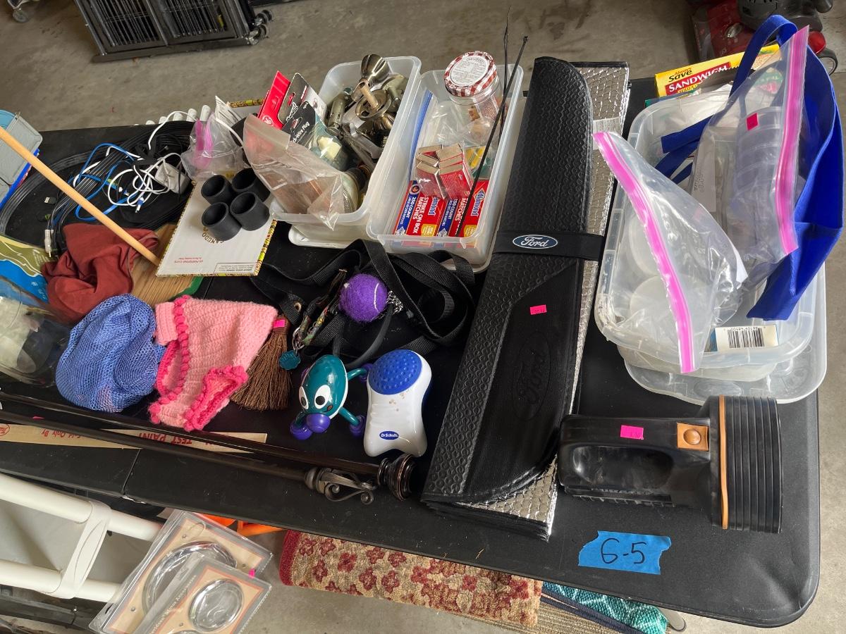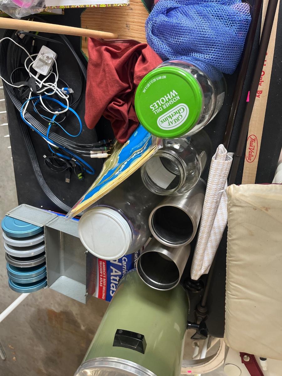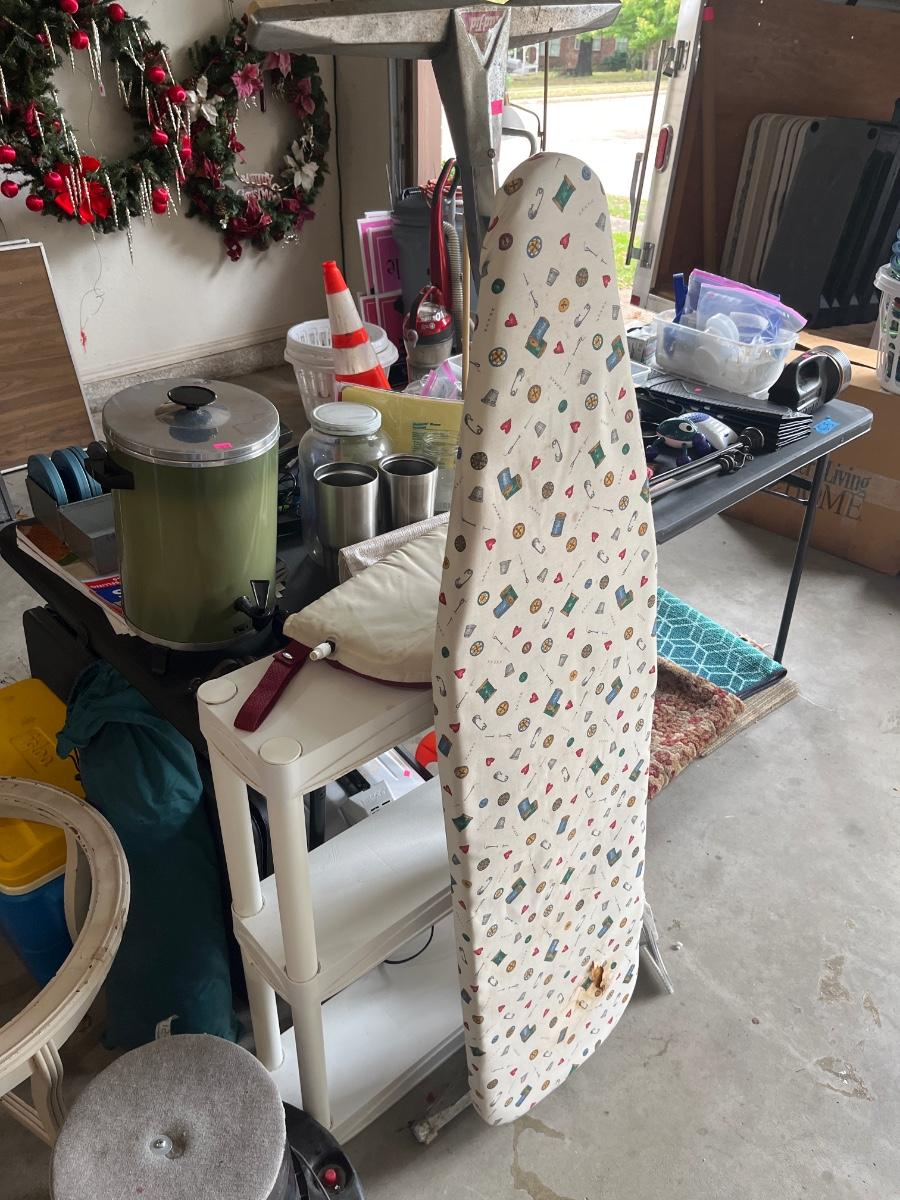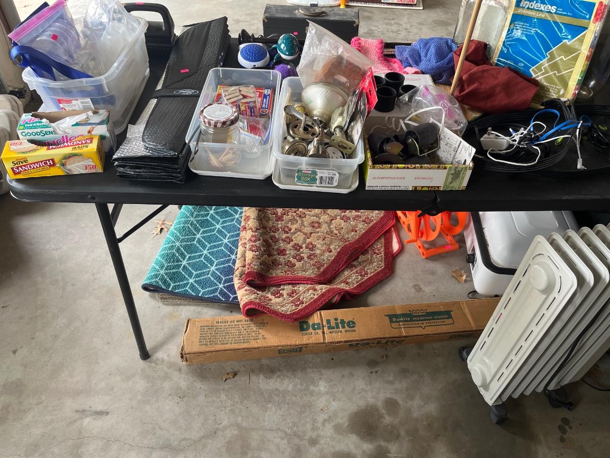 Misc. items, ice chest, radiant heater, ironing board, roaster, rugs, clothes rack