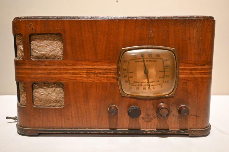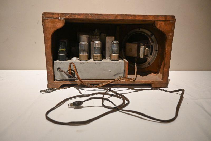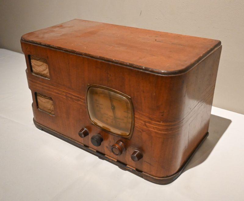 An antique radio. Wood, mixed media. Approx. 16.5" x 8.5" x 9.5". Please note, this radio has not been tested. Assume it no longer functions.