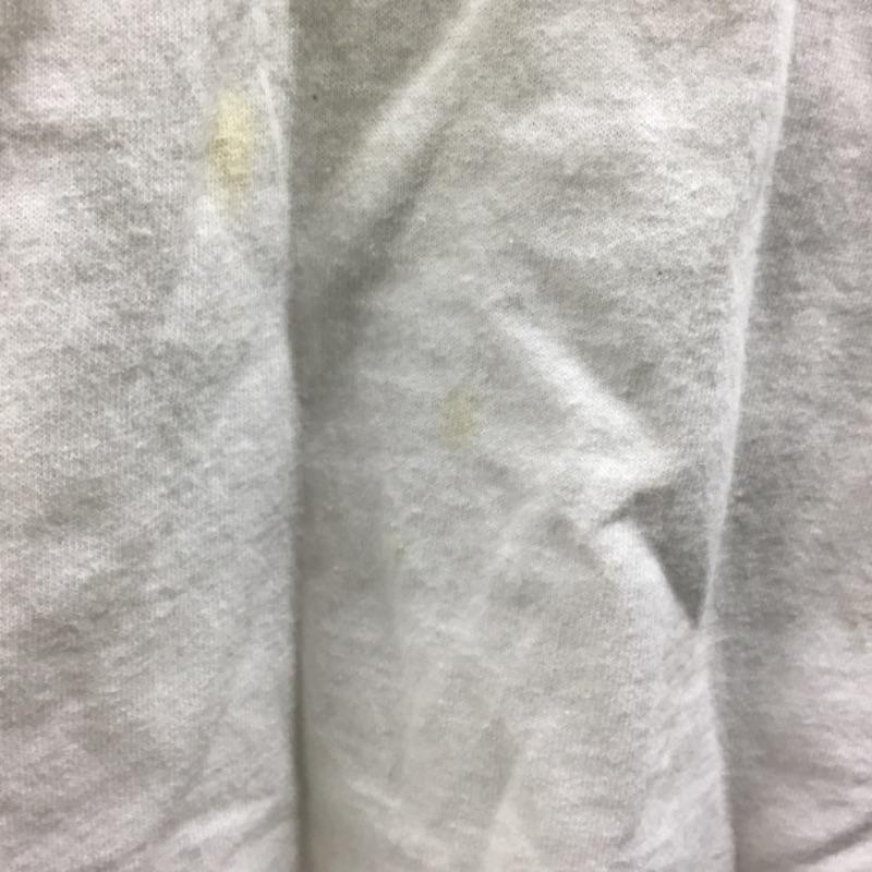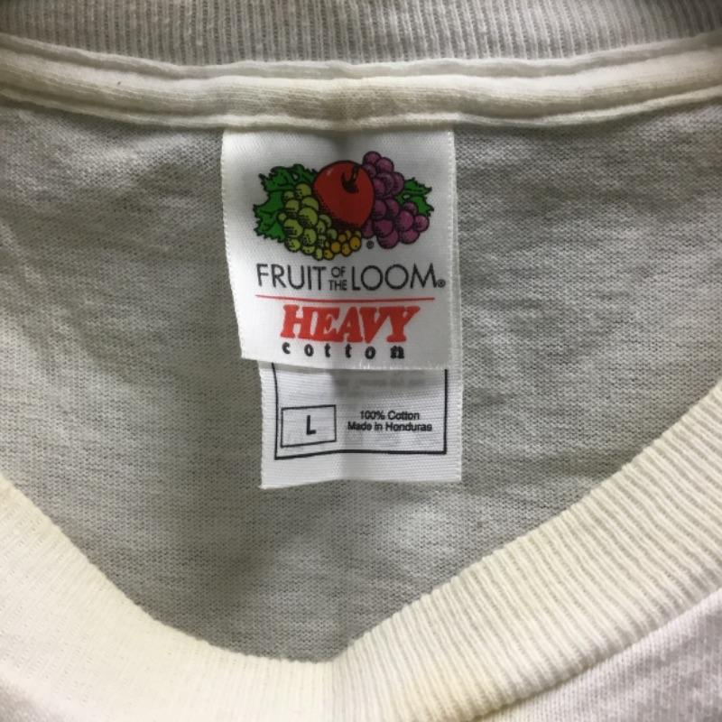 Up for auction is a T-shirt in a size adult large. The T-shirt it’s in worn condition and generally yellowed. There are severe sweat stains on both sides of the entire collar. There are also numerous grease stains on the front of the shirt as well; see pictures.