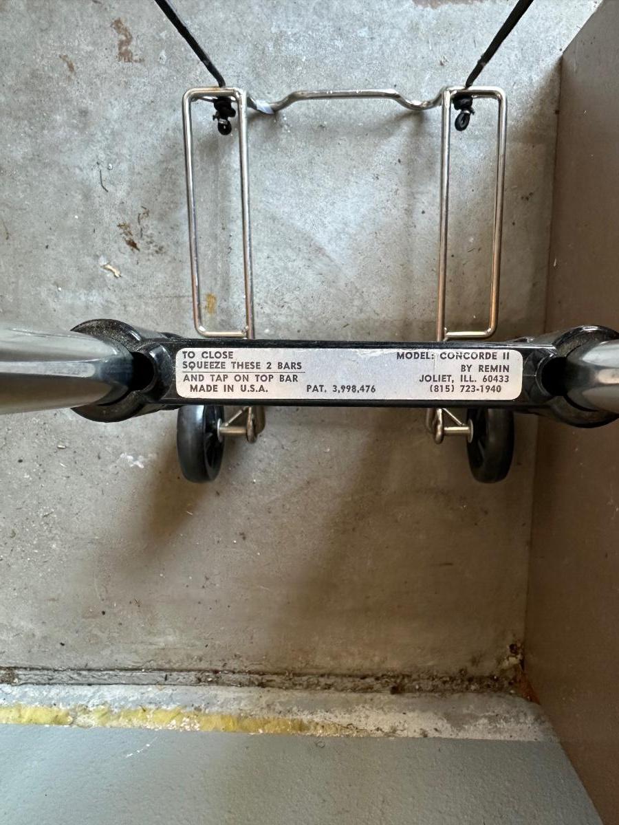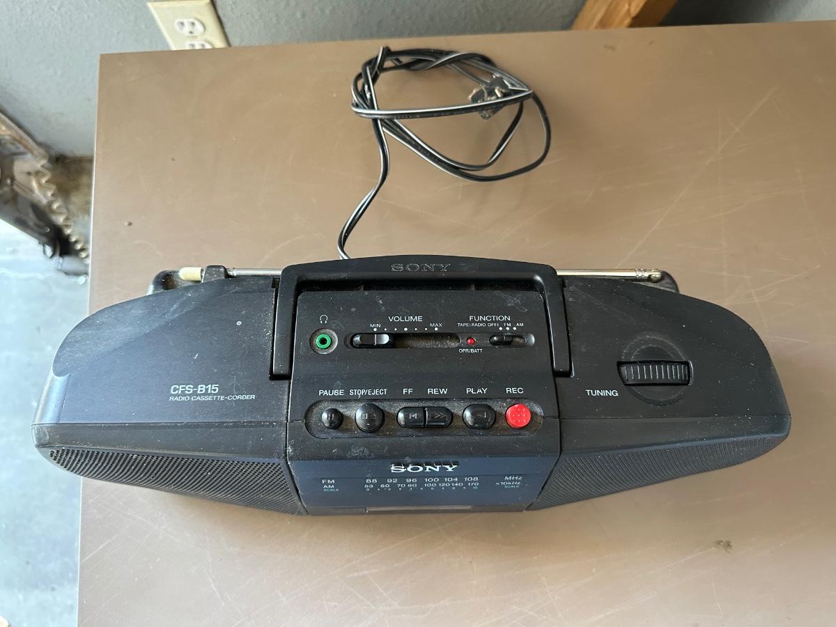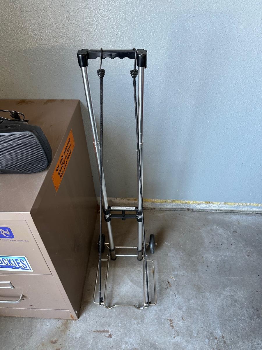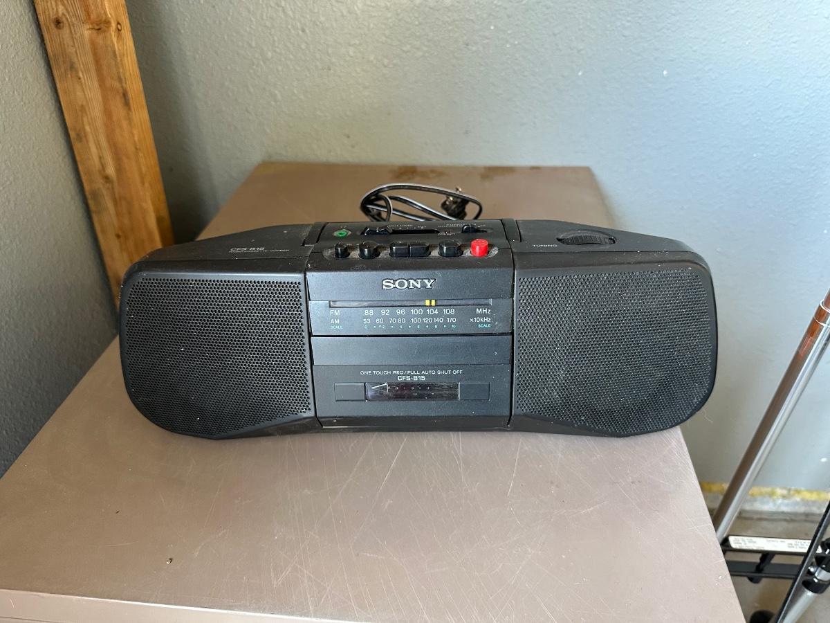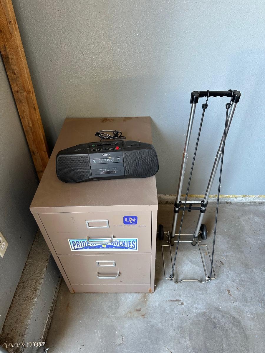 SONY PORTABLE AM/FM RADIO, FILE CABINET AND A LUGGAGE DOLLY