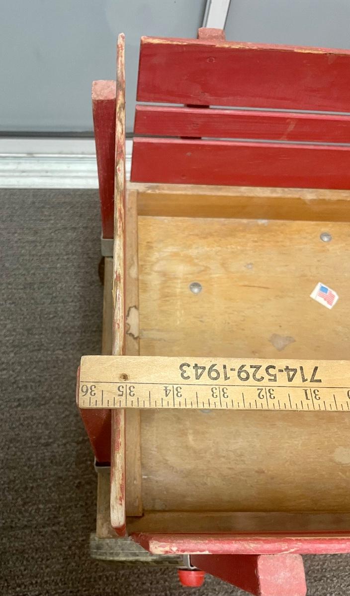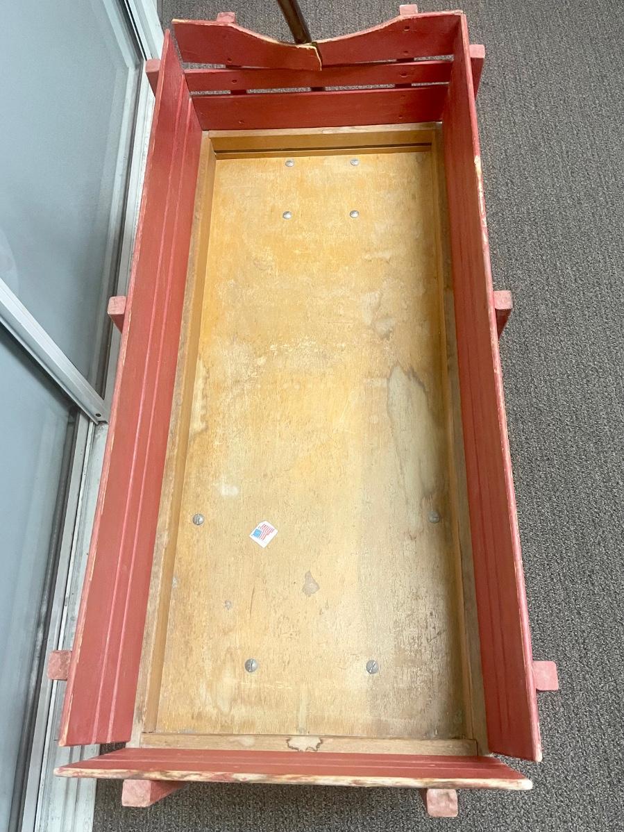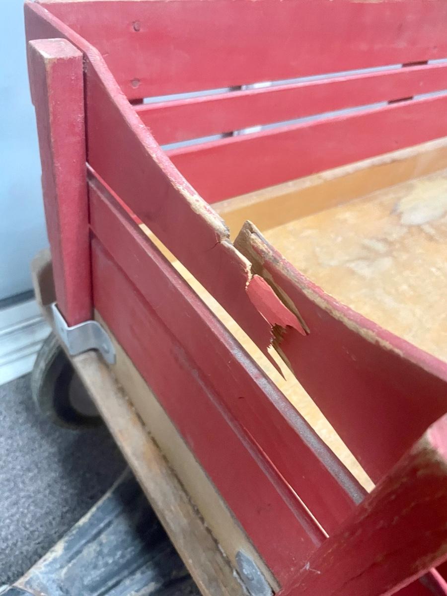 Used condition, with wood platform, removable wood stake sides. Note damage to front stake, top rail is broken. See pictures for details of condition.