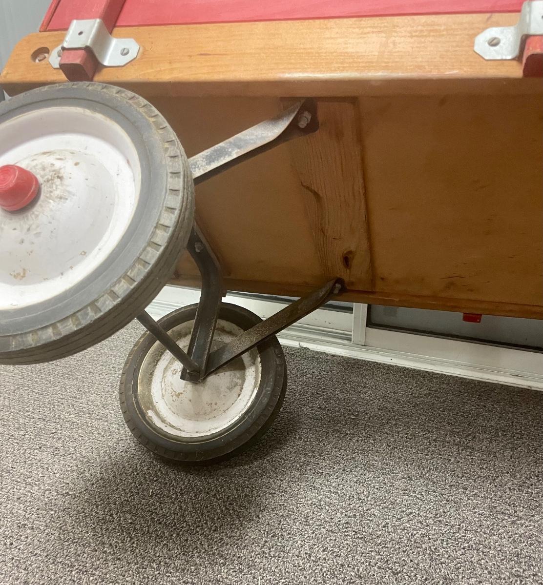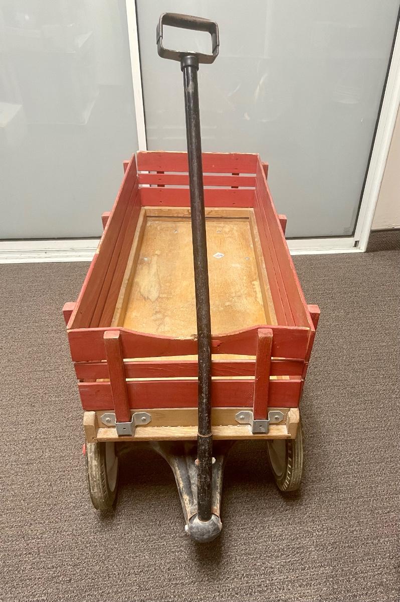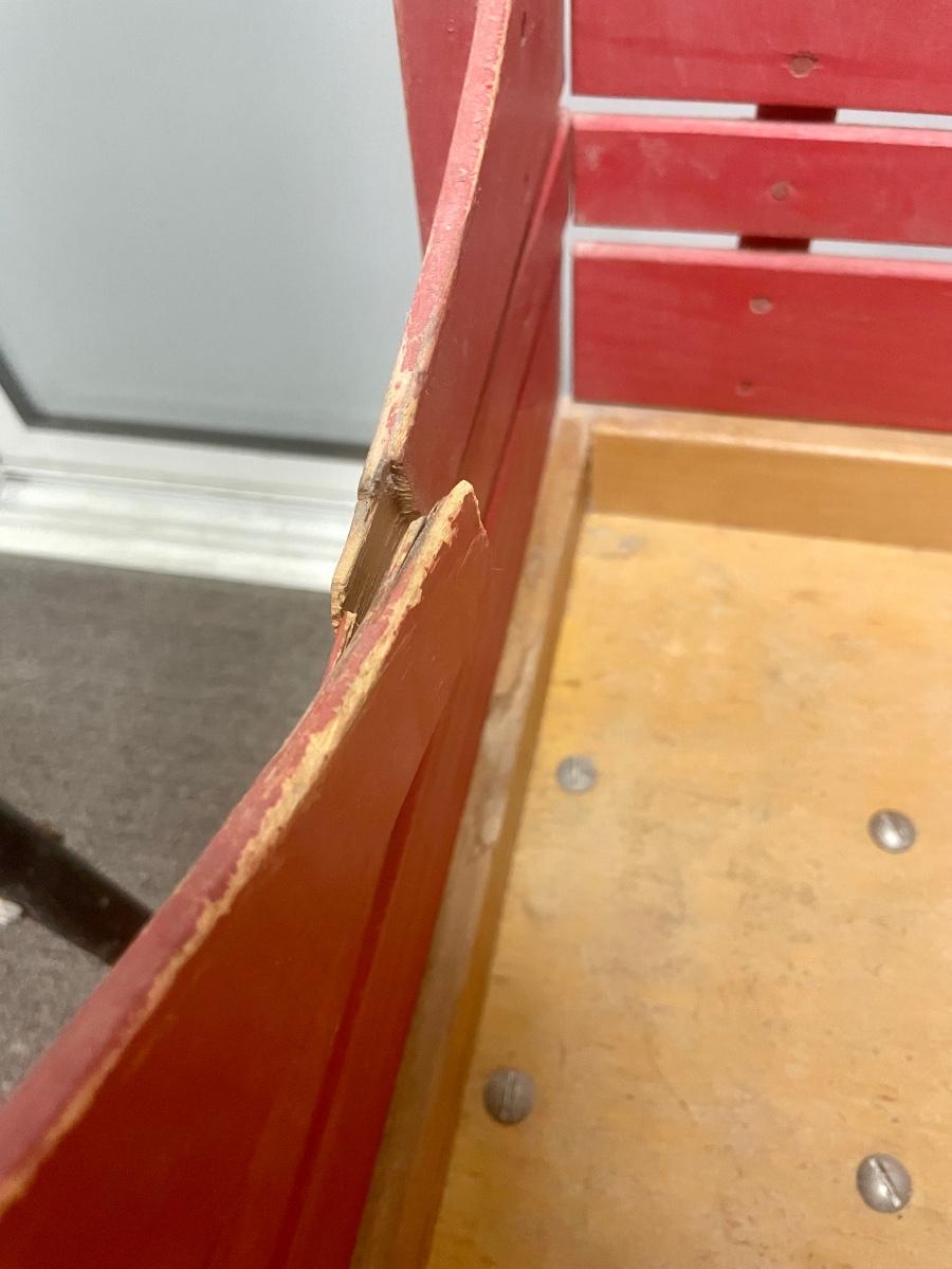 Used condition, with wood platform, removable wood stake sides. Note damage to front stake, top rail is broken. See pictures for details of condition.
