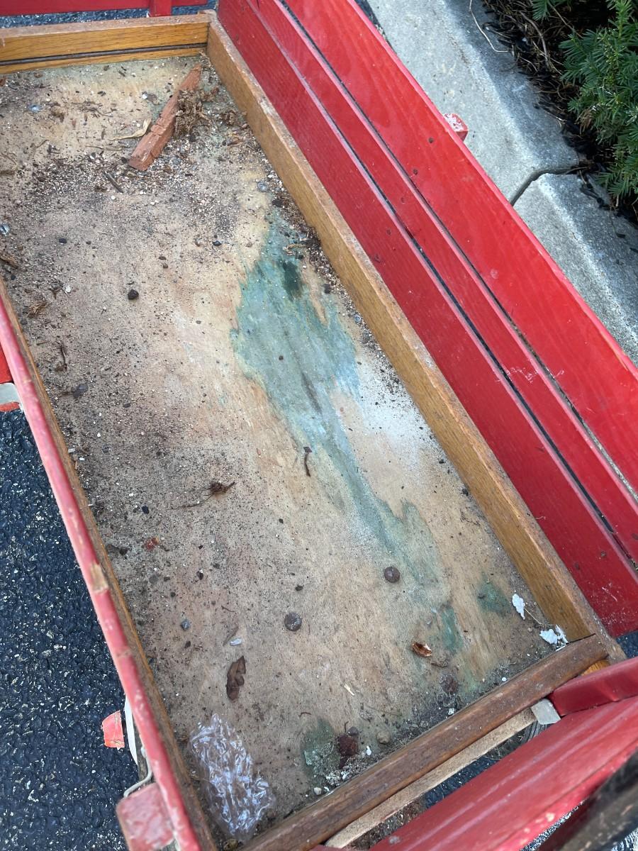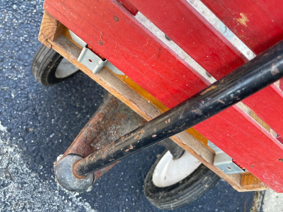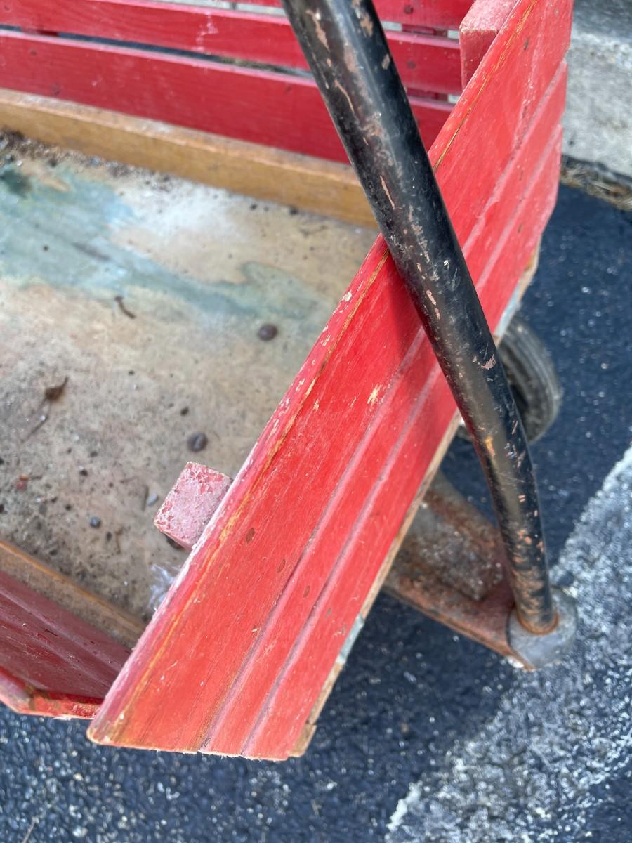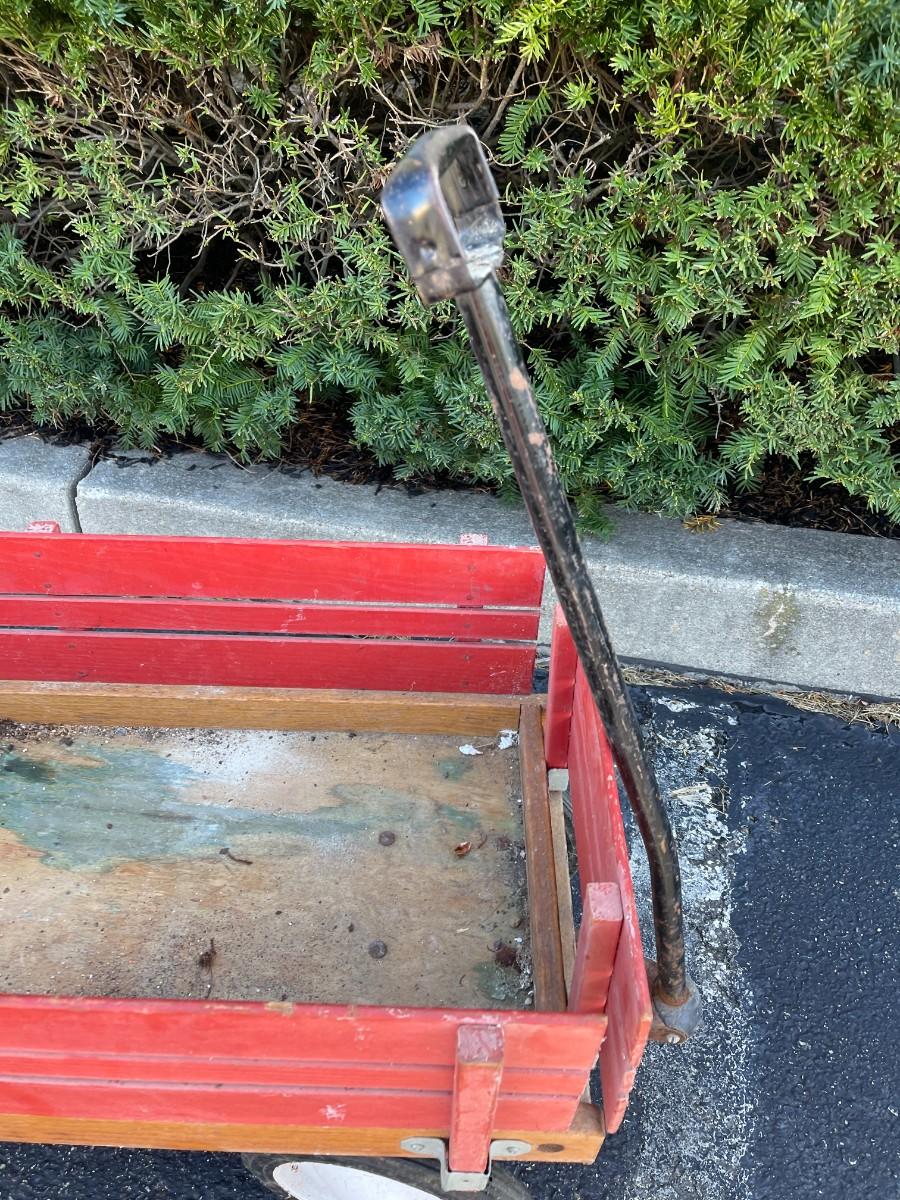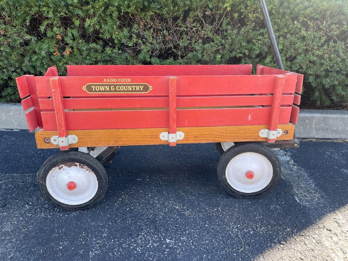 Radio Flyer Town & Country red wagon. Shows some wear, has some rust on the metal at base of handle. Approx 3' x 15" x 20"