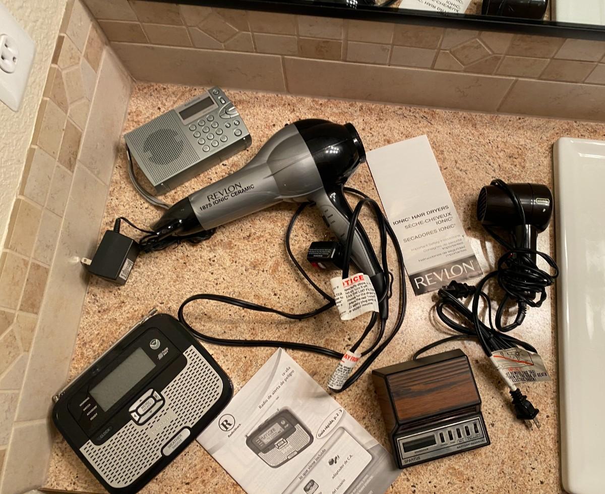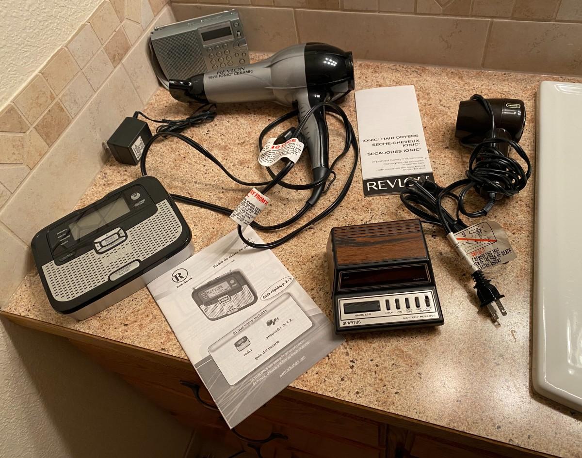 RADIO SHACK WEATHER AND TRAVEL RADIOS, LIKE NEW BLOW DRYERS, AND ALARM CLOCK