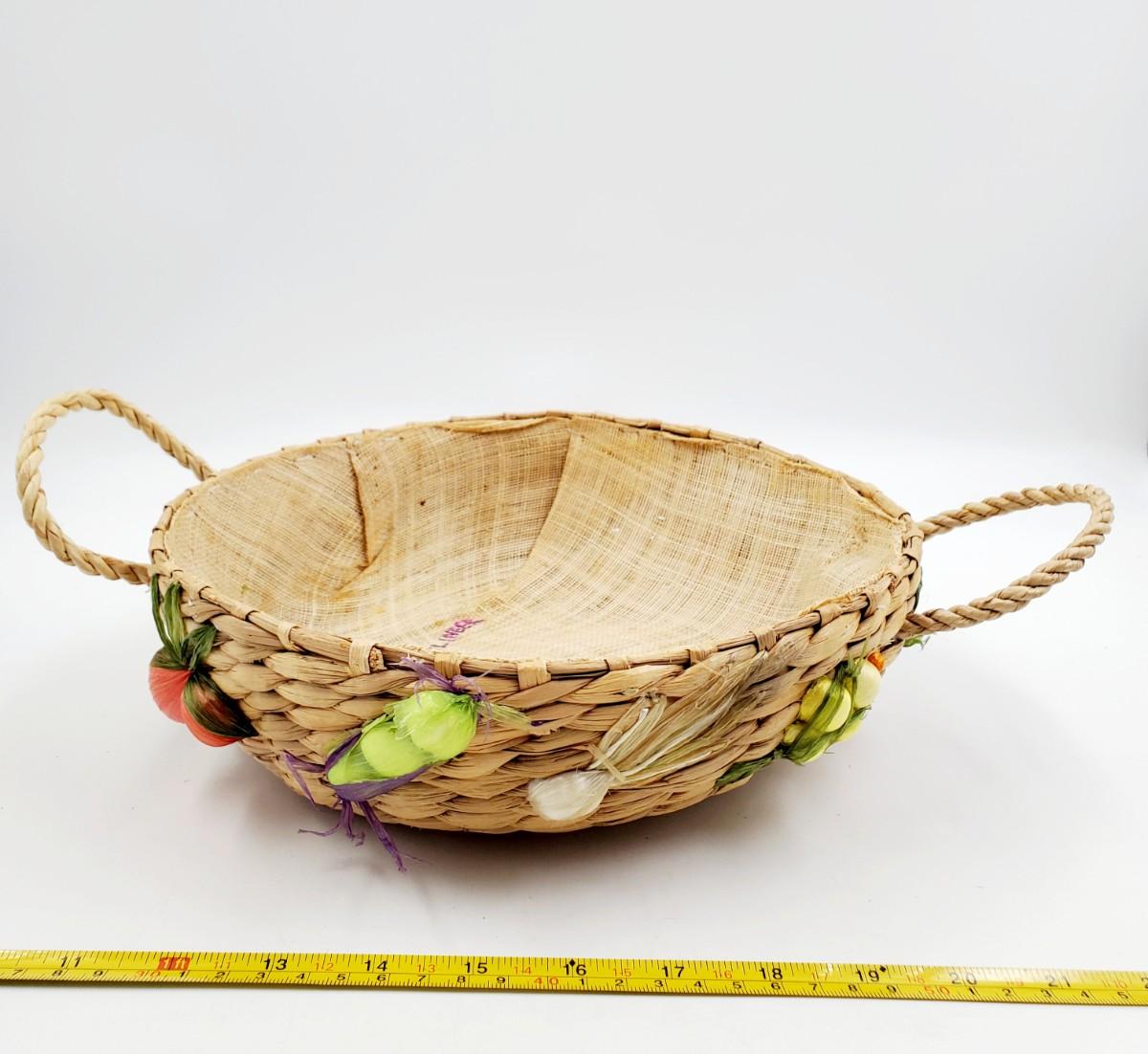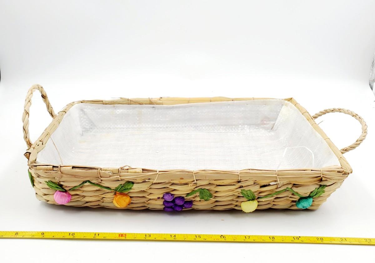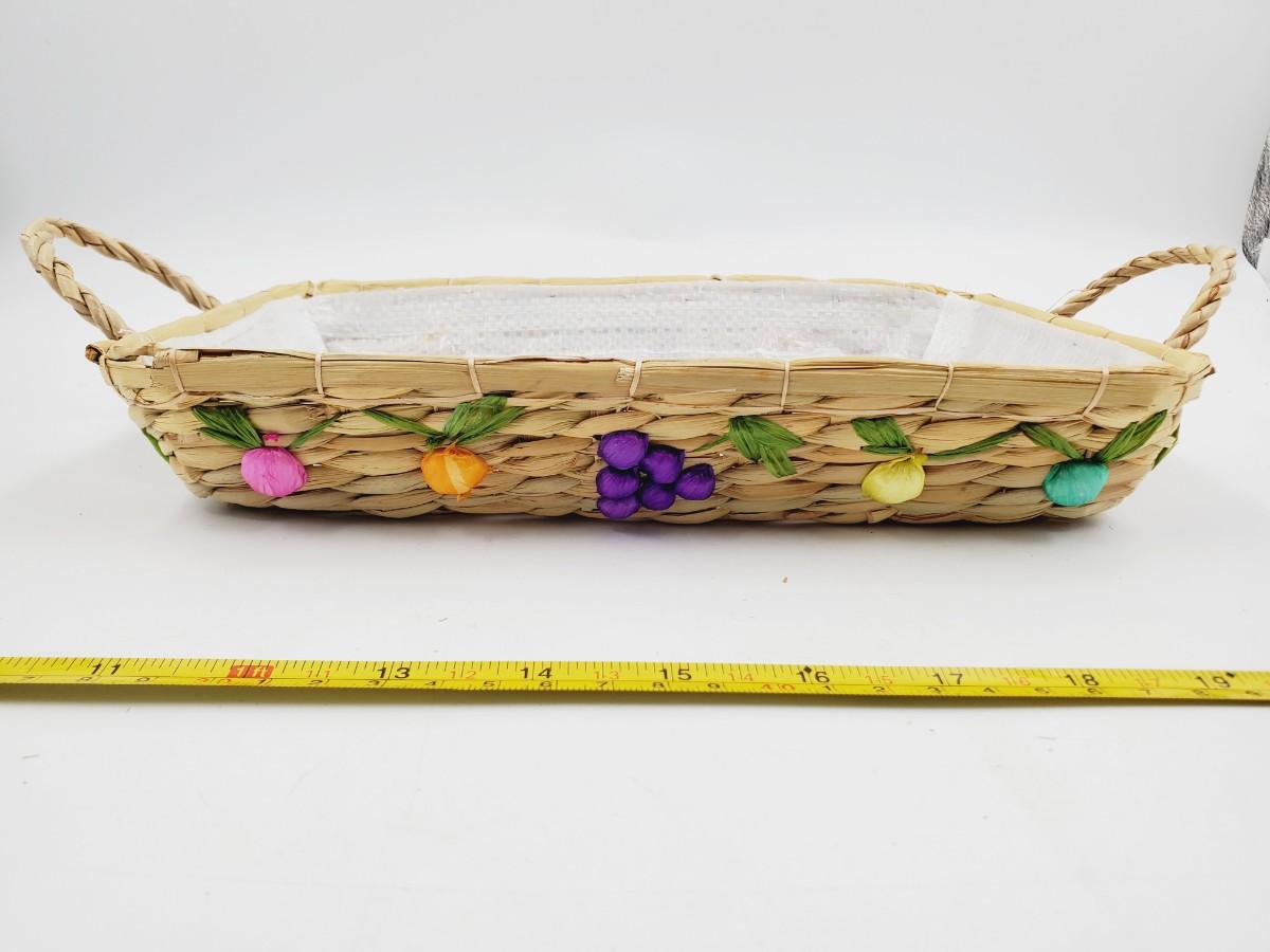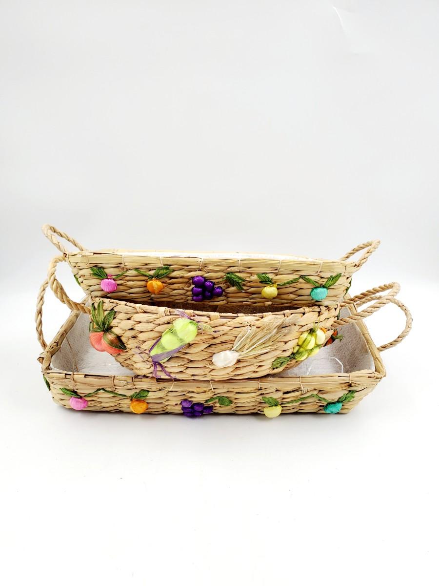 2 rectangular baskets lined with plastic, pretty colored rafia fruit around the outside of the baskets. Round burlap lined basket with pretty raffia vegetables decorating the outer basket. Good condition
