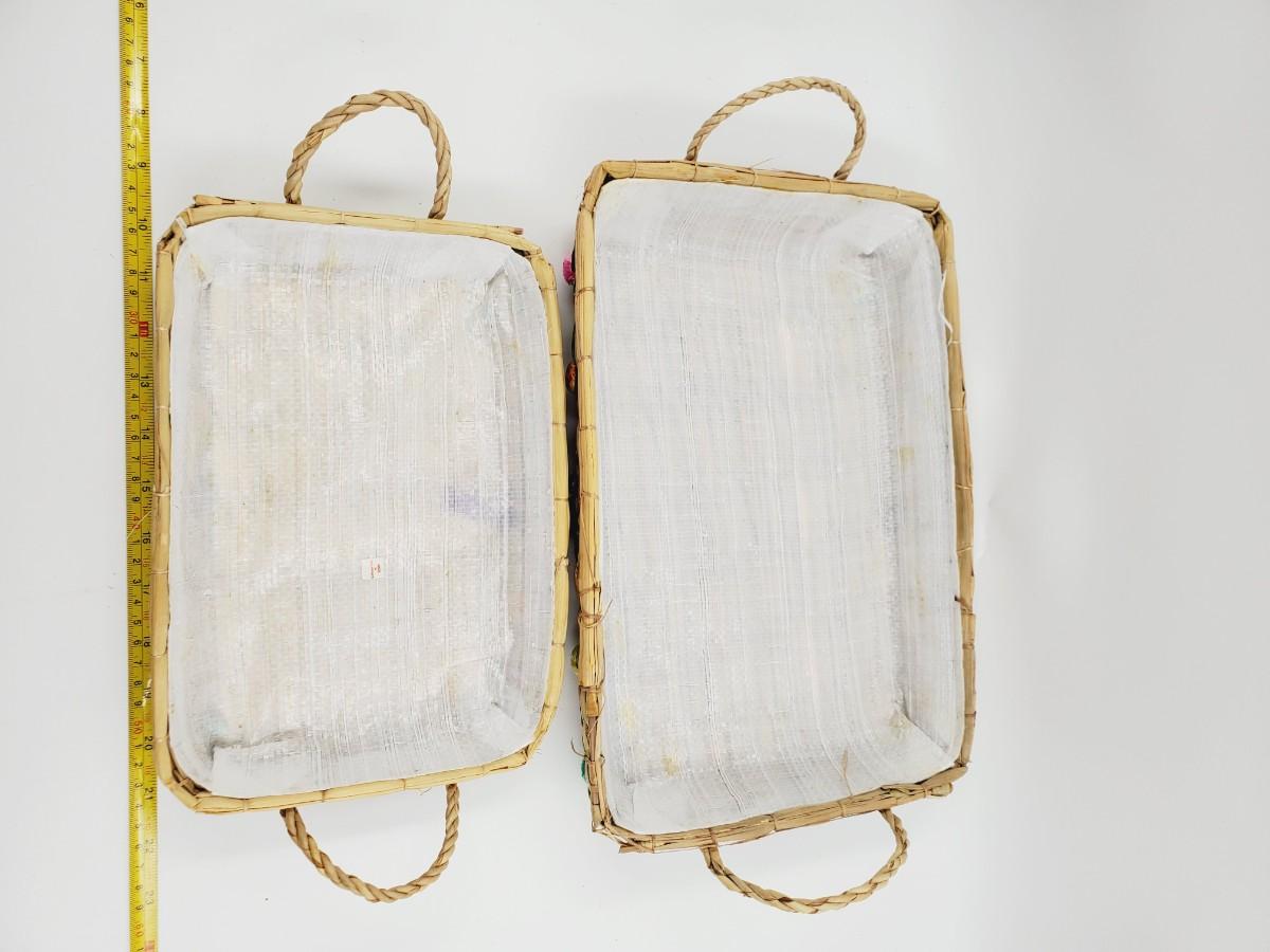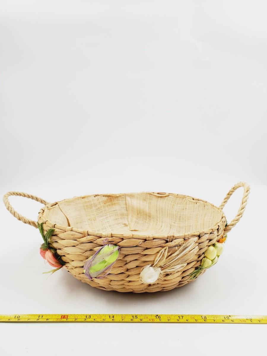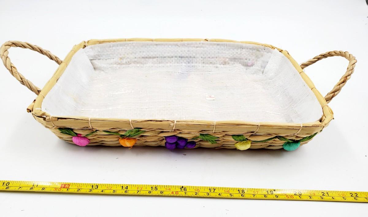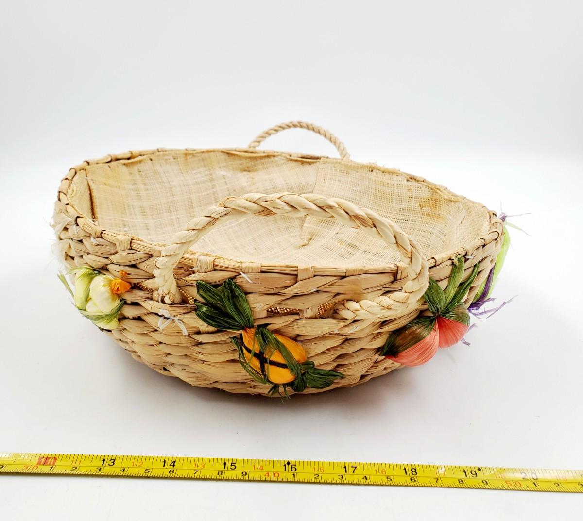 2 rectangular baskets lined with plastic, pretty colored rafia fruit around the outside of the baskets. Round burlap lined basket with pretty raffia vegetables decorating the outer basket. Good condition